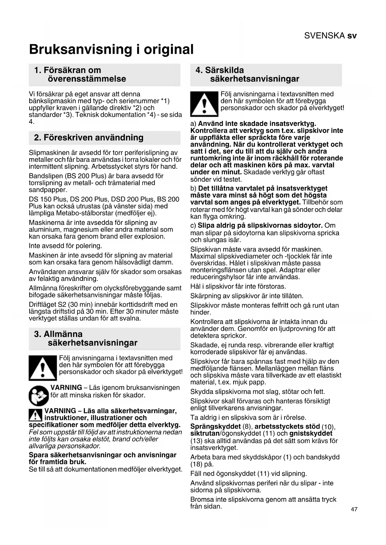 Slipmaskinen är avsedd för torr periferislipning av metaller och får bara användas i torra lokaler och för intermittent slipning. Arbetsstycket styrs för hand. Bandslipen (BS 200 Plus) är bara avsedd för torrslipning av metall- och trämaterial med sandpapper. DS 150 Plus, DS 200 Plus, DSD 200 Plus, BS 200 Plus kan också utrustas (på vänster sida) med lämpliga Metabo-stålborstar (medföljer ej). Maskinerna är inte avsedda för slipning av aluminium, magnesium eller andra material som kan orsaka fara genom brand eller explosion. Inte avsedd för polering. Maskinen är inte avsedd för slipning av material som kan orsaka fara genom hälsovådligt damm. Användaren ansvarar själv för skador som orsakas av felaktig användning. Allmänna föreskrifter om olycksförebyggande samt bifogade säkerhetsanvisningar måste följas. Driftläget S2 (30 min) innebär korttidsdrift med en längsta driftstid på 30 min. Efter 30 minuter måste verktyget ställas undan för att svalna. Följ anvisningarna i textavsnitten med den här symbolen för att förebygga personskador och skador på elverktyget! VARNING – Läs igenom bruksanvisningen för att minska risken för skador. VARNING – Läs alla säkerhetsvarningar, instruktioner, illustrationer och specifikationer som medföljer detta elverktyg. Fel som uppstår till följd av att instruktionerna nedan inte följts kan orsaka elstöt, brand och/eller allvarliga personskador. Spara säkerhetsanvisningar och anvisningar för framtida bruk. Se till så att dokumentationen medföljer elverktyget. Följ anvisningarna i textavsnitten med den här symbolen för att förebygga personskador och skador på elverktyget! a) Använd inte skadade insatsverktyg. Kontrollera att verktyg som t.ex. slipskivor inte är uppfläkta eller spräckta före varje användning. När du kontrollerat verktyget och satt i det, ser du till att du själv och andra runtomkring inte är inom räckhåll för roterande delar och att maskinen körs på max. varvtal under en minut. Skadade verktyg går oftast sönder vid testet. b) Det tillåtna varvtalet på insatsverktyget måste vara minst så högt som det högsta varvtal som anges på elverktyget. Tillbehör som roterar med för högt varvtal kan gå sönder och delar kan flyga omkring. c) Slipa aldrig på slipskivornas sidoytor. Om man slipar på sidoytorna kan slipskivorna spricka och slungas isär. Slipskivan måste vara avsedd för maskinen. Maximal slipskivediameter och -tjocklek får inte överskridas. Hålet i slipskivan måste passa monteringsflänsen utan spel. Adaptrar eller reduceringshylsor får inte användas. Hål i slipskivor får inte förstoras. Skärpning av slipskivor är inte tillåten. Slipskivor måste monteras felfritt och gå runt utan hinder. Kontrollera att slipskivorna är intakta innan du använder dem. Genomför en ljudprovning för att detektera sprickor. Skadade, ej runda resp. vibrerande eller kraftigt korroderade slipskivor får ej användas. Slipskivor får bara spännas fast med hjälp av den medföljande flänsen. Mellanläggen mellan fläns och slipskiva måste vara tillverkade av ett elastiskt material, t.ex. mjuk papp. Skydda slipskivorna mot slag, stötar och fett. Slipskivor skall förvaras och hanteras försiktigt enligt tillverkarens anvisningar. Ta aldrig i en slipskiva som är i rörelse. Sprängskyddet (8), arbetsstyckets stöd (10), siktrutan/ögonskyddet (11) och gnistskyddet (13) ska alltid användas på det sätt som krävs för insatsverktyget. Arbeta bara med skyddskåpor (1) och bandskydd (18) på. Fäll ned ögonskyddet (11) vid slipning. Använd slipskivornas periferi när du slipar - inte sidorna på slipskivorna. Bromsa inte slipskivorna genom att ansätta tryck från sidan.