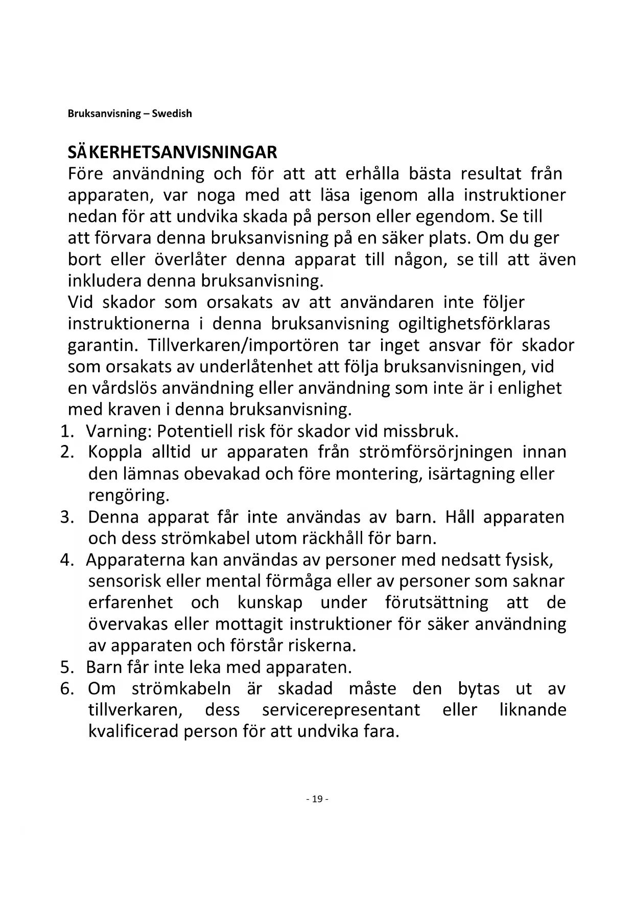 6. Om strömkabeln är skadad måste den bytas ut av
