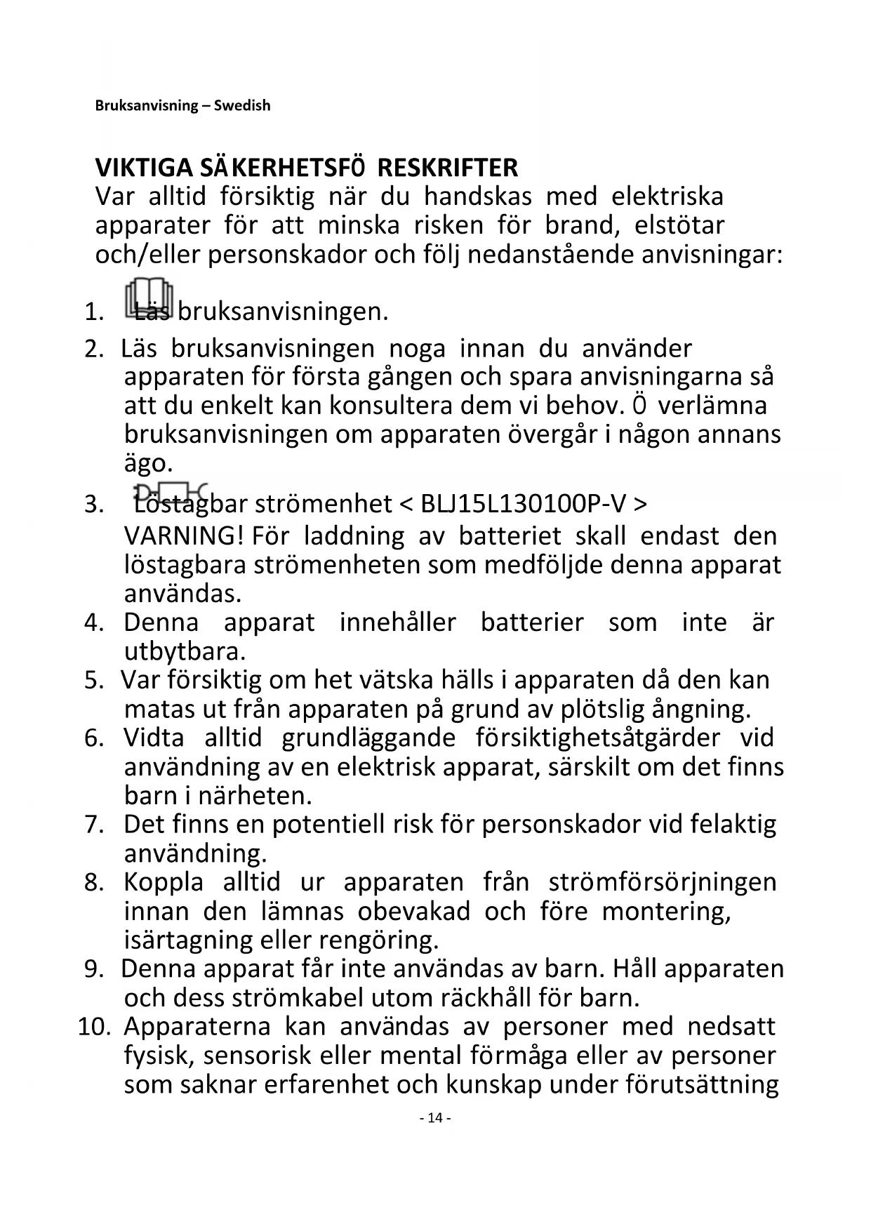 VARNING! För laddning av batteriet skall endast den löstagbara strömenheten som medföljde denna apparat användas.