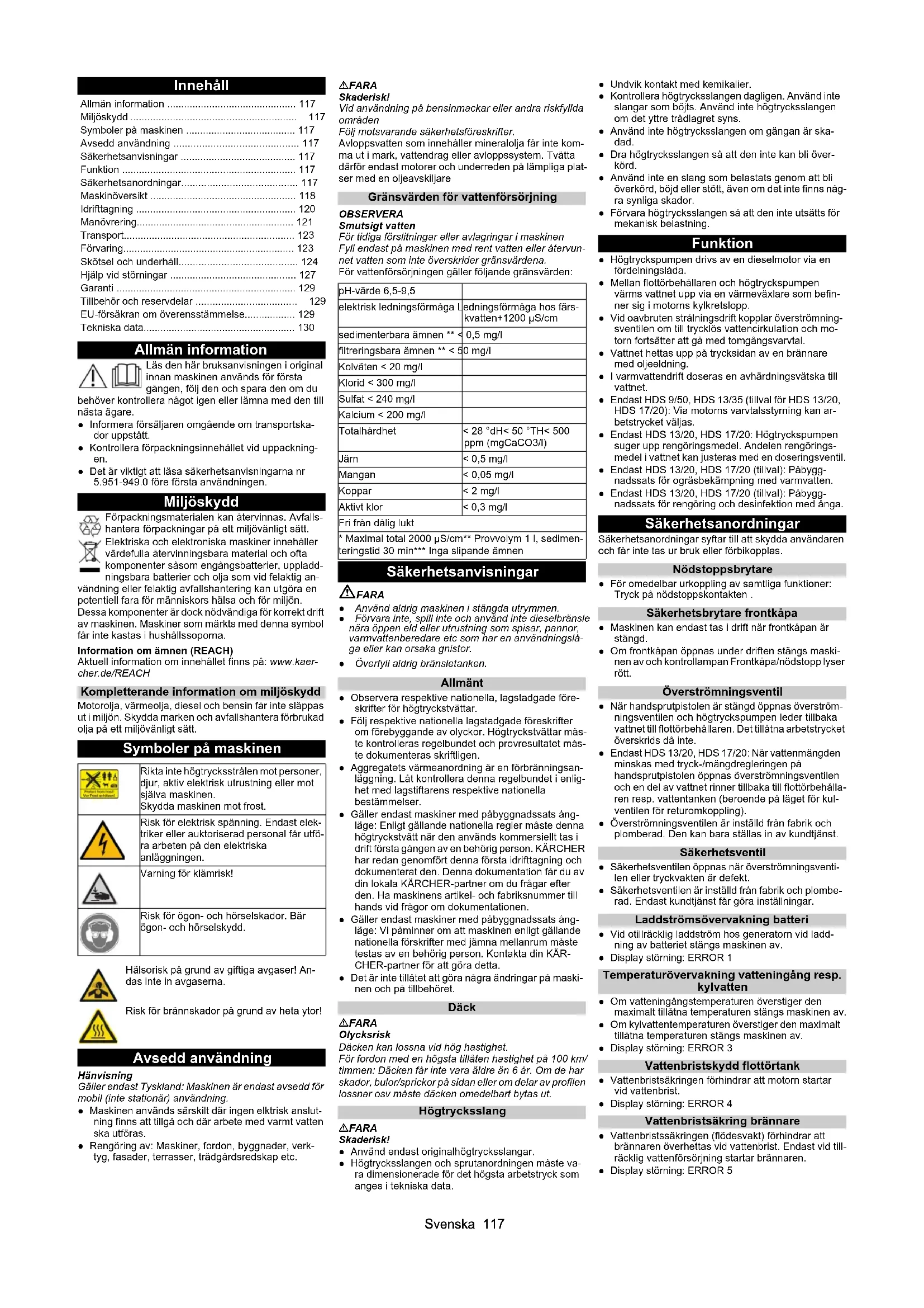• 2,1 2,1 0,85 0,8Svenska 117 Innehåll Allmän information Läs den här bruksanvisningen i original innan maskinen används för första gången, följ den och spara den om du behöver kontrollera något igen eller lämna med den till nästa ägare. ● Informera försäljaren omgående om transportska- dor uppstått. ● Kontrollera förpackningsinnehållet vid uppackning- en. ● Det är viktigt att läsa säkerhetsanvisningarna nr 5.951-949.0 före första användningen. Miljöskydd Förpackningsmaterialen kan återvinnas. Avfalls- hantera förpackningar på ett miljövänligt sätt. Elektriska och elektroniska maskiner innehåller värdefulla återvinningsbara material och ofta komponenter såsom engångsbatterier, uppladd- ningsbara batterier och olja som vid felaktig an- vändning eller felaktig avfallshantering kan utgöra en potentiell fara för människors hälsa och för miljön. Dessa komponenter är dock nödvändiga för korrekt drift av maskinen. Maskiner som märkts med denna symbol får inte kastas i hushållssoporna. Information om ämnen (REACH) Aktuell information om innehållet finns på: www.kaer- cher.de/REACH Kompletterande information om miljöskydd Motorolja, värmeolja, diesel och bensin får inte släppas ut i miljön. Skydda marken och avfallshantera förbrukad olja på ett miljövänligt sätt. Symboler på maskinen Avsedd användning Hänvisning Gäller endast Tyskland: Maskinen är endast avsedd för mobil (inte stationär) användning. ● Maskinen används särskilt där ingen elktrisk anslut- ning finns att tillgå och där arbete med varmt vatten ska utföras. ● Rengöring av: Maskiner, fordon, byggnader, verk- tyg, fasader, terrasser, trädgårdsredskap etc. FARA Skaderisk! Vid användning på bensinmackar eller andra riskfyllda områden Följ motsvarande säkerhetsföreskrifter. Avloppsvatten som innehåller mineralolja får inte kom- ma ut i mark, vattendrag eller avloppssystem. Tvätta därför endast motorer och underreden på lämpliga plat- ser med en oljeavskiljare Gränsvärden för vattenförsörjning OBSERVERA Smutsigt vatten För tidiga förslitningar eller avlagringar i maskinen Fyll endast på maskinen med rent vatten eller återvun- net vatten som inte överskrider gränsvärdena. För vattenförsörjningen gäller följande gränsvärden: Säkerhetsanvisningar FARA ● Använd aldrig maskinen i stängda utrymmen. ● Förvara inte, spill inte och använd inte dieselbränsle nära öppen eld eller utrustning som spisar, pannor, varmvattenberedare etc som har en användningslå- ga eller kan orsaka gnistor. ● Överfyll aldrig bränsletanken. Allmänt ● Observera respektive nationella, lagstadgade före- skrifter för högtryckstvättar. ● Följ respektive nationella lagstadgade föreskrifter om förebyggande av olyckor. Högtryckstvättar mås- te kontrolleras regelbundet och provresultatet mås- te dokumenteras skriftligen. ● Aggregatets värmeanordning är en förbränningsan- läggning. Låt kontrollera denna regelbundet i enlig- het med lagstiftarens respektive nationella bestämmelser. ● Gäller endast maskiner med påbyggnadssats ång- läge: Enligt gällande nationella regler måste denna högtryckstvätt när den används kommersiellt tas i drift första gången av en behörig person. KÄRCHER har redan genomfört denna första idrifttagning och dokumenterat den. Denna dokumentation får du av din lokala KÄRCHER-partner om du frågar efter den. Ha maskinens artikel- och fabriksnummer till hands vid frågor om dokumentationen. ● Gäller endast maskiner med påbyggnadssats ång- läge: Vi påminner om att maskinen enligt gällande nationella förskrifter med jämna mellanrum måste testas av en behörig person. Kontakta din KÄR- CHER-partner för att göra detta. ● Det är inte tillåtet att göra några ändringar på maski- nen och på tillbehöret. Däck FARA Olycksrisk Däcken kan lossna vid hög hastighet. För fordon med en högsta tillåten hastighet på 100 km/ timmen: Däcken får inte vara äldre än 6 år. Om de har skador, bulor/sprickor på sidan eller om delar av profilen lossnar osv måste däcken omedelbart bytas ut. Högtrycksslang FARA Skaderisk! ● Använd endast originalhögtrycksslangar. ● Högtrycksslangen och sprutanordningen måste va- ra dimensionerade för det högsta arbetstryck som anges i tekniska data. ● Undvik kontakt med kemikalier. ● Kontrollera högtrycksslangen dagligen. Använd inte slangar som böjts. Använd inte högtrycksslangen om det yttre trådlagret syns. ● Använd inte högtrycksslangen om gängan är ska- dad. ● Dra högtrycksslangen så att den inte kan bli över- körd. ● Använd inte en slang som belastats genom att bli överkörd, böjd eller stött, även om det inte finns någ- ra synliga skador. ● Förvara högtrycksslangen så att den inte utsätts för mekanisk belastning. Funktion ● Högtryckspumpen drivs av en dieselmotor via en fördelningslåda. ● Mellan flottörbehållaren och högtryckspumpen värms vattnet upp via en värmeväxlare som befin- ner sig i motorns kylkretslopp. ● Vid oavbruten strålningsdrift kopplar överströmning- sventilen om till trycklös vattencirkulation och mo- torn fortsätter att gå med tomgångsvarvtal. ● Vattnet hettas upp på trycksidan av en brännare med oljeeldning. ● I varmvattendrift doseras en avhärdningsvätska till vattnet. ● Endast HDS 9/50, HDS 13/35 (tillval för HDS 13/20, HDS 17/20): Via motorns varvtalsstyrning kan ar- betstrycket väljas. ● Endast HDS 13/20, HDS 17/20: Högtryckspumpen suger upp rengöringsmedel. Andelen rengörings- medel i vattnet kan justeras med en doseringsventil. ● Endast HDS 13/20, HDS 17/20 (tillval): Påbygg- nadssats för ogräsbekämpning med varmvatten. ● Endast HDS 13/20, HDS 17/20 (tillval): Påbygg- nadssats för rengöring och desinfektion med ånga. Säkerhetsanordningar Säkerhetsanordningar syftar till att skydda användaren och får inte 