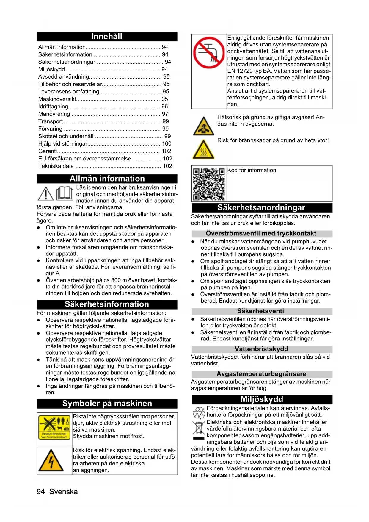 - HDS 7/16 CXA94 Svenska Innehåll Allmän information Läs igenom den här bruksanvisningen i original och medföljande säkerhetsinfor- mation innan du använder din apparat första gången. Följ anvisningarna. Förvara båda häftena för framtida bruk eller för nästa ägare. ● Om inte bruksanvisningen och säkerhetsinformatio- nen beaktas kan det uppstå skador på apparaten och risker för användaren och andra personer. ● Informera försäljaren omgående om transportska- dor uppstått. ● Kontrollera vid uppackningen att inga tillbehör sak- nas eller är skadade. För leveransomfattning, se fi- gur A. ● Över en arbetshöjd på ca 800 m över havet, kontak- ta din återförsäljare för att anpassa brännarinställ- ningen till höjden och den reducerade syrehalten. Säkerhetsinformation För maskinen gäller följande säkerhetsinformation: ● Observera respektive nationella, lagstadgade före- skrifter för högtryckstvättar. ● Observera respektive nationella, lagstadgade olycksförebyggande föreskrifter. Högtryckstvättar måste testas regelbundet och provresultatet måste dokumenteras skriftligen. ● Tänk på att maskinens uppvärmningsanordning är en förbränningsanläggning. Förbränningsanlägg- ningar måste testas regelbundet enligt gällande na- tionella, lagstadgade föreskrifter. ● Inga ändringar får göras på maskinen och tillbehö- ren. Symboler på maskinen Säkerhetsanordningar Säkerhetsanordningar syftar till att skydda användaren och får inte tas ur bruk eller förbikopplas. Överströmsventil med tryckkontakt ● När du minskar vattenmängden vid pumphuvudet öppnas överströmsventilen och en del av vattnet rin- ner tillbaka till pumpens sugsida. ● Om spolhandtaget är stängt så att allt vatten rinner tillbaka till pumpens sugsida stänger tryckkontakten på överströmsventilen av pumpen. ● Om spolhandtaget öppnas igen slås tryckkontakten på pumpen på igen. ● Överströmsventilen är inställd från fabrik och plom- berad. Endast kundtjänst får göra inställningar. Säkerhetsventil ● Säkerhetsventilen öppnas när överströmningsventi- len eller tryckvakten är defekt. ● Säkerhetsventilen är inställd från fabrik och plombe- rad. Endast kundtjänst får göra inställningar. Vattenbristskydd Vattenbristskyddet förhindrar att brännaren slås på vid vattenbrist. Avgastemperaturbegränsare Avgastemperaturbegränsaren stänger av maskinen när avgastemperaturen är för hög. Miljöskydd Förpackningsmaterialen kan återvinnas. Avfalls- hantera förpackningar på ett miljövänligt sätt. Elektriska och elektroniska maskiner innehåller värdefulla återvinningsbara material och ofta komponenter såsom engångsbatterier, uppladd- ningsbara batterier och olja som vid felaktig an- vändning eller felaktig avfallshantering kan utgöra en potentiell fara för människors hälsa och för miljön. Dessa komponenter är dock nödvändiga för korrekt drift av maskinen. Maskiner som märkts med denna symbol får inte kastas i hushållssoporna. Allmän information p. 94