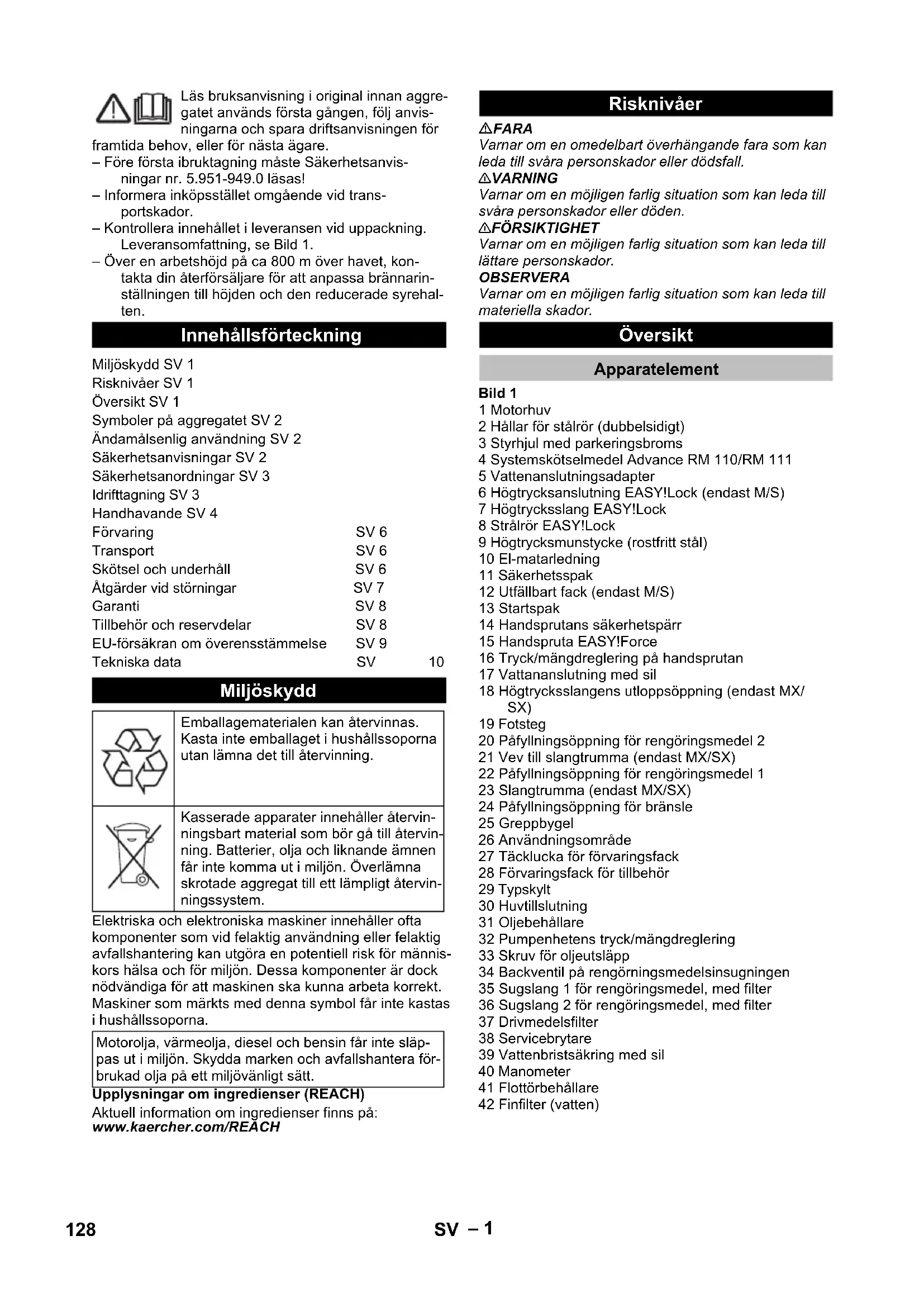 1,0 1,0 Driftsmidler Drivstoff -- Fyringsolje EL eller diesel Fyringsolje EL eller diesel Oljemengde l 1,0 1,0 Oljetyper -- SAE 90 SAE 90 Mål og vekt Lengde x bredde x høyde mm 1330 x 750 x 1060 1330 x 750 x 1060 Typisk driftsvekt, S kg 200 200 Typisk driftsvekt, SX kg 205 205 Drivstofftank l 25 25 Rengjøringsmiddel-tank l 10+20 10+20 127NO– 1 Läs bruksanvisning i original innan aggre- gatet används första gången, följ anvis- ningarna och spara driftsanvisningen för framtida behov, eller för nästa ägare. – Före första ibruktagning måste Säkerhetsanvis- ningar nr. 5.951-949.0 läsas! – Informera inköpsstället omgående vid trans- portskador. – Kontrollera innehållet i leveransen vid uppackning. Leveransomfattning, se Bild 1. – Över en arbetshöjd på ca 800 m över havet, kon- takta din återförsäljare för att anpassa brännarin- ställningen till höjden och den reducerade syrehal- ten. Elektriska och elektroniska maskiner innehåller ofta komponenter som vid felaktig användning eller felaktig avfallshantering kan utgöra en potentiell risk för männis- kors hälsa och för miljön. Dessa komponenter är dock nödvändiga för att maskinen ska kunna arbeta korrekt. Maskiner som märkts med denna symbol får inte kastas i hushållssoporna. Upplysningar om ingredienser (REACH) Aktuell information om ingredienser finns på: www.kaercher.com/REACH FARA Varnar om en omedelbart överhängande fara som kan leda till svåra personskador eller dödsfall. 몇 VARNING Varnar om en möjligen farlig situation som kan leda till svåra personskador eller döden. 몇 FÖRSIKTIGHET Varnar om en möjligen farlig situation som kan leda till lättare personskador. OBSERVERA Varnar om en möjligen farlig situation som kan leda till materiella skador. Bild 1 1 Motorhuv 2 Hållar för stålrör (dubbelsidigt) 3 Styrhjul med parkeringsbroms 4 Systemskötselmedel Advance RM 110/RM 111 5 Vattenanslutningsadapter 6 Högtrycksanslutning EASY!Lock (endast M/S) 7 Högtrycksslang EASY!Lock 8 Strålrör EASY!Lock 9 Högtrycksmunstycke (rostfritt stål) 10 El-matarledning 11 Säkerhetsspak 12 Utfällbart fack (endast M/S) 13 Startspak 14 Handsprutans säkerhetspärr 15 Handspruta EASY!Force 16 Tryck/mängdreglering på handsprutan 17 Vattananslutning med sil 18 Högtrycksslangens utloppsöppning (endast MX/ SX) 19 Fotsteg 20 Påfyllningsöppning för rengöringsmedel 2 21 Vev till slangtrumma (endast MX/SX) 22 Påfyllningsöppning för rengöringsmedel 1 23 Slangtrumma (endast MX/SX) 24 Påfyllningsöppning för bränsle 25 Greppbygel 26 Användningsområde 27 Täcklucka för förvaringsfack 28 Förvaringsfack för tillbehör 29 Typskylt 30 Huvtillslutning 31 Oljebehållare 32 Pumpenhetens tryck/mängdreglering 33 Skruv för oljeutsläpp 34 Backventil på rengörningsmedelsinsugningen 35 Sugslang 1 för rengöringsmedel, med filter 36 Sugslang 2 för rengöringsmedel, med filter 37 Drivmedelsfilter 38 Servicebrytare 39 Vattenbristsäkring med sil 40 Manometer 41 Flottörbehållare 42 Finfilter (vatten) Innehållsförteckning Miljöskydd SV 1 Risknivåer SV 1 Översikt SV 1 Symboler på aggregatet SV 2 Ändamålsenlig användning SV 2 Säkerhetsanvisningar SV 2 Säkerhetsanordningar SV 3 Idrifttagning SV 3 Handhavande SV 4 Förvaring SV 6 Transport SV 6 Skötsel och underhåll SV 6 Åtgärder vid störningar SV 7 Garanti SV 8 Tillbehör och reservdelar SV 8 EU-försäkran om överensstämmelse SV 9 Tekniska data SV 10 Miljöskydd Emballagematerialen kan återvinnas. Kasta inte emballaget i hushållssoporna utan lämna det till återvinning. Kasserade apparater innehåller återvin- ningsbart material som bör gå till återvin- ning. Batterier, olja och liknande ämnen får inte komma ut i miljön. Överlämna skrotade aggregat till ett lämpligt återvin- ningssystem. Motorolja, värmeolja, diesel och bensin får inte släp- pas ut i miljön. Skydda marken och avfallshantera för- brukad olja på ett miljövänligt sätt. Risknivåer Översikt Apparatelement 128 SV– 2 Bild 2 A Huvudreglage B Temperaturregulator C Doseringsventil för rengöringsmedel 1 Driftsätt: Drift med varmvatten 2 Driftsätt: Eco-drift (varmvatten max. 60 °C) 3 Driftsätt: Drift med varmvatten/ånga 4 Kontrollampa - Pump 5 Kontrollampa rotationsriktning (ej HDS 7/9, HDS 7/ 10, HDS 7/12) 6 Kontrollampa för aggregat driftsklar 7 Kontrollampa bränsle 8 Kontrollampa rengöringsmedel 1 (endast HDS 12/ 18, HDS 13/20) 9 Kontrollampa motor 10 Kontrollampa Störning brännare 11 Kontrollampa - Service 12 Kontrollampa - Systemskötselmedel 13 Kontrollampa rengöringsmedel 2 (endast HDS 12/ 18, HDS 13/20) – Manöverelement för rengöringsprocessen är gula. – Manöverelement för underhåll och service är ljus- grå. Högtrycksstrålar kan vid felaktig använd- ning vara farliga. Strålen får inte riktas mot människor, djur, aktiv elektrisk utrustning eller mot själva aggregatet. Rengöring av: maskiner, fordon, byggnadsverk, verk- tyg, fassader, terrasser, trädgårdsredskap etc. FARA Skaderisk! Vid användning på bensinmackar eller andra riskfyllda områden måste gällande säkerhetsföreskrifter följas. Krav på vattenkvaliteten: OBSERVERA Endast rent vatten får användas som högtrycksmedium. Smuts orsakar slitage eller avlagringar i maskinen eller i tillbehören. Om återvinningsvatten används får följande gränsvär- den inte överskridas. – Beakta lagstadgade, nationella föreskrifter för hög- tryckstvättar. – Beakta gällande, nationella regelverk för olycks- fallsskydd. Högtryckstvättar måste kontrolleras re- gelbundet och kontrollresultatet måste noteras skriftligt. – Aggregatets uppvärmningsanordning är en för- bränningsanläggning. Förbränningsanläggningar måste kontrolleras regelbundet och i enlighet med gällande, nationella regelverk. – Vid yrkesmässig användning måste den första idrifttagningen av högtryckstvätten utföras av en behörig person enligt gälla