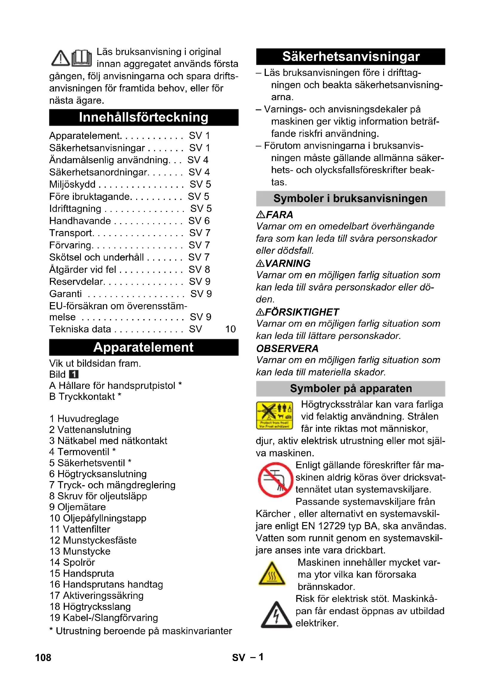 • Utrustning beroende på maskinvarianter – Läs bruksanvisningen före i drifttag- ningen och beakta säkerhetsanvisning- arna. – Varnings- och anvisningsdekaler på maskinen ger viktig information beträf- fande riskfri användning. – Förutom anvisningarna i bruksanvis- ningen måste gällande allmänna säker- hets- och olycksfallsföreskrifter beak- tas. FARA Varnar om en omedelbart överhängande fara som kan leda till svåra personskador eller dödsfall. 몇 VARNING Varnar om en möjligen farlig situation som kan leda till svåra personskador eller dö- den. 몇 FÖRSIKTIGHET Varnar om en möjligen farlig situation som kan leda till lättare personskador. OBSERVERA Varnar om en möjligen farlig situation som kan leda till materiella skador. Högtrycksstrålar kan vara farliga vid felaktig användning. Strålen får inte riktas mot människor, djur, aktiv elektrisk utrustning eller mot själ- va maskinen. Enligt gällande föreskrifter får ma- skinen aldrig köras över dricksvat- tennätet utan systemavskiljare. Passande systemavskiljare från Kärcher , eller alternativt en systemavskil- jare enligt EN 12729 typ BA, ska användas. Vatten som runnit genom en systemavskil- jare anses inte vara drickbart. Maskinen innehåller mycket var- ma ytor vilka kan förorsaka brännskador. Risk för elektrisk stöt. Maskinkå- pan får endast öppnas av utbildad elektriker. Innehållsförteckning Apparatelement. . . . . . . . . . . . SV 1 Säkerhetsanvisningar . . . . . . . SV 1 Ändamålsenlig användning. . . SV 4 Säkerhetsanordningar. . . . . . . SV 4 Miljöskydd . . . . . . . . . . . . . . . . SV 5 Före ibruktagande. . . . . . . . . . SV 5 Idrifttagning . . . . . . . . . . . . . . . SV 5 Handhavande . . . . . . . . . . . . . SV 6 Transport. . . . . . . . . . . . . . . . . SV 7 Förvaring. . . . . . . . . . . . . . . . . SV 7 Skötsel och underhåll . . . . . . . SV 7 Åtgärder vid fel . . . . . . . . . . . . SV 8 Reservdelar. . . . . . . . . . . . . . . SV 9 Garanti . . . . . . . . . . . . . . . . . . SV 9 EU-försäkran om överensstäm- melse . . . . . . . . . . . . . . . . . . . SV 9 Tekniska data . . . . . . . . . . . . . SV 10 Apparatelement Säkerhetsanvisningar Symboler i bruksanvisningen Symboler på apparaten 108 SV– 2 – Angiven spänning på typskylten måste stämma överens med vägguttagets spän- ning. – Nätuttagets lägsta säkring (se Tekniska data). – Skyddsklass I - Aggregat får enbart an- slutas till korrekt jordade eluttag. – Det rekommenderas att aggregatet en- dast ansluts till eluttag som är uppsäk- rat med en 30 mA jordfelsbrytare. – Av tillverkaren föreskriven nätkabel skall användas; detta gäller även vid kabelbyte. Beställningsnr. och modell, se bruksanvisning. – Kontrollera, före varje användningstill- fälle, att nätkabeln och nätkontakten inte är skadade. Skadade nätkablar ska genast bytas ut av auktoriserad kund- service eller en utbildad elektriker. – Aggregatet får endast anslutas till ett nätuttag som installerats av en elektri- ker enligt IEC 60364-1. – Tillkoppling av aggregatet leder till kort- variga spänningssämkningar. – Vid ogynnsamma nätförhållanden kan störningar på andra apparater uppträda. – Vidrör aldrig nätkabeln med våta händer. – Se till att inga skador uppkommer på nät eller förlängningskabar genom överkörning, klämning, dragning eller liknande. Skydda kabeln mot stark vär- me, olja och vassa kanter. – Förlängningskabeln måste ha det tvär- snitt som anges i bruksanvisningen samt vara stänkvattenskyddad. Anslut- ningen får inte ligga i vatten. – Nätkontakt och kopplingar på förläng- ningsledningar måste vara vattentäta och får ej ligga i vatten. Kopplingen får inte heller ligga på marken. Det rekom- menderas att man använder en kabel- trumma som säkerställer att eluttagen befinner sig minst 60 mm över marken. – Olämpliga elektriska förlängningskablar kan vara farliga. Använd endast tillåtna elektriska förlängningskablar utomhus, med motsvarande märkning och med tillräckligt tvärsnitt. – Nätkabeln ska kontrolleras regelbundet så att inga skador finns på den, t.ex sprickor eller åldersskador Om en ska- da upptäcks måste kabeln bytas ut inn- an vidare användning. – Vid utbyte av kopplingar på nätanslut- nings- eller förlängningskablar måste du se till att sprutvattenskydd och me- kanisk fasthet garanteras. – Maskinen får inte rengöras med slang eller högtryckstvätt (risk för kortslutning eller andra skador). – Använd inte aggregatet vid temperatu- rer under 0 °C. – Beakta vattenleverantörens föreskrifter. – Skruvanslutningar till alla slanganslut- ningar måste vara täta. – Högtrycksslangen får inte vara skadad. En skadad högtrycksslang måste om- gående bytas ut. Endast av tillverkaren rekommenderade slangar och anslut- ningar får användas. Beställningsnr., se bruksanvisning. – Kontrollera maskinen och arbetsanord- ningarnas föreskriftsenliga tillstånd och driftssäkerhet före användningen. Använd inte maskinen om en anslut- ningsledning eller viktiga maskindelar är skadade, t.ex. säkerhetsanordning- ar, högtrycksslangar eller handsprutor. – Sug aldrig upp vätskor som innehåller lösningsmedel eller outspädda syror och lösningsmedel! Hit räknas bl.a. bensin, tinner eller eldningsolja. Ångan är lättantändlig, explosiv och giftig. An- vänd inte aceton, outspädda syror och lösningsmedel eftersom de angriper de material som använts i aggregatet. – Vid användning av aggregatet i riskom- råden (t.ex. bensinmackar) ska motsva- rande säkerhetsföreskrifter beaktas. Användning av maskinen i utrymmen med explosionsrisk är förbjuden. – Apparaten måste stå på ett jämnt och stabilt underlag. Elanslutning Vattenanslutning Användning 109SV– 3 – Finns det i aggregatets bruksanvisning (Tekniska Data) uppgift om ljudtrycksni- vå på över 80 dB(A) skall hörskydd an-