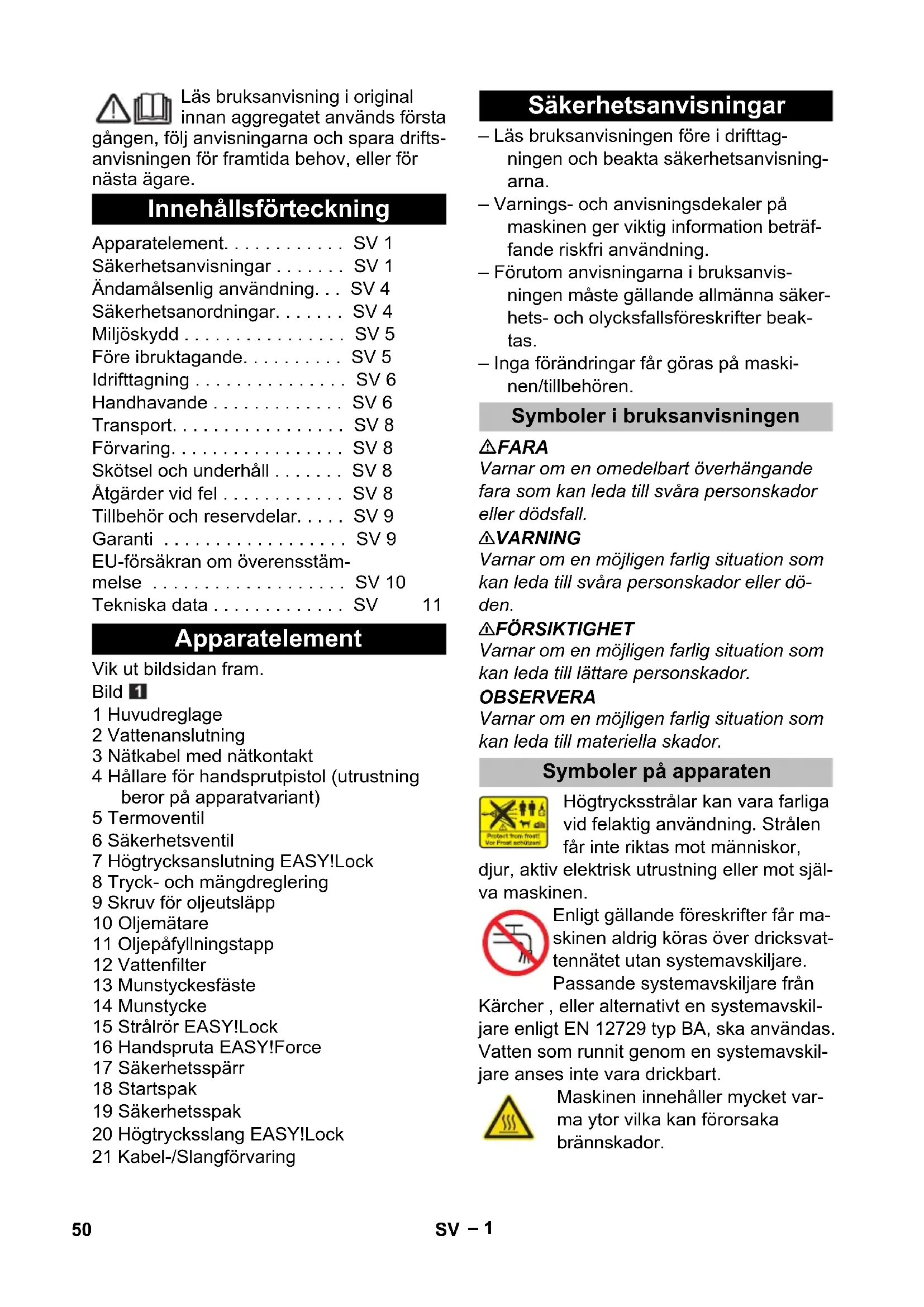 dB(A) 90 Combustibles Cantidad de aceite l 0,4 Tipo de aceite -- 15W40 Medidas y pesos Longitud mm 780 Anchura mm 360 Altura mm 500 Peso, listo para el funcionamiento con accesorios kg 56,5 49ES– 1 Läs bruksanvisning i original innan aggregatet används första gången, följ anvisningarna och spara drifts- anvisningen för framtida behov, eller för nästa ägare. Vik ut bildsidan fram. Bild 1 Huvudreglage 2 Vattenanslutning 3 Nätkabel med nätkontakt 4 Hållare för handsprutpistol (utrustning beror på apparatvariant) 5 Termoventil 6 Säkerhetsventil 7 Högtrycksanslutning EASY!Lock 8 Tryck- och mängdreglering 9 Skruv för oljeutsläpp 10 Oljemätare 11 Oljepåfyllningstapp 12 Vattenfilter 13 Munstyckesfäste 14 Munstycke 15 Strålrör EASY!Lock 16 Handspruta EASY!Force 17 Säkerhetsspärr 18 Startspak 19 Säkerhetsspak 20 Högtrycksslang EASY!Lock 21 Kabel-/Slangförvaring – Läs bruksanvisningen före i drifttag- ningen och beakta säkerhetsanvisning- arna. – Varnings- och anvisningsdekaler på maskinen ger viktig information beträf- fande riskfri användning. – Förutom anvisningarna i bruksanvis- ningen måste gällande allmänna säker- hets- och olycksfallsföreskrifter beak- tas. – Inga förändringar får göras på maski- nen/tillbehören. FARA Varnar om en omedelbart överhängande fara som kan leda till svåra personskador eller dödsfall. 몇 VARNING Varnar om en möjligen farlig situation som kan leda till svåra personskador eller dö- den. 몇 FÖRSIKTIGHET Varnar om en möjligen farlig situation som kan leda till lättare personskador. OBSERVERA Varnar om en möjligen farlig situation som kan leda till materiella skador. Högtrycksstrålar kan vara farliga vid felaktig användning. Strålen får inte riktas mot människor, djur, aktiv elektrisk utrustning eller mot själ- va maskinen. Enligt gällande föreskrifter får ma- skinen aldrig köras över dricksvat- tennätet utan systemavskiljare. Passande systemavskiljare från Kärcher , eller alternativt en systemavskil- jare enligt EN 12729 typ BA, ska användas. Vatten som runnit genom en systemavskil- jare anses inte vara drickbart. Maskinen innehåller mycket var- ma ytor vilka kan förorsaka brännskador. Innehållsförteckning Apparatelement. . . . . . . . . . . . SV 1 Säkerhetsanvisningar . . . . . . . SV 1 Ändamålsenlig användning. . . SV 4 Säkerhetsanordningar. . . . . . . SV 4 Miljöskydd . . . . . . . . . . . . . . . . SV 5 Före ibruktagande. . . . . . . . . . SV 5 Idrifttagning . . . . . . . . . . . . . . . SV 6 Handhavande . . . . . . . . . . . . . SV 6 Transport. . . . . . . . . . . . . . . . . SV 8 Förvaring. . . . . . . . . . . . . . . . . SV 8 Skötsel och underhåll . . . . . . . SV 8 Åtgärder vid fel . . . . . . . . . . . . SV 8 Tillbehör och reservdelar. . . . . SV 9 Garanti . . . . . . . . . . . . . . . . . . SV 9 EU-försäkran om överensstäm- melse . . . . . . . . . . . . . . . . . . . SV 10 Tekniska data . . . . . . . . . . . . . SV 11 Apparatelement Säkerhetsanvisningar Symboler i bruksanvisningen Symboler på apparaten 50 SV– 2 Risk för elektrisk stöt. Maskinkå- pan får endast öppnas av utbildad elektriker. – Angiven spänning på typskylten måste stämma överens med vägguttagets spänning. – Nätuttagets lägsta säkring (se Tekniska data). – Skyddsklass I - Aggregat får enbart an- slutas till korrekt jordade eluttag. – Det rekommenderas att aggregatet en- dast ansluts till eluttag som är uppsäk- rat med en 30 mA jordfelsbrytare. – Av tillverkaren föreskriven nätkabel skall användas; detta gäller även vid kabelbyte. Beställningsnr. och modell, se bruksanvisning. – Kontrollera, före varje användningstill- fälle, att nätkabeln och nätkontakten inte är skadade. Skadade nätkablar ska genast bytas ut av auktoriserad kund- service eller en utbildad elektriker. – Aggregatet får endast anslutas till ett nätuttag som installerats av en elektri- ker enligt IEC 60364-1. – Tillkoppling av aggregatet leder till kort- variga spänningssämkningar. – Vid ogynnsamma nätförhållanden kan störningar på andra apparater uppträda. – Vidrör aldrig nätkabeln med våta händer. – Se till att inga skador uppkommer på nät eller förlängningskabar genom överkörning, klämning, dragning eller liknande. Skydda kabeln mot stark vär- me, olja och vassa kanter. – Förlängningskabeln måste ha det tvär- snitt som anges i bruksanvisningen samt vara stänkvattenskyddad. Anslut- ningen får inte ligga i vatten. – Nätkontakt och kopplingar på förläng- ningsledningar måste vara vattentäta och får ej ligga i vatten. Kopplingen får inte heller ligga på marken. Det rekom- menderas att man använder en kabel- trumma som säkerställer att eluttagen befinner sig minst 60 mm över marken. – Olämpliga elektriska förlängningskablar kan vara farliga. Använd endast tillåtna elektriska förlängningskablar utomhus, med motsvarande märkning och med tillräckligt tvärsnitt. – Nätkabeln ska kontrolleras regelbundet så att inga skador finns på den, t.ex sprickor eller åldersskador Om en ska- da upptäcks måste kabeln bytas ut inn- an vidare användning. – Vid utbyte av kopplingar på nätanslut- nings- eller förlängningskablar måste du se till att sprutvattenskydd och me- kanisk fasthet garanteras. – Maskinen får inte rengöras med slang eller högtryckstvätt (risk för kortslutning eller andra skador). – Använd inte aggregatet vid temperatu- rer under 0 °C. – Beakta vattenleverantörens föreskrifter. – Skruvanslutningar till alla slanganslut- ningar måste vara täta. – Högtrycksslangen får inte vara skadad. En skadad högtrycksslang måste om- gående bytas ut. Endast av tillverkaren rekommenderade slangar och anslut- ningar får användas. Beställningsnr., se bruksanvisning. – Kontrollera maskinen och arbetsanord- ningarnas föreskriftsenliga tillstånd och driftssäkerhet före användningen. Anvä
