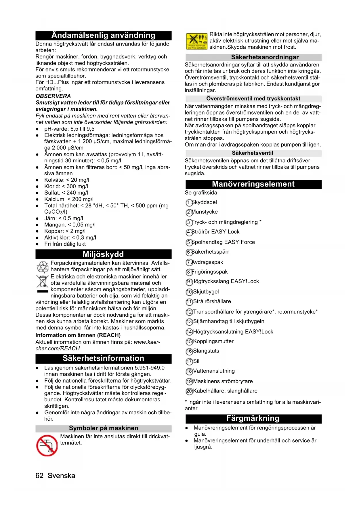 /l) ● Järn: < 0,5 mg/l ● Mangan: < 0,05 mg/l ● Koppar: < 2 mg/l ● Aktivt klor: < 0,3 mg/l ● Fri från dålig lukt Miljöskydd Förpackningsmaterialen kan återvinnas. Avfalls- hantera förpackningar på ett miljövänligt sätt. Elektriska och elektroniska maskiner innehåller ofta värdefulla återvinningsbara material och komponenter såsom engångsbatterier, uppladd- ningsbara batterier och olja, som vid felaktig an- vändning eller felaktig avfallshantering kan utgöra en potentiell risk för människors hälsa och för miljön. Dessa komponenter är dock nödvändiga för att maski- nen ska kunna arbeta korrekt. Maskiner som märkts med denna symbol får inte kastas i hushållssoporna. Information om ämnen (REACH) Aktuell information om ämnen finns på: www.kaer- cher.com/REACH Säkerhetsinformation ● Läs igenom säkerhetsinformationen 5.951-949.0 innan maskinen tas i drift för första gången. ● Följ de nationella föreskrifterna för högtryckstvättar. ● Följ de nationella föreskrifterna för olycksförebyg- gande. Högtryckstvättar måste kontrolleras regel- bundet. Kontrollresultatet måste dokumenteras skriftligen. ● Genomför inte några ändringar av maskin och tillbe- hör. Symboler på maskinen Maskinen får inte anslutas direkt till drickvat- tennätet. Rikta inte högtrycksstrålen mot personer, djur, aktiv elektrisk utrustning eller mot själva ma- skinen.Skydda maskinen mot frost. Säkerhetsanordningar Säkerhetsanordningar syftar till att skydda användaren och får inte tas ur bruk och deras funktion inte kringgås. Överströmsventil, tryckkontakt och säkerhetsventil stäl- las in och plomberas på fabriken. Endast kundtjänst gör inställningar. Överströmsventil med tryckkontakt När vattenmängden minskas med tryck- och mängdreg- leringen öppnas överströmsventilen och en del av vatt- net rinner tillbaka till pumpens sugsida. När avdragsspaken på spolhandtaget släpps kopplar tryckkontakten från högtryckspumpen och högtrycks- strålen stoppas. Om man drar i avdragsspaken kopplas pumpen till igen. Säkerhetsventil Säkerhetsventilen öppnas om det tillåtna driftsöver- trycket överskrids och vattnet rinner tillbaka till pumpens sugsida. Manövreringselement Se grafiksida 1 Skyddsdel 2 Munstycke 3 Tryck- och mängdreglering * 4 Strålrör EASY!Lock 5 Spolhandtag EASY!Force 6 Säkerhetsspärr 7 Avdragsspak 8 Frigöringsspak 9 Högtrycksslang EASY!Lock 10 Skjutbygel 11 Strålrörshållare 12 Transporthållare för ytrengörare*, rotormunstycke* 13 Stjärnhandtag till skjutbygeln 14 Högtrycksanslutning EASY!Lock 15 Kopplingsmutter 16 Slangstuts 17 Sil 18 Vattenanslutning 19 Maskinens strömbrytare 20 Kabelhållare, slanghållare