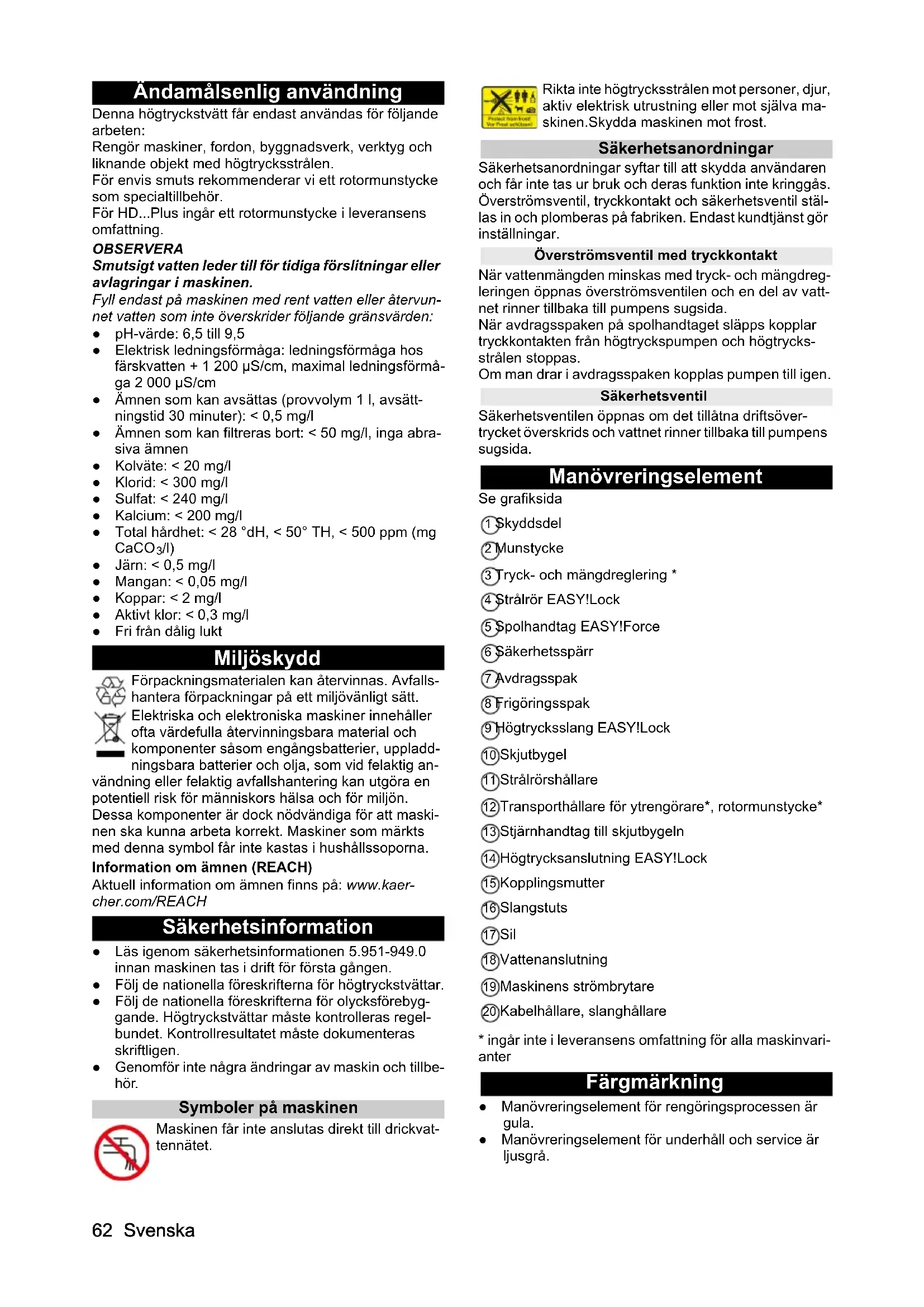 - EU-försäkran om överensstämmelse Svenska Ändamålsenlig användning Denna högtryckstvätt får endast användas för följande arbeten: Rengör maskiner, fordon, byggnadsverk, verktyg och liknande objekt med högtrycksstrålen. För envis smuts rekommenderar vi ett rotormunstycke som specialtillbehör. För HD Plus ingår ett rotormunstycke i leveransens omfattning. OBSERVERA Smutsigt vatten leder till för tidiga förslitningar eller avlagringar i maskinen. Fyll endast på maskinen med rent vatten eller återvun- net vatten som inte överskrider följande gränsvärden: ● pH-värde: 6,5 till 9,5 ● Elektrisk ledningsförmåga: ledningsförmåga hos färskvatten + 1 200 µS/cm, maximal ledningsförmå- ga 2 000 µS/cm ● Ämnen som kan avsättas (provvolym 1 l, avsätt- ningstid 30 minuter): < 0,5 mg/l ● Ämnen som kan filtreras bort: < 50 mg/l, inga abra- siva ämnen ● Kolväte: < 20 mg/l ● Klorid: < 300 mg/l ● Sulfat: < 240 mg/l ● Kalcium: < 200 mg/l ● Total hårdhet: < 28 °dH, < 50° TH, < 500 ppm (mg CaCO p. 6762