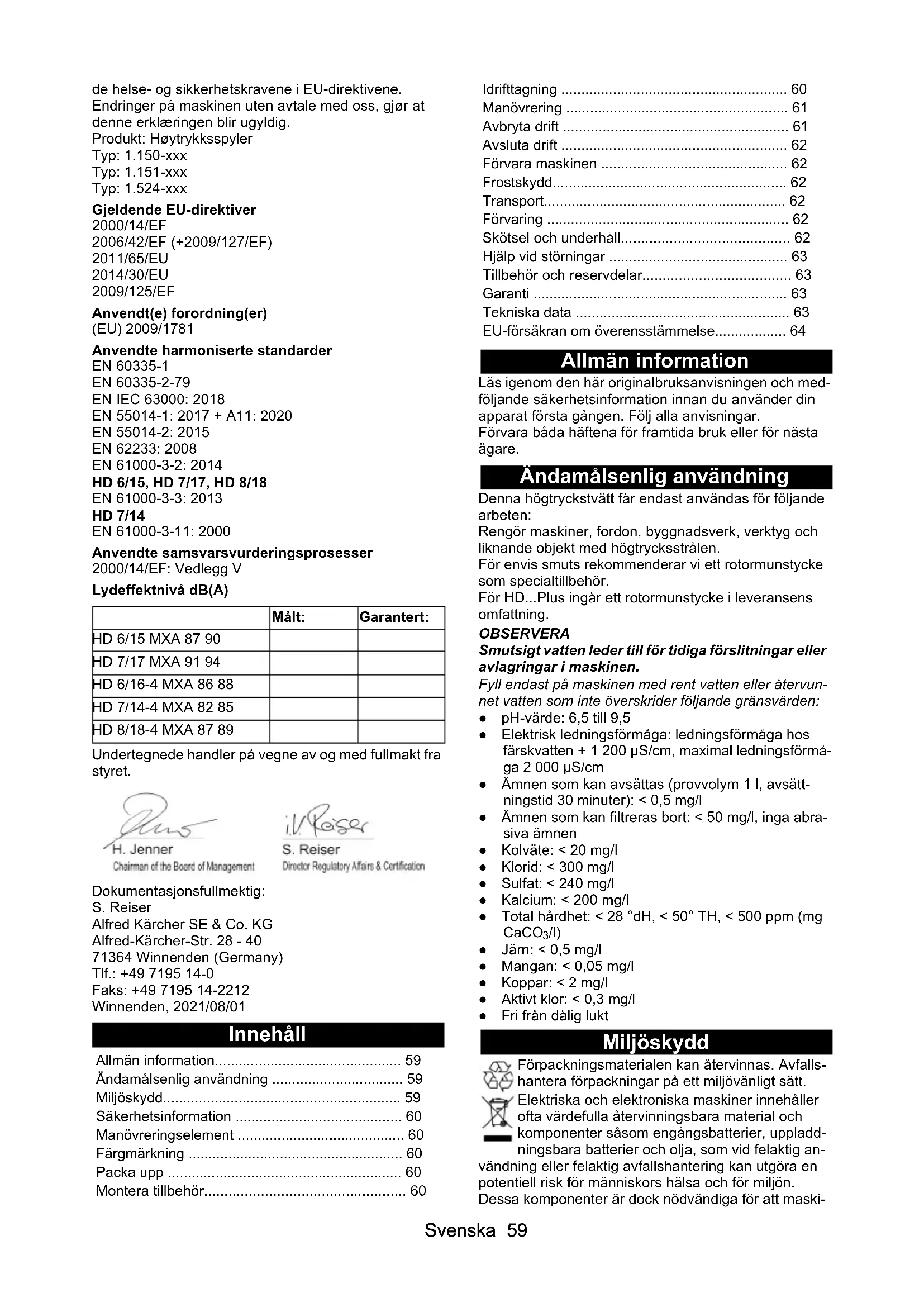 dB(A)90909488858889Svenska 59 de helse- og sikkerhetskravene i EU-direktivene. Endringer på maskinen uten avtale med oss, gjør at denne erklæringen blir ugyldig. Produkt: Høytrykksspyler Typ: 1.150-xxx Typ: 1.151-xxx Typ: 1.524-xxx Gjeldende EU-direktiver 2000/14/EF 2006/42/EF (+2009/127/EF) 2011/65/EU 2014/30/EU 2009/125/EF Anvendt(e) forordning(er) (EU) 2009/1781 Anvendte harmoniserte standarder EN 60335-1 EN 60335-2-79 EN IEC 63000: 2018 EN 55014-1: 2017 + A11: 2020 EN 55014-2: 2015 EN 62233: 2008 EN 61000-3-2: 2014 HD 6/15, HD 7/17, HD 8/18 EN 61000-3-3: 2013 HD 7/14 EN 61000-3-11: 2000 Anvendte samsvarsvurderingsprosesser 2000/14/EF: Vedlegg V Lydeffektnivå dB(A) Undertegnede handler på vegne av og med fullmakt fra styret. Dokumentasjonsfullmektig: S. Reiser Alfred Kärcher SE & Co. KG Alfred-Kärcher-Str. 28 - 40 71364 Winnenden (Germany) Tlf.: +49 7195 14-0 Faks: +49 7195 14-2212 Winnenden, 2021/08/01 Innehåll Allmän information Läs igenom den här originalbruksanvisningen och med- följande säkerhetsinformation innan du använder din apparat första gången. Följ alla anvisningar. Förvara båda häftena för framtida bruk eller för nästa ägare. Ändamålsenlig användning Denna högtryckstvätt får endast användas för följande arbeten: Rengör maskiner, fordon, byggnadsverk, verktyg och liknande objekt med högtrycksstrålen. För envis smuts rekommenderar vi ett rotormunstycke som specialtillbehör. För HD...Plus ingår ett rotormunstycke i leveransens omfattning. OBSERVERA Smutsigt vatten leder till för tidiga förslitningar eller avlagringar i maskinen. Fyll endast på maskinen med rent vatten eller återvun- net vatten som inte överskrider följande gränsvärden: ● pH-värde: 6,5 till 9,5 ● Elektrisk ledningsförmåga: ledningsförmåga hos färskvatten + 1 200 µS/cm, maximal ledningsförmå- ga 2 000 µS/cm ● Ämnen som kan avsättas (provvolym 1 l, avsätt- ningstid 30 minuter): < 0,5 mg/l ● Ämnen som kan filtreras bort: < 50 mg/l, inga abra- siva ämnen ● Kolväte: < 20 mg/l ● Klorid: < 300 mg/l ● Sulfat: < 240 mg/l ● Kalcium: < 200 mg/l ● Total hårdhet: < 28 °dH, < 50° TH, < 500 ppm (mg CaCO