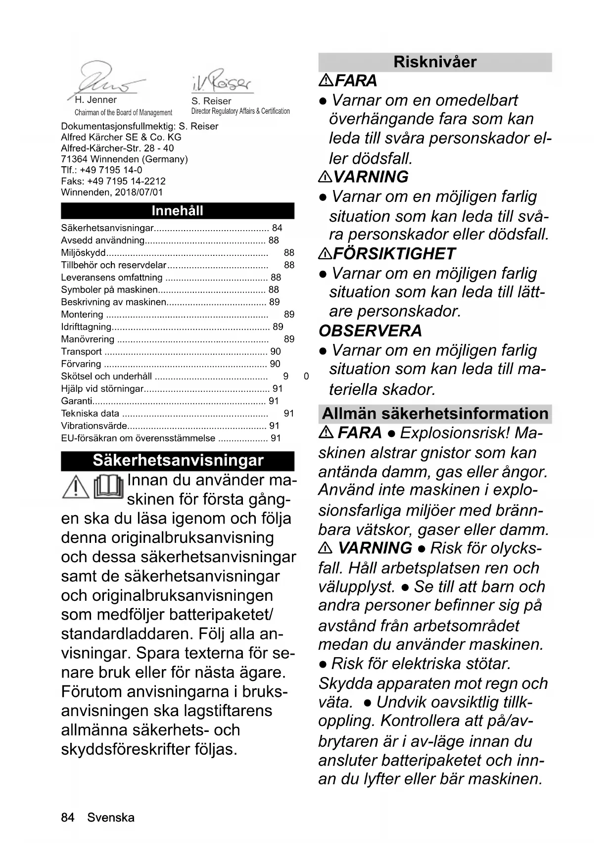 - 3,3 Usikkerhet K dB(A) 1,5 Mål og vekt Lengde x bredde x høyde mm 1474 x 3 46 x 511 Vekt (uten batteripakke) kg 2,884 Svenska Dokumentasjonsfullmektig: S. Reiser Alfred Kärcher SE & Co. KG Alfred-Kärcher-Str. 28 - 40 71364 Winnenden (Germany) Tlf.: +49 7195 14-0 Faks: +49 7195 14-2212 Winnenden, 2018/07/01 Innehåll Säkerhetsanvisningar Innan du använder ma- skinen för första gång- en ska du läsa igenom och följa denna originalbruksanvisning och dessa säkerhetsanvisningar samt de säkerhetsanvisningar och originalbruksanvisningen som medföljer batteripaketet/ standardladdaren. Följ alla an- visningar. Spara texterna för se- nare bruk eller för nästa ägare. Förutom anvisningarna i bruks- anvisningen ska lagstiftarens allmänna säkerhets- och skyddsföreskrifter följas. Risknivåer FARA ● Varnar om en omedelbart överhängande fara som kan leda till svåra personskador el- ler dödsfall. 몇 VARNING ● Varnar om en möjligen farlig situation som kan leda till svå- ra personskador eller dödsfall. 몇 FÖRSIKTIGHET ● Varnar om en möjligen farlig situation som kan leda till lätt- are personskador. OBSERVERA ● Varnar om en möjligen farlig situation som kan leda till ma- teriella skador. Allmän säkerhetsinformation FARA ● Explosionsrisk! Ma- skinen alstrar gnistor som kan antända damm, gas eller ångor. Använd inte maskinen i explo- sionsfarliga miljöer med bränn- bara vätskor, gaser eller damm. 몇 VARNING ● Risk för olycks- fall. Håll arbetsplatsen ren och välupplyst. ● Se till att barn och andra personer befinner sig på avstånd från arbetsområdet medan du använder maskinen. ● Risk för elektriska stötar. Skydda apparaten mot regn och väta. ● Undvik oavsiktlig tillk- oppling. Kontrollera att på/av- brytaren är i av-läge innan du ansluter batteripaketet och inn- an du lyfter eller bär maskinen. Säkerhetsanvisningar p. 84