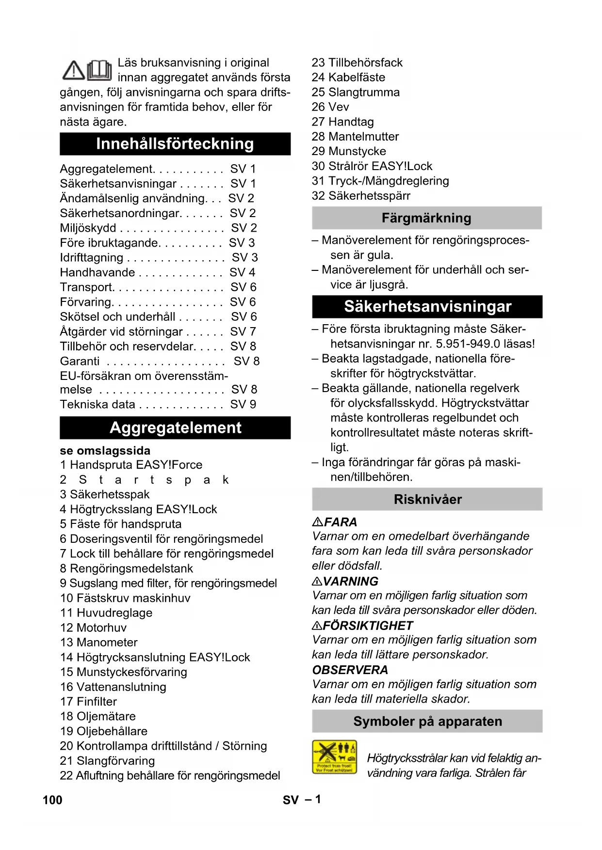 • 1.286-902.0: 75,5 kg; 1.286-903.0: 75,7 kg; 1.286-913.0: 69,1 kg; 1.286-927: 82,5 kg ** 1.286-914.0: 77,5 kg; 1.286-928.0: 86 kg 99NO– 1 Läs bruksanvisning i original innan aggregatet används första gången, följ anvisningarna och spara drifts- anvisningen för framtida behov, eller för nästa ägare. se omslagssida 1 Handspruta EASY!Force 2Startspak 3 Säkerhetsspak 4 Högtrycksslang EASY!Lock 5 Fäste för handspruta 6 Doseringsventil för rengöringsmedel 7 Lock till behållare för rengöringsmedel 8 Rengöringsmedelstank 9 Sugslang med filter, för rengöringsmedel 10 Fästskruv maskinhuv 11 Huvudreglage 12 Motorhuv 13 Manometer 14 Högtrycksanslutning EASY!Lock 15 Munstyckesförvaring 16 Vattenanslutning 17 Finfilter 18 Oljemätare 19 Oljebehållare 20 Kontrollampa drifttillstånd / Störning 21 Slangförvaring 22 Afluftning behållare för rengöringsmedel 23 Tillbehörsfack 24 Kabelfäste 25 Slangtrumma 26 Vev 27 Handtag 28 Mantelmutter 29 Munstycke 30 Strålrör EASY!Lock 31 Tryck-/Mängdreglering 32 Säkerhetsspärr – Manöverelement för rengöringsproces- sen är gula. – Manöverelement för underhåll och ser- vice är ljusgrå. – Före första ibruktagning måste Säker- hetsanvisningar nr. 5.951-949.0 läsas! – Beakta lagstadgade, nationella före- skrifter för högtryckstvättar. – Beakta gällande, nationella regelverk för olycksfallsskydd. Högtryckstvättar måste kontrolleras regelbundet och kontrollresultatet måste noteras skrift- ligt. – Inga förändringar får göras på maski- nen/tillbehören. FARA Varnar om en omedelbart överhängande fara som kan leda till svåra personskador eller dödsfall. 몇 VARNING Varnar om en möjligen farlig situation som kan leda till svåra personskador eller döden. 몇 FÖRSIKTIGHET Varnar om en möjligen farlig situation som kan leda till lättare personskador. OBSERVERA Varnar om en möjligen farlig situation som kan leda till materiella skador. Högtrycksstrålar kan vid felaktig an- vändning vara farliga. Strålen får Innehållsförteckning Aggregatelement. . . . . . . . . . . SV 1 Säkerhetsanvisningar . . . . . . . SV 1 Ändamålsenlig användning. . . SV 2 Säkerhetsanordningar. . . . . . . SV 2 Miljöskydd . . . . . . . . . . . . . . . . SV 2 Före ibruktagande. . . . . . . . . . SV 3 Idrifttagning . . . . . . . . . . . . . . . SV 3 Handhavande . . . . . . . . . . . . . SV 4 Transport. . . . . . . . . . . . . . . . . SV 6 Förvaring. . . . . . . . . . . . . . . . . SV 6 Skötsel och underhåll . . . . . . . SV 6 Åtgärder vid störningar . . . . . . SV 7 Tillbehör och reservdelar. . . . . SV 8 Garanti . . . . . . . . . . . . . . . . . . SV 8 EU-försäkran om överensstäm- melse . . . . . . . . . . . . . . . . . . . SV 8 Tekniska data . . . . . . . . . . . . . SV 9 Aggregatelement Färgmärkning Säkerhetsanvisningar Risknivåer Symboler på apparaten 100 SV– 2 inte riktas mot människor, djur, aktiv elektrisk ut- rustning eller mot själva aggregatet. Enligt gällande föreskrifter får maski- nen aldrig köras över dricksvattennä- tet utan systemavskiljare. Passande systemavskiljare från KÄRCHER, el- ler alternativt en systemavskiljare enligt EN 12729 typ BA, ska användas. Vatten som runnit genom en systemavskil- jare anses inte vara drickbart. 몇 FÖRSIKTIGHET Anslut alltid systemavskiljaren till vattenför- sörjningen, aldrig direkt till maskinen. Använd endast denna högtryckstvätt – rengöring med lågtrycksstråle och ren- göringsmedel (t.ex. för rengöring av maskiner, fordon, byggnader, verktyg), – rengöring med högtrycksstråle utan rengöringsmedel (t.ex. rengöring av fa- sader, terasser, trädgårdsutrustning). Vid kraftig nedsmutsning rekommenderar vi rotojet som specialtillbehör. Krav på vattenkvaliteten: OBSERVERA Endast rent vatten får användas som hög- trycksmedium. Nedsmutsning leder till för- slitningar eller avlagringar i apparaten på ett för tidigt statdum. Om återvinningsvatten används får följan- de gränsvärden inte överskridas. Säkerhetsanordningarna ger skydd åt an- vändaren och får varken sättas ur drift eller förbikopplas. Om vattenmängden minskas med tryck/ mängdregleringen öppnas överfyllnings- ventilen och en del av vattnet flyter tillbaka till pumpens sugsida. När handtaget på handsprutan släpps från- kopplas pumpen av en tryckbrytare som stoppar högtrycksstrålen. Drar man i hand- taget kopplas pumpen in igen. Överfyllnadsventil och tryckställare har ställts in av tillverkaren och är plomberade. Inställning endast av kundservice. Elektriska och elektroniska maskiner inne- håller ofta komponenter som vid felaktig användning eller felaktig avfallshantering kan utgöra en potentiell risk för människors hälsa och för miljön. Dessa komponenter är dock nödvändiga för att maskinen ska kun- na arbeta korrekt. Maskiner som märkts Ändamålsenlig användning pH-värde 6,5...9,5 elektrisk ledningsförmåga * Ledningsför- måga färsk- vatten +1 200 µS/cm sedimenterbara ämnen ** < 0,5 mg/l filtreringsbara ämnen *** < 50 mg/l Kolväten < 20 mg/l Klor < 300 mg/l Sulfat < 240 mg/l Kalcium < 200 mg/l Totalhårdhet < 28 °dH < 50 °TH < 500 ppm (mg CaCO