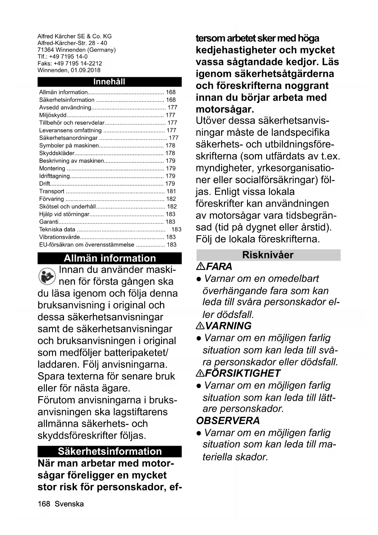 • Lengde på styreskinne mm 300 Klippelengde mm 250 Sagkjededeling in (mm) 0,375 (9,525) Vekt (uten batteripakke) kg 3,2 Chairman of the Board of ManagementDirector Regulatory Affairs & Certification H. Jenner S. Reiser168 Svenska Alfred Kärcher SE & Co. KG Alfred-Kärcher-Str. 28 - 40 71364 Winnenden (Germany) Tlf.: +49 7195 14-0 Faks: +49 7195 14-2212 Winnenden, 01.09.2018 Innehåll Allmän information Innan du använder maski- nen för första gången ska du läsa igenom och följa denna bruksanvisning i original och dessa säkerhetsanvisningar samt de säkerhetsanvisningar och bruksanvisningen i original som medföljer batteripaketet/ laddaren. Följ anvisningarna. Spara texterna för senare bruk eller för nästa ägare. Förutom anvisningarna i bruks- anvisningen ska lagstiftarens allmänna säkerhets- och skyddsföreskrifter följas. Säkerhetsinformation När man arbetar med motor- sågar föreligger en mycket stor risk för personskador, ef- tersom arbetet sker med höga kedjehastigheter och mycket vassa sågtandade kedjor. Läs igenom säkerhetsåtgärderna och föreskrifterna noggrant innan du börjar arbeta med motorsågar. Utöver dessa säkerhetsanvis- ningar måste de landspecifika säkerhets- och utbildningsföre- skrifterna (som utfärdats av t.ex. myndigheter, yrkesorganisatio- ner eller socialförsäkringar) föl- jas. Enligt vissa lokala föreskrifter kan användningen av motorsågar vara tidsbegrän- sad (tid på dygnet eller årstid). Följ de lokala föreskrifterna. Risknivåer FARA ● Varnar om en omedelbart överhängande fara som kan leda till svåra personskador el- ler dödsfall. 몇 VARNING ● Varnar om en möjligen farlig situation som kan leda till svå- ra personskador eller dödsfall. 몇 FÖRSIKTIGHET ● Varnar om en möjligen farlig situation som kan leda till lätt- are personskador. OBSERVERA ● Varnar om en möjligen farlig situation som kan leda till ma- teriella skador. Allmän information p. 168