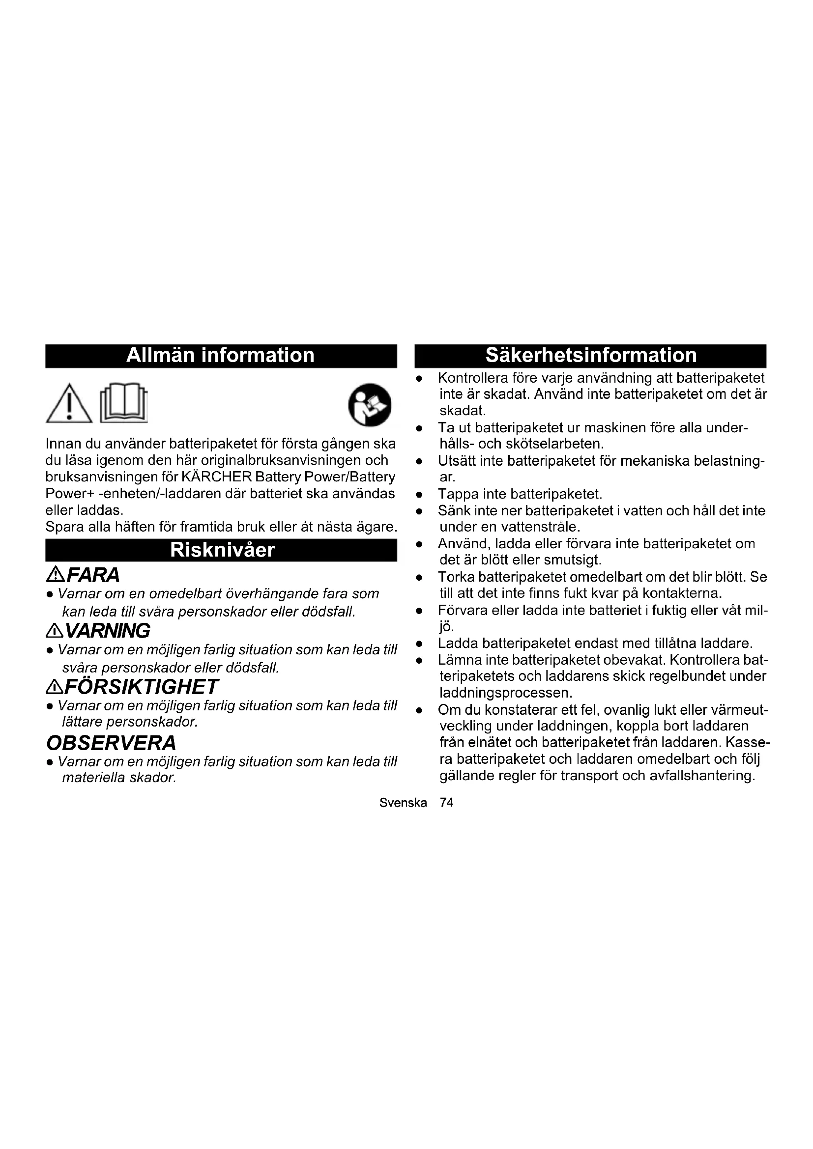 Tekniske spesifikasjoner Med forbehold om tekniske endringer. 18/25 18/50 36/25 36/50 Elektrisk tilkobling Nominell spenning batteri V 18 18 36 36 Batteriplattform Battery Power Battery Power Battery Power Battery Power Kompatibel med batteriplattform Battery Power + Battery Power + Battery Power + Battery Power + Batteritype Li-ION Li-ION Li-ION Li-ION Nominell kapasitet (iht. IEC/EN 61960) Ah 2,5 5,0 2,5 5,0 Nominell energi Wh 45 90 90 180 Ladestrøm maks. A 3,5 7,5 3,5 7,5 Mål og vekt Vekt kg 0,5 0,8 0,9 1,5 Driftstemperatur °C -20 - 40 -20 - 40 -20 - 40 -20 - 40 Oppladingstemperatur °C 4 - 40 4 - 40 4 - 40 4 - 40 Oppbevaringstemperatur °C -20 - 60 -20 - 60 -20 - 60 -20 - 60 Lengde x bredde x høyde mm 133 x 88 x 50 133 x 88 x 72 133 x 88 x 72 133 x 88 x 117,5Svenska 74 Allmän information Innan du använder batteripaketet för första gången ska du läsa igenom den här originalbruksanvisningen och bruksanvisningen för KÄRCHER Battery Power/Battery Power+ -enheten/-laddaren där batteriet ska användas eller laddas. Spara alla häften för framtida bruk eller åt nästa ägare. Risknivåer FARA ● Varnar om en omedelbart överhängande fara som kan leda till svåra personskador eller dödsfall. 몇 VARNING ● Varnar om en möjligen farlig situation som kan leda till svåra personskador eller dödsfall. 몇 FÖRSIKTIGHET ● Varnar om en möjligen farlig situation som kan leda till lättare personskador. OBSERVERA ● Varnar om en möjligen farlig situation som kan leda till materiella skador. Säkerhetsinformation ● Kontrollera före varje användning att batteripaketet inte är skadat. Använd inte batteripaketet om det är skadat. ● Ta ut batteripaketet ur maskinen före alla under- hålls- och skötselarbeten. ● Utsätt inte batteripaketet för mekaniska belastning- ar. ● Tappa inte batteripaketet. ● Sänk inte ner batteripaketet i vatten och håll det inte under en vattenstråle. ● Använd, ladda eller förvara inte batteripaketet om det är blött eller smutsigt. ● Torka batteripaketet omedelbart om det blir blött. Se till att det inte finns fukt kvar på kontakterna. ● Förvara eller ladda inte batteriet i fuktig eller våt mil- jö. ● Ladda batteripaketet endast med tillåtna laddare. ● Lämna inte batteripaketet obevakat. Kontrollera bat- teripaketets och laddarens skick regelbundet under laddningsprocessen. ● Om du konstaterar ett fel, ovanlig lukt eller värmeut- veckling under laddningen, koppla bort laddaren från elnätet och batteripaketet från laddaren. Kasse- ra batteripaketet och laddaren omedelbart och följ gällande regler för transport och avfallshantering.75 Svenska ● Använd, ladda eller förvara inte batteripaketet i ex- plosiv miljö eller nära lättantändliga föremål. ● Kasta inte batteripaketet i eld. ● Skydda batteripaketet mot värme, vassa kanter, ol- ja, lösningsmedel, rengöringsmedel och rörliga komponenter. ● Kortslutningsrisk. Skydda batteripackets kontakter mot metalldelar och förvara det inte tillsammans med metalldelar. ● Öppna inte batteripaketet. Låt endast yrkespersonal utföra reparationer. ● Undvik kontakt med vätska som kommer ut ur de- fekta batterier. Spola bort vätskan omedelbart med vatten om du kommer i kontakt med den, och kon- takta läkare ifall vätskan kommit i kontakt med ögo- nen. ● Kassera batteripaketet vid slutet av dess livslängd i enlighet med tillämpliga bestämmelser. Säkerhetsinformation avseende transport Litiumjonbatteriet omfattas av kraven på farligt gods. Användaren kan transportera ett oskadat och fungeran- de batteripaket på allmänna vägar utan några ytterligare åtgärder. Vid frakt genom tredje part (transportföretag) gäller sär- skilda krav på förpackning och märkning. Använd batteripaketet endast om höljet är oskadat. Täck över blottade kontakter. Förpacka batteripaketet på ett fast och säkert sätt. Bat- teripaketet får inte kunna röra sig inuti förpackningen. FARA ● Ett defekt eller icke-fungerande batteripaket får inte skickas utan måste kasseras på plats i enlighet med tillämpliga bestämmelser. Följ de lokala föreskrifterna. Avsedd användning 몇 FÖRSIKTIGHET Explosionsrisk! Risk för person- och materialskador om batteripaketet exploderar. Ladda, använd och förvara endast oskadade och fullt fungerande batteripaket. Gör inga ändringar som inte är godkända av tillverka- ren. All annan användning är förbjuden. Användaren ansva- rar för faror som uppstår på grund av otillåten använd- ning. Ladda och använd endast batteripaketen med enheter från KÄRCHER 18 V/36 V Battery Power / Battery Power+ -systemet.Svenska 76 OBSERVERA Batteripaket kan endast användas med enheter av samma spänningstyp (18 V eller 36 V)! Använd eller ladda inte batteripaket med enheter med en annan spänningstyp. Kontrollera före användning att spänningstypen (18 V/ 36 V) för batteripaketet och enheten stämmer överens. Uppgifter om spänningen finns på enheten, på batteri- paketet och deras typskylt. Miljöskydd Förpackningsmaterialen kan återvinnas. Kasta inte förpackningarna i de vanliga hushållssopor- na, utan lämna dem till återvinning. Uttjänta apparater innehåller värdefulla, återvin- ningsbara material som ska lämnas till återvin- ning. Batterier och batteripaket innehåller ämnen som inte får släppas ut i naturen. Lämna därför ut- tjänta apparater, batterier och batteripaket till lämplig in- samlingspunkt. Följ lagstiftarens rekommendationer för hantering av li- tiumjonbatterier. Avfallshantera förbrukade och defekta batteripaket i enlighet med gällande lagar och förord- ningar. Information om ämnen (REACH) Aktuell information om ämnen finns på: www.kaer- cher.de/REACH Garanti I respektive land gäller de garantivillkor som publicerats av våra auktoriserade distributörer. Eventuella fel på en- heten repareras utan kostnad inom garantitiden, under förutsättning att de orsakats