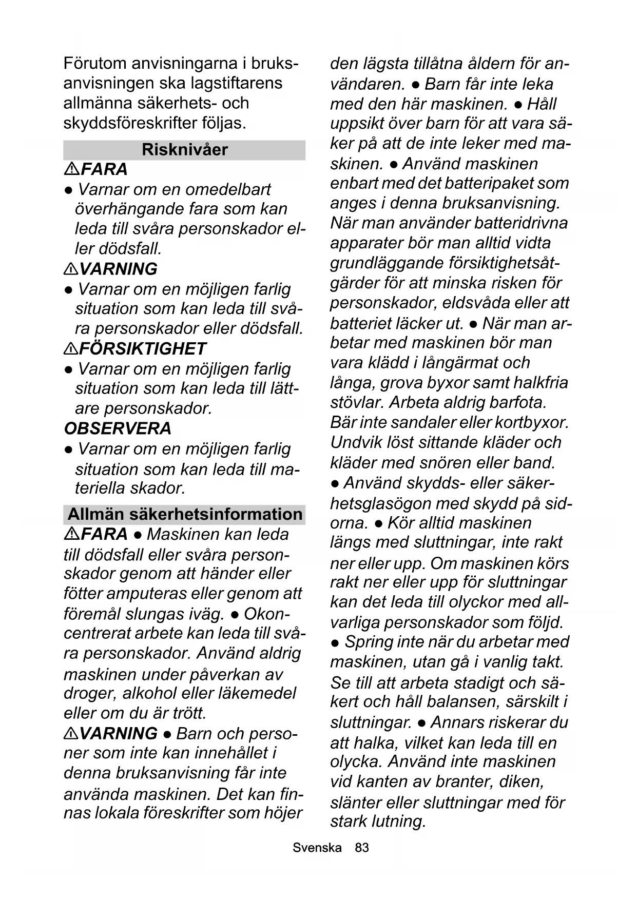 - EU-försäkran om överensstämmelse Chairman of the Board of ManagementDirector Regulatory Affairs & Certification H. Jenner S. ReiserSvenska 83 Förutom anvisningarna i bruks- anvisningen ska lagstiftarens allmänna säkerhets- och skyddsföreskrifter följas. Risknivåer FARA ● Varnar om en omedelbart överhängande fara som kan leda till svåra personskador el- ler dödsfall. 몇 VARNING ● Varnar om en möjligen farlig situation som kan leda till svå- ra personskador eller dödsfall. 몇 FÖRSIKTIGHET ● Varnar om en möjligen farlig situation som kan leda till lätt- are personskador. OBSERVERA ● Varnar om en möjligen farlig situation som kan leda till ma- teriella skador. Allmän säkerhetsinformation FARA ● Maskinen kan leda till dödsfall eller svåra person- skador genom att händer eller fötter amputeras eller genom att föremål slungas iväg. ● Okon- centrerat arbete kan leda till svå- ra personskador. Använd aldrig maskinen under påverkan av droger, alkohol eller läkemedel eller om du är trött. 몇 VARNING ● Barn och perso- ner som inte kan innehållet i denna bruksanvisning får inte använda maskinen. Det kan fin- nas lokala föreskrifter som höjer den lägsta tillåtna åldern för an- vändaren. ● Barn får inte leka med den här maskinen. ● Håll uppsikt över barn för att vara sä- ker på att de inte leker med ma- skinen. ● Använd maskinen enbart med det batteripaket som anges i denna bruksanvisning. När man använder batteridrivna apparater bör man alltid vidta grundläggande försiktighetsåt- gärder för att minska risken för personskador, eldsvåda eller att batteriet läcker ut. ● När man ar- betar med maskinen bör man vara klädd i långärmat och långa, grova byxor samt halkfria stövlar. Arbeta aldrig barfota. Bär inte sandaler eller kortbyxor. Undvik löst sittande kläder och kläder med snören eller band. ● Använd skydds- eller säker- hetsglasögon med skydd på sid- orna. ● Kör alltid maskinen längs med sluttningar, inte rakt ner eller upp. Om maskinen körs rakt ner eller upp för sluttningar kan det leda till olyckor med all- varliga personskador som följd. p. 90