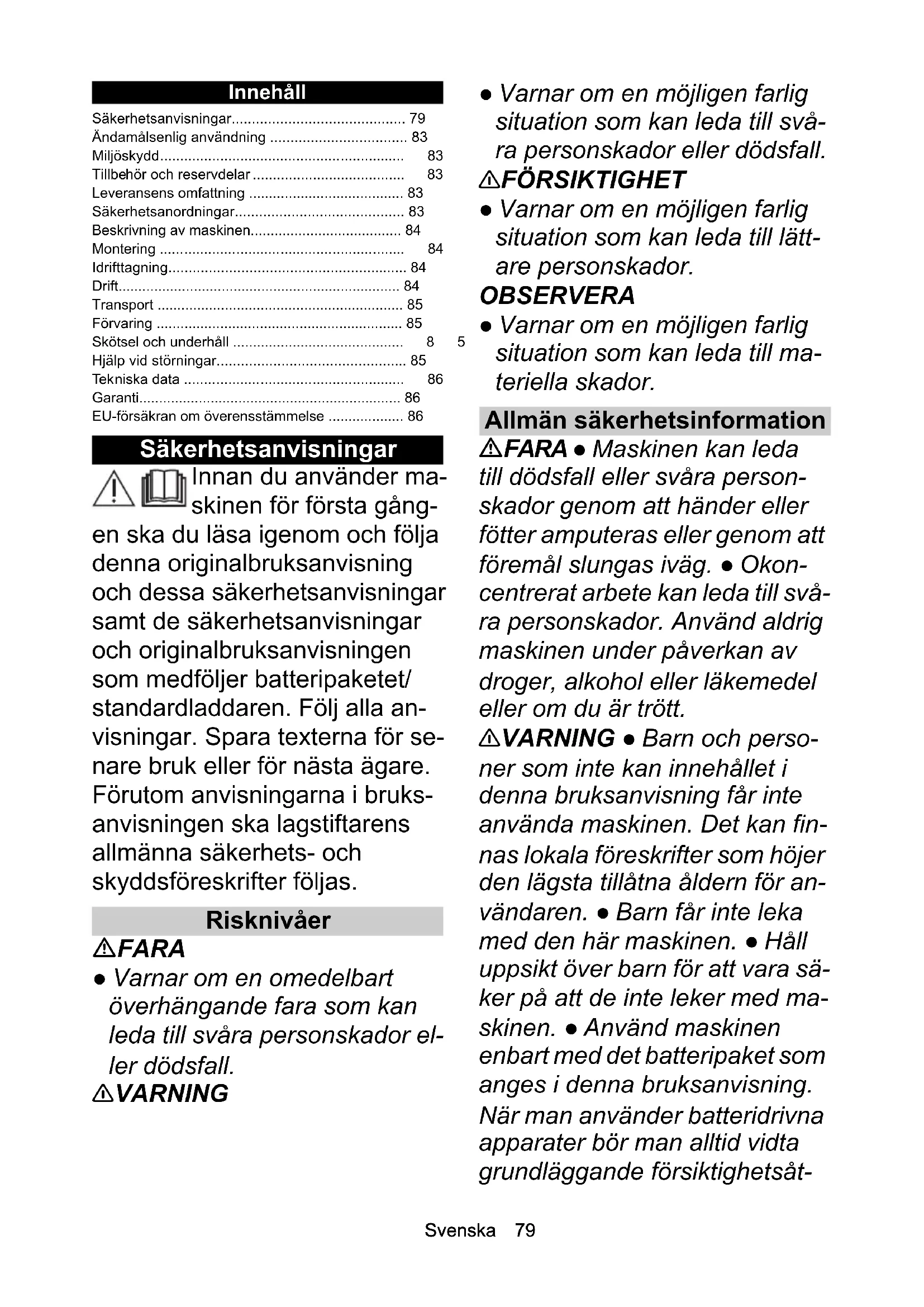 - Vekt (uten batteripakke) kg 13,4 Chairman of the Board of ManagementDirector Regulatory Affairs & Certification H. Jenner S. ReiserSvenska 79 Innehåll Säkerhetsanvisningar Innan du använder ma- skinen för första gång- en ska du läsa igenom och följa denna originalbruksanvisning och dessa säkerhetsanvisningar samt de säkerhetsanvisningar och originalbruksanvisningen som medföljer batteripaketet/ standardladdaren. Följ alla an- visningar. Spara texterna för se- nare bruk eller för nästa ägare. Förutom anvisningarna i bruks- anvisningen ska lagstiftarens allmänna säkerhets- och skyddsföreskrifter följas. Risknivåer FARA ● Varnar om en omedelbart överhängande fara som kan leda till svåra personskador el- ler dödsfall. 몇 VARNING ● Varnar om en möjligen farlig situation som kan leda till svå- ra personskador eller dödsfall. 몇 FÖRSIKTIGHET ● Varnar om en möjligen farlig situation som kan leda till lätt- are personskador. OBSERVERA ● Varnar om en möjligen farlig situation som kan leda till ma- teriella skador. Allmän säkerhetsinformation FARA ● Maskinen kan leda till dödsfall eller svåra person- skador genom att händer eller fötter amputeras eller genom att föremål slungas iväg. ● Okon- centrerat arbete kan leda till svå- ra personskador. Använd aldrig maskinen under påverkan av droger, alkohol eller läkemedel eller om du är trött. 몇 VARNING ● Barn och perso- ner som inte kan innehållet i denna bruksanvisning får inte använda maskinen. Det kan fin- nas lokala föreskrifter som höjer den lägsta tillåtna åldern för an- vändaren. ● Barn får inte leka med den här maskinen. ● Håll uppsikt över barn för att vara sä- ker på att de inte leker med ma- skinen. ● Använd maskinen enbart med det batteripaket som anges i denna bruksanvisning. När man använder batteridrivna apparater bör man alltid vidta grundläggande försiktighetsåt- Säkerhetsanvisningar p. 79