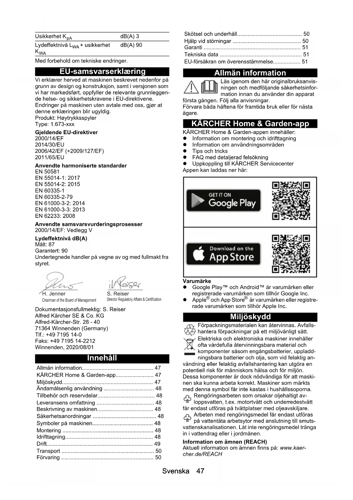 dB(A) 74Svenska 47 Med forbehold om tekniske endringer. EU-samsvarserklæring Vi erklærer herved at maskinen beskrevet nedenfor på grunn av design og konstruksjon, samt i versjonen som vi har markedsført, oppfyller de relevante grunnleggen- de helse- og sikkerhetskravene i EU-direktivene. Endringer på maskinen uten avtale med oss, gjør at denne erklæringen blir ugyldig. Produkt: Høytrykksspyler Type: 1.673-xxx Gjeldende EU-direktiver 2000/14/EF 2014/30/EU 2006/42/EF (+2009/127/EF) 2011/65/EU Anvendte harmoniserte standarder EN 50581 EN 55014-1: 2017 EN 55014-2: 2015 EN 60335-1 EN 60335-2-79 EN 61000-3-2: 2014 EN 61000-3-3: 2013 EN 62233: 2008 Anvendte samsvarsvurderingsprosesser 2000/14/EF: Vedlegg V Lydeffektnivå dB(A) Målt: 87 Garantert: 90 Undertegnede handler på vegne av og med fullmakt fra styret. Dokumentasjonsfullmektig: S. Reiser Alfred Kärcher SE & Co. KG Alfred-Kärcher-Str. 28 - 40 71364 Winnenden (Germany) Tlf.: +49 7195 14-0 Faks: +49 7195 14-2212 Winnenden, 2020/08/01 Innehåll Allmän information Läs igenom den här originalbruksanvis- ningen och medföljande säkerhetsinfor- mation innan du använder din apparat första gången. Följ alla anvisningar. Förvara båda häftena för framtida bruk eller för nästa ägare. KÄRCHER Home & Garden-app KÄRCHER Home & Garden-appen innehåller: Information om montering och idrifttagning Information om användningsområden Tips och tricks FAQ med detaljerad felsökning Uppkoppling till KÄRCHER Servicecenter Appen kan laddas ner här: Varumärke Google Play™ och Android™ är varumärken eller registrerade varumärken som tillhör Google Inc. Apple