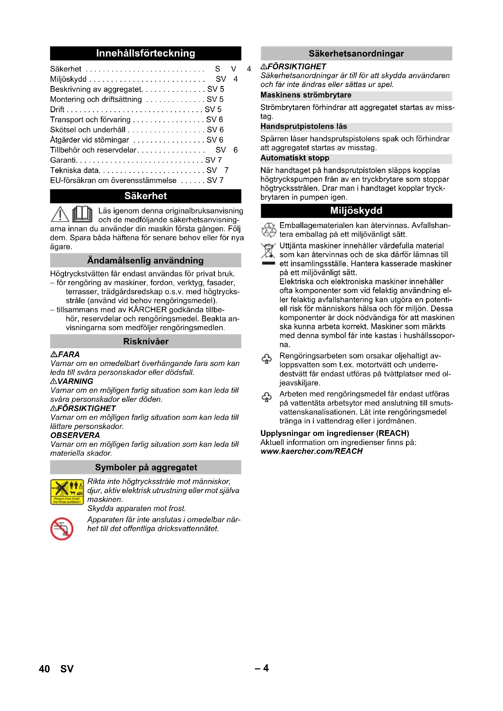 93 dB(A) Det tas forbehold om tekniske endringer. EU-samsvarserklæring Produkt: Høytrykksvasker Type: 1.673-xxx Relevante EU-direktiver 2011/65/EU 2000/14/EF 2006/42/EF (+2009/127/EF) 2014/30/EU Anvendte overensstemmende normer EN 60335–1 EN 60335–2–79 EN 62233: 2008 EN 55014–1:2017 EN 55014–2: 2015 EN 61000–3–2: 2014 EN 61000–3–3: 2013 EN IEC 63000: 2018 Anvendt metode for samsvarsvurdering 2000/14/EF: Vedlegg V Lydeffektnivå dB(A) Målt: 90 Garantert: 93 Chairman of the Board of Management Director Regulatory Affairs & Certification 39NO– 4 Läs igenom denna originalbruksanvisning och de medföljande säkerhetsanvisning- arna innan du använder din maskin första gången. Följ dem. Spara båda häftena för senare behov eller för nya ägare. Högtryckstvätten får endast användas för privat bruk. – för rengöring av maskiner, fordon, verktyg, fasader, terrasser, trädgårdsredskap o.s.v. med högtrycks- stråle (använd vid behov rengöringsmedel). – tillsammans med av KÄRCHER godkända tillbe- hör, reservdelar och rengöringsmedel. Beakta an- visningarna som medföljer rengöringsmedlen. FARA Varnar om en omedelbart överhängande fara som kan leda till svåra personskador eller dödsfall. 몇 VARNING Varnar om en möjligen farlig situation som kan leda till svåra personskador eller döden. 몇 FÖRSIKTIGHET Varnar om en möjligen farlig situation som kan leda till lättare personskador. OBSERVERA Varnar om en möjligen farlig situation som kan leda till materiella skador. 몇 FÖRSIKTIGHET Säkerhetsanordningar är till för att skydda användaren och får inte ändras eller sättas ur spel. Strömbrytaren förhindrar att aggregatet startas av miss- tag. Spärren låser handsprutspistolens spak och förhindrar att aggregatet startas av misstag. När handtaget på handsprutpistolen släpps kopplas högtryckspumpen från av en tryckbrytare som stoppar högtrycksstrålen. Drar man i handtaget kopplar tryck- brytaren in pumpen igen. Upplysningar om ingredienser (REACH) Aktuell information om ingredienser finns på: www.kaercher.com/REACH Innehållsförteckning Säkerhet . . . . . . . . . . . . . . . . . . . . . . . . . . . .SV4 Miljöskydd . . . . . . . . . . . . . . . . . . . . . . . . . . .SV4 Beskrivning av aggregatet. . . . . . . . . . . . . . . SV 5 Montering och driftsättning . . . . . . . . . . . . . . SV 5 Drift . . . . . . . . . . . . . . . . . . . . . . . . . . . . . . . . SV 5 Transport och förvaring . . . . . . . . . . . . . . . . . SV 6 Skötsel och underhåll . . . . . . . . . . . . . . . . . . SV 6 Åtgärder vid störningar . . . . . . . . . . . . . . . . . SV 6 Tillbehör och reservdelar. . . . . . . . . . . . . . . . SV 6 Garanti. . . . . . . . . . . . . . . . . . . . . . . . . . . . . . SV 7 Tekniska data. . . . . . . . . . . . . . . . . . . . . . . . . SV7 EU-försäkran om överensstämmelse . . . . . . SV 7 Säkerhet Ändamålsenlig användning Risknivåer Symboler på aggregatet Rikta inte högtrycksstråle mot människor, djur, aktiv elektrisk utrustning eller mot själva maskinen. Skydda apparaten mot frost. Apparaten får inte anslutas i omedelbar när- het till det offentliga dricksvattennätet. Säkerhetsanordningar Maskinens strömbrytare Handsprutpistolens lås Automatiskt stopp Miljöskydd Emballagematerialen kan återvinnas. Avfallshan- tera emballag på ett miljövänligt sätt. Uttjänta maskiner innehåller värdefulla material som kan återvinnas och de ska därför lämnas till ett insamlingsställe. Hantera kasserade maskiner på ett miljövänligt sätt. Elektriska och elektroniska maskiner innehåller ofta komponenter som vid felaktig användning el- ler felaktig avfallshantering kan utgöra en potenti- ell risk för människors hälsa och för miljön. Dessa komponenter är dock nödvändiga för att maskinen ska kunna arbeta korrekt. Maskiner som märkts med denna symbol får inte kastas i hushållssopor- na. Rengöringsarbeten som orsakar oljehaltigt av- loppsvatten som t.ex. motortvätt och underre- destvätt får endast utföras på tvättplatser med ol- jeavskiljare. Arbeten med rengöringsmedel får endast utföras på vattentäta arbetsytor med anslutning till smuts- vattenskanalisationen. Låt inte rengöringsmedel tränga in i vattendrag eller i jordmånen. 40 SV– 5 Maskinens leveransomfattning (beroende på modell) anges på förpackningen. Den här bruksanvisningen be- skriver alla alternativ. Bilder finns på bildsidorna 1 Högtrycksanslutning 2 Strömbrytare "0/OFF / I/ON" 3 Förvaring för högtrycksslang 4 Bärhandtag 5 Förvaring för stålrör 6 Vattenanslutning med inbyggt filter 7 Kopplingsdel för vattenanslutning 8 Nätkabel med nätkontakt 9 Typskylt 10 Högtrycksspruta 11 Handsprutpistolens lås 12 Högtrycksslang 13 Klämmor till högtrycksslang 14 Strålrör med högtrycksmunstycke För normal rengöring. 15 Spolrör med rotojet Vid hårt fastsittande smuts Bilder finns på bildsidorna Bild Montera de bifogade lösa delarna på aggregatet innan det tas i drift. Ställ maskinen på ett jämnt underlag. Bild Dra ut klammern ur högtryckssprutan och för in högtrycksslangen i högtryckssprutan. Tryck in klämman tills den hakar fast. Kontrollera att förbindelsen sitter säkert genom att dra i hög- trycksslangen. Bild OBSERVERA Föroreningar i vattnet kan skada högtryckspumpen eller tillbehören. Som skydd rekommenderas att man använ- der KÄRCHER vattenfilter (specialtillbehör, artikelnum- mer 4.730-059). 몇 FÖRSIKTIGHET Torrkörning under mer än 2 minuter leder till skador på högtryckspumpen. Om maskinen inte bygger upp tryck inom 2 minuter, stäng av maskinen och följ hänvisning- arna i kapitlet "Åtgärder vid störning" 몇 FÖRSIKTIGHET Håll aldrig strålen närmare än 30 cm vid rengöring av lackerade ytor för att undvika skador. OBSERVERA Rengör inte bildäck, lack eller känsliga ytor som trä med rotorjet, risk för skador. Bild OBSERVERA Risk för lackskador. 