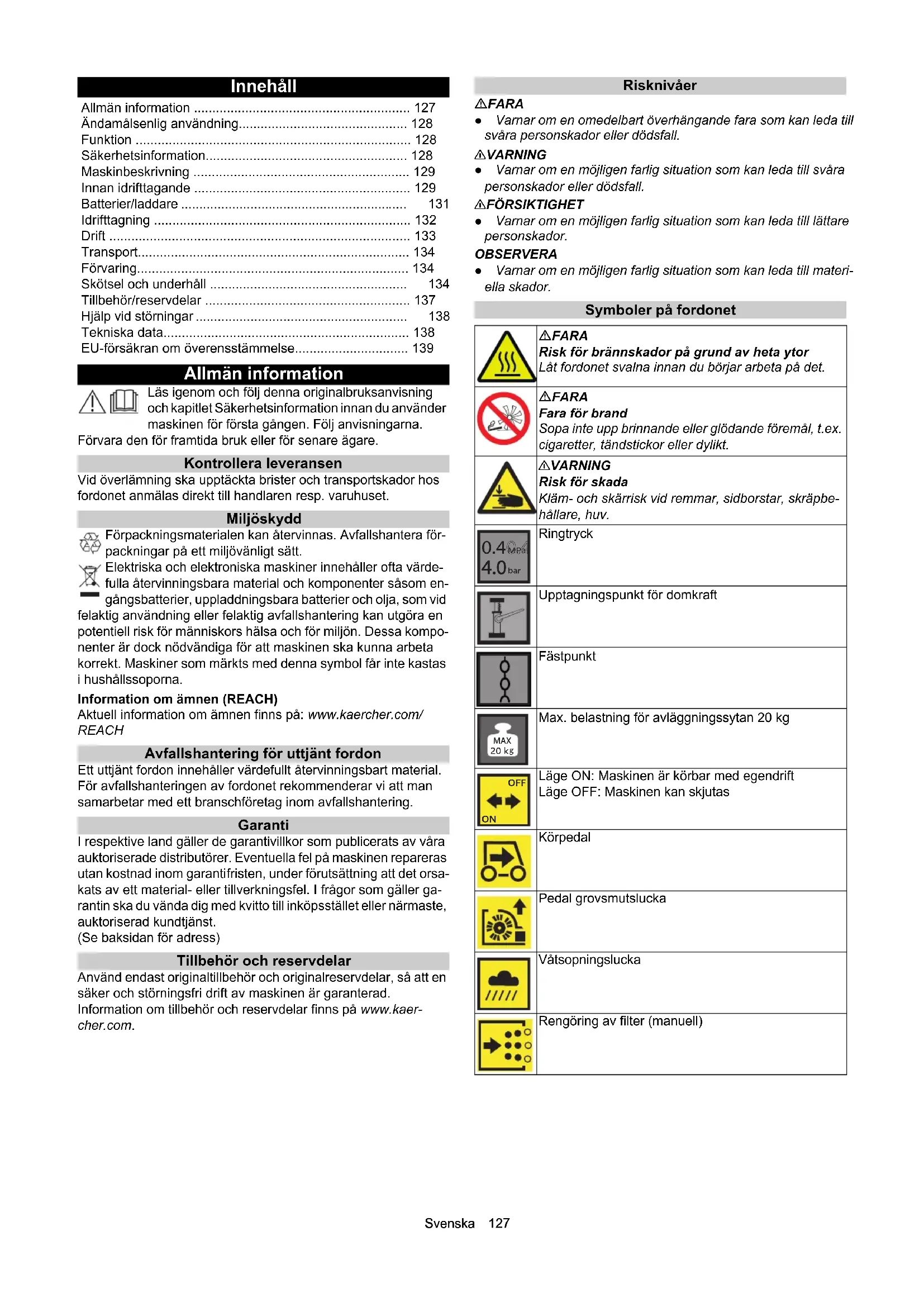 - dB(A)333 KM 85/50 R Bp 1.351-126.0 KM 85/50 R Bp Pack 1.351-127.0 KM 85/50 R Bp Pack 2SB 1.351-128.0 Radiomodul Frekvens MHz Sendeeffekt Watt GSM 824,2-848,8 1510 1850,2-1909,8 870 Trådløst LAN 2400-2483 96 Chairman of the Board of Management Director Regulatory Affairs & Certification H. Jenner S. ReiserSvenska 127 Innehåll Allmän information Läs igenom och följ denna originalbruksanvisning och kapitlet Säkerhetsinformation innan du använder maskinen för första gången. Följ anvisningarna. Förvara den för framtida bruk eller för senare ägare. Kontrollera leveransen Vid överlämning ska upptäckta brister och transportskador hos fordonet anmälas direkt till handlaren resp. varuhuset. Miljöskydd Förpackningsmaterialen kan återvinnas. Avfallshantera för- packningar på ett miljövänligt sätt. Elektriska och elektroniska maskiner innehåller ofta värde- fulla återvinningsbara material och komponenter såsom en- gångsbatterier, uppladdningsbara batterier och olja, som vid felaktig användning eller felaktig avfallshantering kan utgöra en potentiell risk för människors hälsa och för miljön. Dessa kompo- nenter är dock nödvändiga för att maskinen ska kunna arbeta korrekt. Maskiner som märkts med denna symbol får inte kastas i hushållssoporna. Information om ämnen (REACH) Aktuell information om ämnen finns på: www.kaercher.com/ REACH Avfallshantering för uttjänt fordon Ett uttjänt fordon innehåller värdefullt återvinningsbart material. För avfallshanteringen av fordonet rekommenderar vi att man samarbetar med ett branschföretag inom avfallshantering. Garanti I respektive land gäller de garantivillkor som publicerats av våra auktoriserade distributörer. Eventuella fel på maskinen repareras utan kostnad inom garantifristen, under förutsättning att det orsa- kats av ett material- eller tillverkningsfel. I frågor som gäller ga- rantin ska du vända dig med kvitto till inköpsstället eller närmaste, auktoriserad kundtjänst. (Se baksidan för adress) Tillbehör och reservdelar Använd endast originaltillbehör och originalreservdelar, så att en säker och störningsfri drift av maskinen är garanterad. Information om tillbehör och reservdelar finns på www.kaer- cher.com. Risknivåer FARA ● Varnar om en omedelbart överhängande fara som kan leda till svåra personskador eller dödsfall. 몇 VARNING ● Varnar om en möjligen farlig situation som kan leda till svåra personskador eller dödsfall. 몇 FÖRSIKTIGHET ● Varnar om en möjligen farlig situation som kan leda till lättare personskador. OBSERVERA ● Varnar om en möjligen farlig situation som kan leda till materi- ella skador. Symboler på fordonet Allmän information p. 127