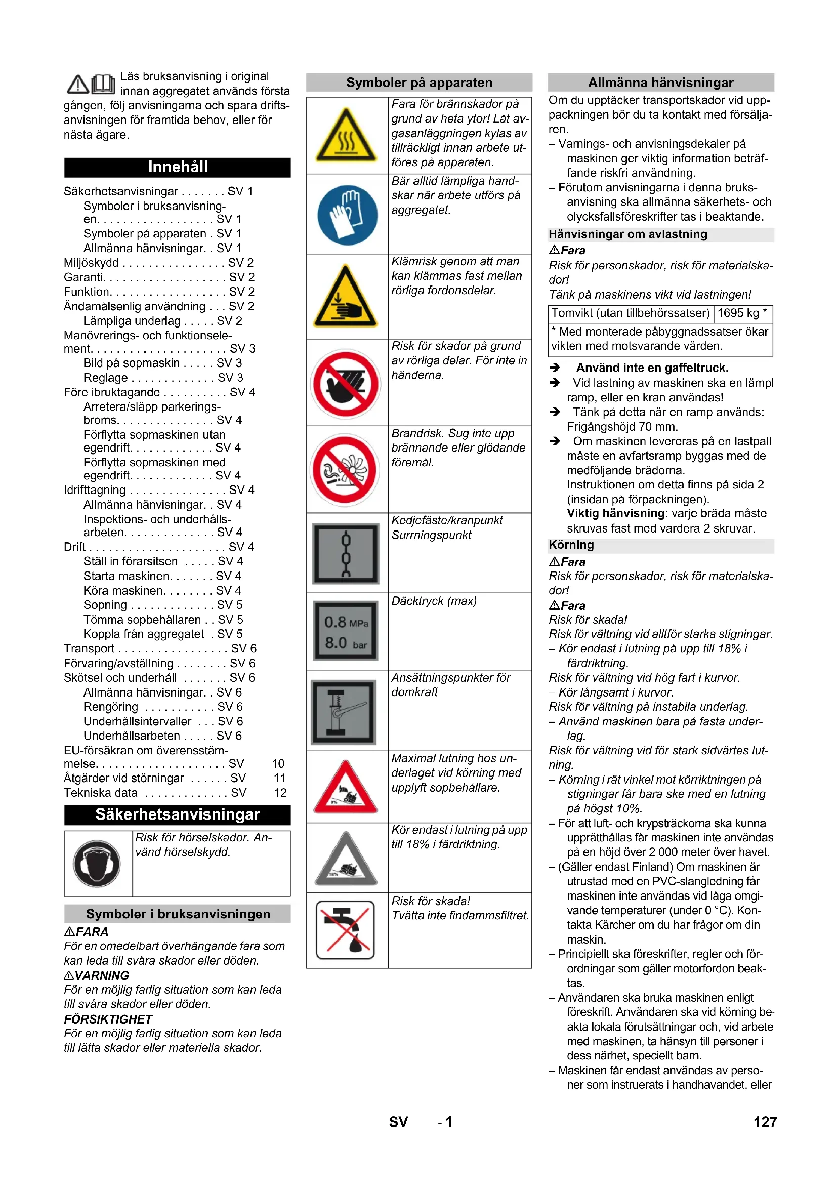 - Med monterade påbyggnadssatser ökar vikten med motsvarande värden. Körning 127SV- 2 tydligt visat att de klarar av att hantera maskinen och uttryckligen fått uppdraget att använda denna. – Maskinen får inte användas av barn eller ungdomar. – Det är inte tillåtet att ta med passagerare. – Maskiner med sittyta får endast sättas i rörelse från sitsen. För att förhindra otillåten användning av maskinen ska tändningsnyckeln dras ur. Maskinen får aldrig lämnas utan uppsikt när motorn är i gång. Användaren får inte lämna maskinen innan motorn slutat ar- beta, maskinen säkrats mot oförutsedda rörelser, parkeringsbromsen (vid behov) aktiverats och tändningsnyckeln dragits ur. Fara Risk för skada! – Avgasutsläppet får inte förslutas. – Man ska inte böja sig över avgasutsläp- pet eller ta i det (risk för brännskada). – Vidrör inte, och ta inte i, drivmotorn (risk för brännskada). – Avgaser är giftiga och skadliga för häl- san. De ska inte andas in. – Motorn behöver ca 3 - 4 sekunder efter- gång efter frånslagningen. Håll dig bor- ta från drivningsområdet under denna tidsperiod. – Slå i nödfall sönder rutorna med nöd- hammaren. MEDDELANDE Nödhammaren är placerad i fotutrymmet, under förarsätet. – Använd endast av tillverkaren godkän- da tillbehör och reservdelar. Originaltill- behör och originalreservdelar gör att maskinen kan användas säkert och utan störning. – Ytterligare information om reservdelar hittas under service på www.kaer- cher.com. Upplysningar om ingredienser (REACH) Aktuell information om ingredienser finns på: www.kaercher.com/REACH I respektive land gäller de garantivillkor som publicerats av våra auktoriserade dist- ributörer. Eventuella fel på aggregatet re- pareras utan kostnad under förutsättning att det orsakats av ett material- eller tillverk- ningsfel. I frågor som gäller garantin ska du vända dig med kvitto till inköpsstället eller närmaste auktoriserade serviceverkstad. Sopmaskinen arbetar enligt sopskyffelprin- cipen. – Den roterande borstvalsen befordrar smutsen direkt till smutsbehållaren. – Sidoborstarna rengör ytans hörn och kanter och skickar in smutsen i borst- valsens bana. – Det fina dammet sugs upp via dammfil- tret genom sugfläkten. Använd endast sopmaskinen enligt anvis- ningar i denna bruksanvisning. Kontrollera maskinen och arbetsanord- ningarnas föreskriftsenliga tillstånd och driftssäkerhet före användningen. Om tillståndet inte är korrekt får den inte tas i bruk. – Denna sopmaskin är avsedd för sop- ning av nedsmustade ytor utomhus. – Aggregatet får inte användas inomhus. – Åkbara maskiner utan lämplig utrust- ning (kan beställas som tillval från fa- brik) är ej godkända för offentlig trafik. – Maskinen måste genomgå godkänd be- siktning hos ansvarig myndighet innan den får användas i offentlig trafik. – Alla enhetshuvar får endast öppnas i vattenskyddade områden. – Maskinen är inte lämplig för uppsug- ning av hälsovådligt damm.