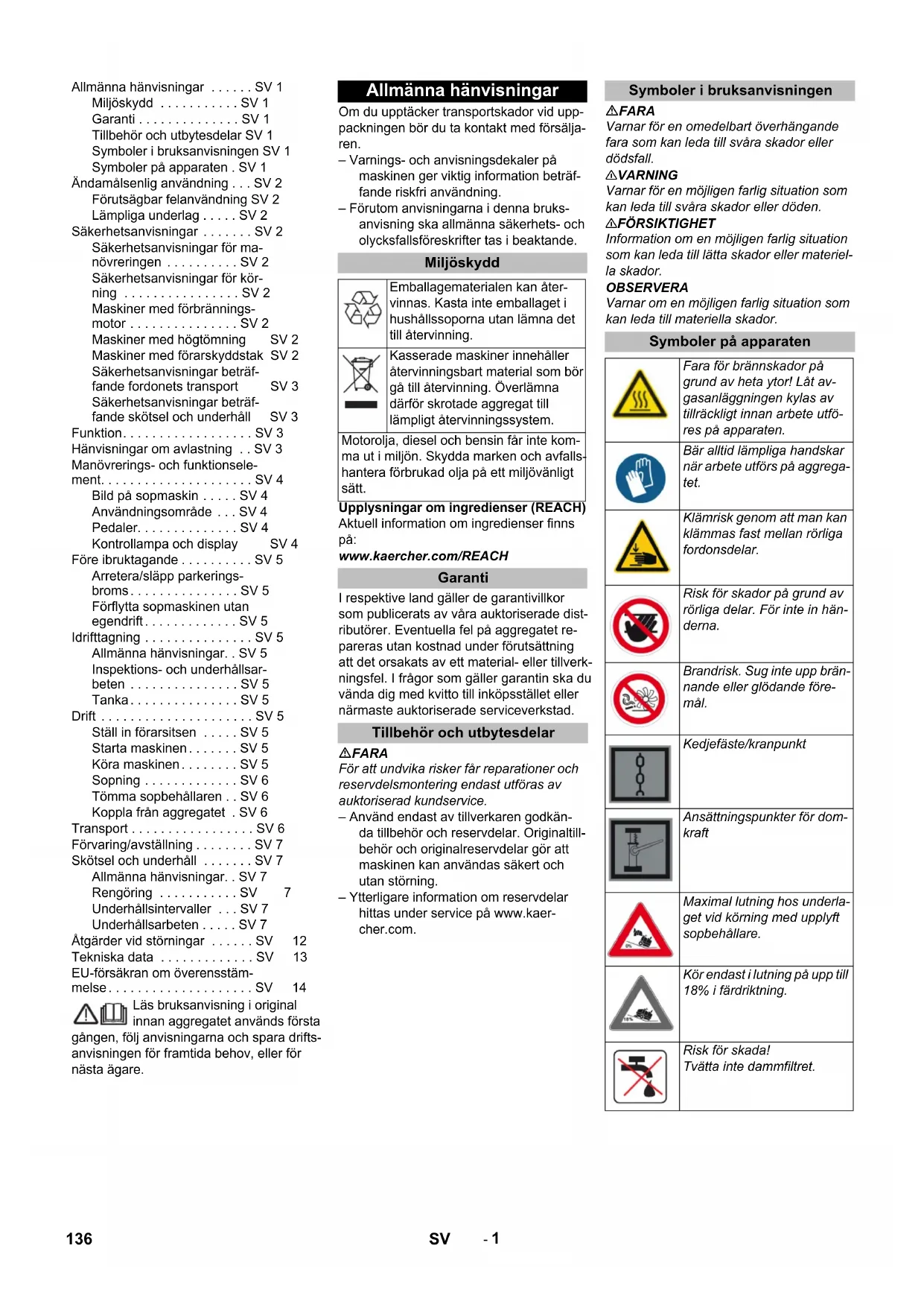 Man ska inte böja sig över avgasutsläp- pet eller ta i det (risk för brännskada). Vidrör inte, och ta inte i, drivmotorn (risk för brännskada). Avgaser är giftiga och skadliga för häl- san. De ska inte andas in. Motorn behöver ca 3 - 4 sekunder efter- gång efter frånslagningen. Håll dig bor- ta från drivningsområdet under denna tidsperiod. FARA Risk för skada! Höj upp sopbehållaren helt och säkra vid arbeten på högtömningen. Utför endast säkringen från utanför risk- området. MEDDELANDE Skyddstaket för förare (tillval) skyddar mot större nedfallande delar. De ger dock inget skydd vid vältning! Kontrollera dagligen om skyddstaket är skadat. Om skyddstaket är skadat ska det bytas ut, även om bara enstaka element är skadade. Alla ändringar av skyddstaket samt montering av element, komponenter och enheter som inte har godkänts av Kärcher tillåts inte och kan begränsa skyddstakets funktion. Ändamålsenlig användning Förutsägbar felanvändning Lämpliga underlag Säkerhetsanvisningar Säkerhetsanvisningar för manövreringen Säkerhetsanvisningar för körning Maskiner med förbränningsmotor Maskiner med högtömning Maskiner med förarskyddstak 137SV- 3 Beakta utrustningens tomvikt (trans- portvikt) vid transport på gafflar eller for- don. Koppla bort batteriet och fixera maski- nen ordentligt när den ska transporte- ras. Före rengöring och underhåll, byte av delar eller omkoppling till annan funk- tion ska maskinen stängas av och tänd- ningsnyckeln ska tas bort. Vid arbeten på elsystemet ska batteriet kopplas bort. Lossa först minuspolen och sedan pluspolen. Återanslutningen görs i omvänd ord- ning. Anslut först pluspolen och sedan minuspolen. Maskinen får inte rengöras med slang eller högtryckstvätt (risk för kortslutning eller andra skador). Avhjälpande underhåll får endast utfö- ras av auktoriserad kundtjänst eller fackkraft på området, införstådd med alla relevanta säkerhetsföreskrifter. Säkerhetskontroll enligt lokalt gällande föreskrifter ska beaktas för yrkesmäs- sigt använda maskiner som används på olika orter. Använd alltid lämpliga handskar vid ar- beten på aggregatet. Sopmaskinen arbetar enligt sopskyffelprin- cipen. – Den roterande borstvalsen befordrar smutsen direkt till smutsbehållaren. – Sidoborstarna rengör ytans hörn och kanter och skickar in smutsen i borst- valsens bana. – Det fina dammet sugs upp via dammfil- tret genom sugfläkten. FARA Risk för person och egendomsskada! Tänk på maskinens vikt vid lastningen! Använd inte en gaffeltruck - fordonet kan skadas. Vid lastning av maskinen ska en lämplig ramp, eller en kran användas! Tänk på detta när en ramp används: Frigångshöjd 70 mm. Om maskinen levereras på en lastpall måste en avfartsramp byggas med de medföljande brädorna. Instruktionen om detta finns på sida 2 (insidan på förpackningen). Viktig hänvisning: varje bräda måste skruvas fast med vardera 2 skruvar. Säkerhetsanvisningar beträffande fordonets transport Säkerhetsanvisningar beträffande skötsel och underhåll Funktion Hänvisningar om avlastning Tomvikt (transportvikt) 880 kg*
