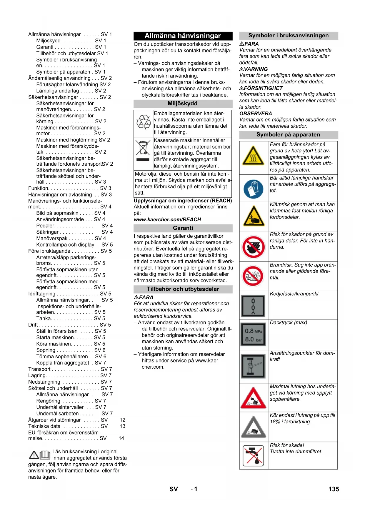 Anvendt metode for samsvarsvurde- ring 2000/14/EF: Vedlegg V Lydeffektnivå dB(A) Målt: 99 Garantert: 102 Chairman of the Board of Management Director Regulatory Affairs & Certification 134 NO- 1 Läs bruksanvisning i original innan aggregatet används första gången, följ anvisningarna och spara drifts- anvisningen för framtida behov, eller för nästa ägare. Om du upptäcker transportskador vid upp- packningen bör du ta kontakt med försälja- ren. – Varnings- och anvisningsdekaler på maskinen ger viktig information beträf- fande riskfri användning. – Förutom anvisningarna i denna bruks- anvisning ska allmänna säkerhets- och olycksfallsföreskrifter tas i beaktande. Upplysningar om ingredienser (REACH) Aktuell information om ingredienser finns på: www.kaercher.com/REACH I respektive land gäller de garantivillkor som publicerats av våra auktoriserade dist- ributörer. Eventuella fel på aggregatet re- pareras utan kostnad under förutsättning att det orsakats av ett material- eller tillverk- ningsfel. I frågor som gäller garantin ska du vända dig med kvitto till inköpsstället eller närmaste auktoriserade serviceverkstad. FARA För att undvika risker får reparationer och reservdelsmontering endast utföras av auktoriserad kundservice. – Använd endast av tillverkaren godkän- da tillbehör och reservdelar. Originaltill- behör och originalreservdelar gör att maskinen kan användas säkert och utan störning. – Ytterligare information om reservdelar hittas under service på www.kaer- cher.com. FARA Varnar för en omedelbart överhängande fara som kan leda till svåra skador eller dödsfall. 몇 VARNING Varnar för en möjligen farlig situation som kan leda till svåra skador eller döden. 몇 FÖRSIKTIGHET Information om en möjligen farlig situation som kan leda till lätta skador eller materiel- la skador. OBSERVERA Varnar om en möjligen farlig situation som kan leda till materiella skador. Allmänna hänvisningar . . . . . . SV 1 Miljöskydd . . . . . . . . . . . SV 1 Garanti . . . . . . . . . . . . . . SV 1 Tillbehör och utbytesdelar SV 1 Symboler i bruksanvisning- en. . . . . . . . . . . . . . . . . . SV 1 Symboler på apparaten . SV 1 Ändamålsenlig användning . . . SV 2 Förutsägbar felanvändning SV 2 Lämpliga underlag . . . . . SV 2 Säkerhetsanvisningar . . . . . . . SV 2 Säkerhetsanvisningar för manövreringen. . . . . . . . SV 2 Säkerhetsanvisningar för körning . . . . . . . . . . . . . . SV 2 Maskiner med förbrännings- motor . . . . . . . . . . . . . . . SV 2 Maskiner med högtömning SV 2 Maskiner med förarskydds- tak . . . . . . . . . . . . . . . . . SV 2 Säkerhetsanvisningar be- träffande fordonets transportSV 2 Säkerhetsanvisningar be- träffande skötsel och under- håll . . . . . . . . . . . . . . . . . SV 3 Funktion. . . . . . . . . . . . . . . . . . SV 3 Hänvisningar om avlastning . . SV 3 Manövrerings- och funktionsele- ment. . . . . . . . . . . . . . . . . . . . . SV 4 Bild på sopmaskin . . . . . SV 4 Användningsområde . . . SV 4 Pedaler. . . . . . . . . . . . . . SV 4 Säkringar . . . . . . . . . . . . SV 4 Manöverspak . . . . . . . . . SV 4 Kontrollampa och display SV 5 Före ibruktagande . . . . . . . . . . SV 5 Arretera/släpp parkerings- broms. . . . . . . . . . . . . . . SV 5 Förflytta sopmaskinen utan egendrift. . . . . . . . . . . . . SV 5 Förflytta sopmaskinen med egendrift. . . . . . . . . . . . . SV 5 Idrifttagning . . . . . . . . . . . . . . . SV 5 Allmänna hänvisningar. . SV 5 Inspektions- och underhålls- arbeten. . . . . . . . . . . . . . SV 5 Tanka. . . . . . . . . . . . . . . SV 5 Drift . . . . . . . . . . . . . . . . . . . . . SV 5 Ställ in förarsitsen . . . . . SV 5 Starta maskinen. . . . . . . SV 5 Köra maskinen. . . . . . . . SV 5 Sopning . . . . . . . . . . . . . SV 6 Tömma sopbehållaren . . SV 6 Koppla från aggregatet . SV 7 Transport . . . . . . . . . . . . . . . . . SV 7 Lagring. . . . . . . . . . . . . . . . . . . SV 7 Nedstängning . . . . . . . . . . . . . SV 7 Skötsel och underhåll . . . . . . . SV 7 Allmänna hänvisningar. . SV 7 Rengöring . . . . . . . . . . . SV 7 Underhållsintervaller . . . SV 7 Underhållsarbeten . . . . . SV 7 Åtgärder vid störningar . . . . . . SV 12 Tekniska data . . . . . . . . . . . . . SV 13 EU-försäkran om överensstäm- melse. . . . . . . . . . . . . . . . . . . . SV 14 Allmänna hänvisningar Miljöskydd Emballagematerialen kan åter- vinnas. Kasta inte emballaget i hushållssoporna utan lämna det till återvinning. Kasserade maskiner innehåller återvinningsbart material som bör gå till återvinning. Överlämna därför skrotade aggregat till lämpligt återvinningssystem. Motorolja, diesel och bensin får inte kom- ma ut i miljön. Skydda marken och avfalls- hantera förbrukad olja på ett miljövänligt sätt. Garanti Tillbehör och utbytesdelar Symboler i bruksanvisningen Symboler på apparaten Fara för brännskador på grund av heta ytor! Låt av- gasanläggningen kylas av tillräckligt innan arbete utfö- res på apparaten. Bär alltid lämpliga handskar när arbete utförs på aggrega- tet. Klämrisk genom att man kan klämmas fast mellan rörliga fordonsdelar. Risk för skador på grund av rörliga delar. För inte in hän- derna. Brandrisk. Sug inte upp brän- nande eller glödande före- mål. Kedjefäste/kranpunkt Däcktryck (max) Ansättningspunkter för dom- kraft Maximal lutning hos underla- get vid körning med upplyft sopbehållare. Kör endast i lutning på upp till 18% i färdriktning. Risk för skada! Tvätta inte dammfiltret. 135SV- 2 Sopmaskinen är avsedd för rengöring av golvytor för yrkesmässig användning och t.ex. för följande användningsområden: Parkeringsplatser Produktionsanläggningar Logistikområden Hotell Detaljhandel Lagerområden Gångvägar Använd endast sopmaskinen enligt an- visningar i denna bruksanvisning. All annan användning betraktas som ej föreskriftsmässig. Tillverkaren 