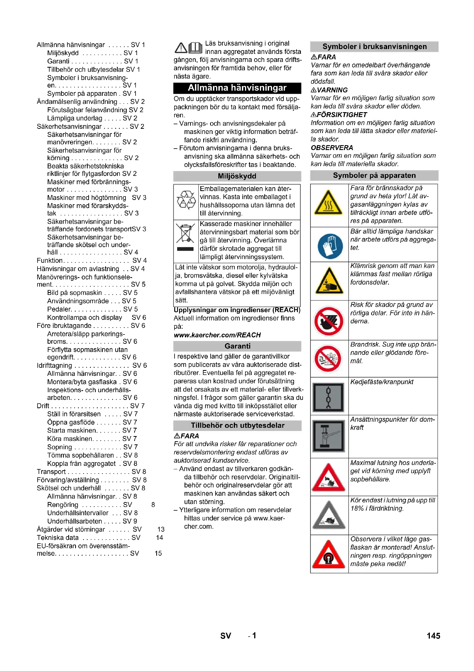 0,1 Mål og vekt Lengde x bredde x høyde mm 2082x1250x1450 Svingradius høyre mm 1350 Svingradius venstre mm 1350 Vekt tom kg 851 Tillatt totalvekt kg 1300 Tillatt akselbelasting foran kg 787 Tillat akselbelastning bak kg 513 Det tas forbehold om tekniske endringer! KM 120/250 R LPG Classic EU-samsvarserklæring Produkt: Feiesugemaskin m. fører- sete Type: KM 120/250 R LPG Classic 1.186-001.0 Relevante EU-direktiver 2006/42/EF (+2009/127/EF) 2014/30/EU 2000/14/EF Anvendte overensstemmende normer EN 60335–1 EN 60335–2–72 EN 55012: 2007 + A1: 2009 EN 61000–6–2: 2005 EN 62233: 2008 Anvendt metode for samsvarsvurde- ring 2000/14/EF: Vedlegg V Lydeffektnivå dB(A) Målt: 102 Garantert: 104 Chairman of the Board of Management Director Regulatory Affairs & Certification 144 NO- 1 Läs bruksanvisning i original innan aggregatet används första gången, följ anvisningarna och spara drifts- anvisningen för framtida behov, eller för nästa ägare. Om du upptäcker transportskador vid upp- packningen bör du ta kontakt med försälja- ren. – Varnings- och anvisningsdekaler på maskinen ger viktig information beträf- fande riskfri användning. – Förutom anvisningarna i denna bruks- anvisning ska allmänna säkerhets- och olycksfallsföreskrifter tas i beaktande. Upplysningar om ingredienser (REACH) Aktuell information om ingredienser finns på: www.kaercher.com/REACH I respektive land gäller de garantivillkor som publicerats av våra auktoriserade dist- ributörer. Eventuella fel på aggregatet re- pareras utan kostnad under förutsättning att det orsakats av ett material- eller tillverk- ningsfel. I frågor som gäller garantin ska du vända dig med kvitto till inköpsstället eller närmaste auktoriserade serviceverkstad. FARA För att undvika risker får reparationer och reservdelsmontering endast utföras av auktoriserad kundservice. – Använd endast av tillverkaren godkän- da tillbehör och reservdelar. Originaltill- behör och originalreservdelar gör att maskinen kan användas säkert och utan störning. – Ytterligare information om reservdelar hittas under service på www.kaer- cher.com. FARA Varnar för en omedelbart överhängande fara som kan leda till svåra skador eller dödsfall. 몇 VARNING Varnar för en möjligen farlig situation som kan leda till svåra skador eller döden. 몇 FÖRSIKTIGHET Information om en möjligen farlig situation som kan leda till lätta skador eller materiel- la skador. OBSERVERA Varnar om en möjligen farlig situation som kan leda till materiella skador. Allmänna hänvisningar . . . . . . SV 1 Miljöskydd . . . . . . . . . . . SV 1 Garanti . . . . . . . . . . . . . . SV 1 Tillbehör och utbytesdelar SV 1 Symboler i bruksanvisning- en. . . . . . . . . . . . . . . . . . SV 1 Symboler på apparaten . SV 1 Ändamålsenlig användning . . . SV 2 Förutsägbar felanvändning SV 2 Lämpliga underlag . . . . . SV 2 Säkerhetsanvisningar . . . . . . . SV 2 Säkerhetsanvisningar för manövreringen. . . . . . . . SV 2 Säkerhetsanvisningar för körning . . . . . . . . . . . . . . SV 2 Beakta säkerhetstekniska riktlinjer för flytgasfordon SV 2 Maskiner med förbrännings- motor . . . . . . . . . . . . . . . SV 3 Maskiner med högtömning SV 3 Maskiner med förarskydds- tak . . . . . . . . . . . . . . . . . SV 3 Säkerhetsanvisningar be- träffande fordonets transportSV 3 Säkerhetsanvisningar be- träffande skötsel och under- håll . . . . . . . . . . . . . . . . . SV 4 Funktion. . . . . . . . . . . . . . . . . . SV 4 Hänvisningar om avlastning . . SV 4 Manövrerings- och funktionsele- ment. . . . . . . . . . . . . . . . . . . . . SV 5 Bild på sopmaskin . . . . . SV 5 Användningsområde . . . SV 5 Pedaler. . . . . . . . . . . . . . SV 5 Kontrollampa och display SV 6 Före ibruktagande . . . . . . . . . . SV 6 Arretera/släpp parkerings- broms. . . . . . . . . . . . . . . SV 6 Förflytta sopmaskinen utan egendrift. . . . . . . . . . . . . SV 6 Idrifttagning . . . . . . . . . . . . . . . SV 6 Allmänna hänvisningar. . SV 6 Montera/byta gasflaska . SV 6 Inspektions- och underhålls- arbeten. . . . . . . . . . . . . . SV 6 Drift . . . . . . . . . . . . . . . . . . . . . SV 7 Ställ in förarsitsen . . . . . SV 7 Öppna gasflöde . . . . . . . SV 7 Starta maskinen. . . . . . . SV 7 Köra maskinen. . . . . . . . SV 7 Sopning . . . . . . . . . . . . . SV 7 Tömma sopbehållaren . . SV 8 Koppla från aggregatet . SV 8 Transport . . . . . . . . . . . . . . . . . SV 8 Förvaring/avställning . . . . . . . . SV 8 Skötsel och underhåll . . . . . . . SV 8 Allmänna hänvisningar. . SV 8 Rengöring . . . . . . . . . . . SV 8 Underhållsintervaller . . . SV 8 Underhållsarbeten . . . . . SV 9 Åtgärder vid störningar . . . . . . SV 13 Tekniska data . . . . . . . . . . . . . SV 14 EU-försäkran om överensstäm- melse. . . . . . . . . . . . . . . . . . . . SV 15 Allmänna hänvisningar Miljöskydd Emballagematerialen kan åter- vinnas. Kasta inte emballaget i hushållssoporna utan lämna det till återvinning. Kasserade maskiner innehåller återvinningsbart material som bör gå till återvinning. Överlämna därför skrotade aggregat till lämpligt återvinningssystem. Låt inte vätskor som motorolja, hydraulol- ja, bromsvätska, diesel eller kylvätska komma ut på golvet. Skydda miljön och avfallshantera vätskor på ett miljövänligt sätt. Garanti Tillbehör och utbytesdelar Symboler i bruksanvisningen Symboler på apparaten Fara för brännskador på grund av heta ytor! Låt av- gasanläggningen kylas av tillräckligt innan arbete utfö- res på apparaten. Bär alltid lämpliga handskar när arbete utförs på aggrega- tet. Klämrisk genom att man kan klämmas fast mellan rörliga fordonsdelar. Risk för skador på grund av rörliga delar. För inte in hän- derna. Brandrisk. Sug inte upp brän- nande eller glödande före- mål. Kedjefäste/kranpunkt Ansättningspunkter för dom- kraft Maximal lutning hos underla- get vid körning