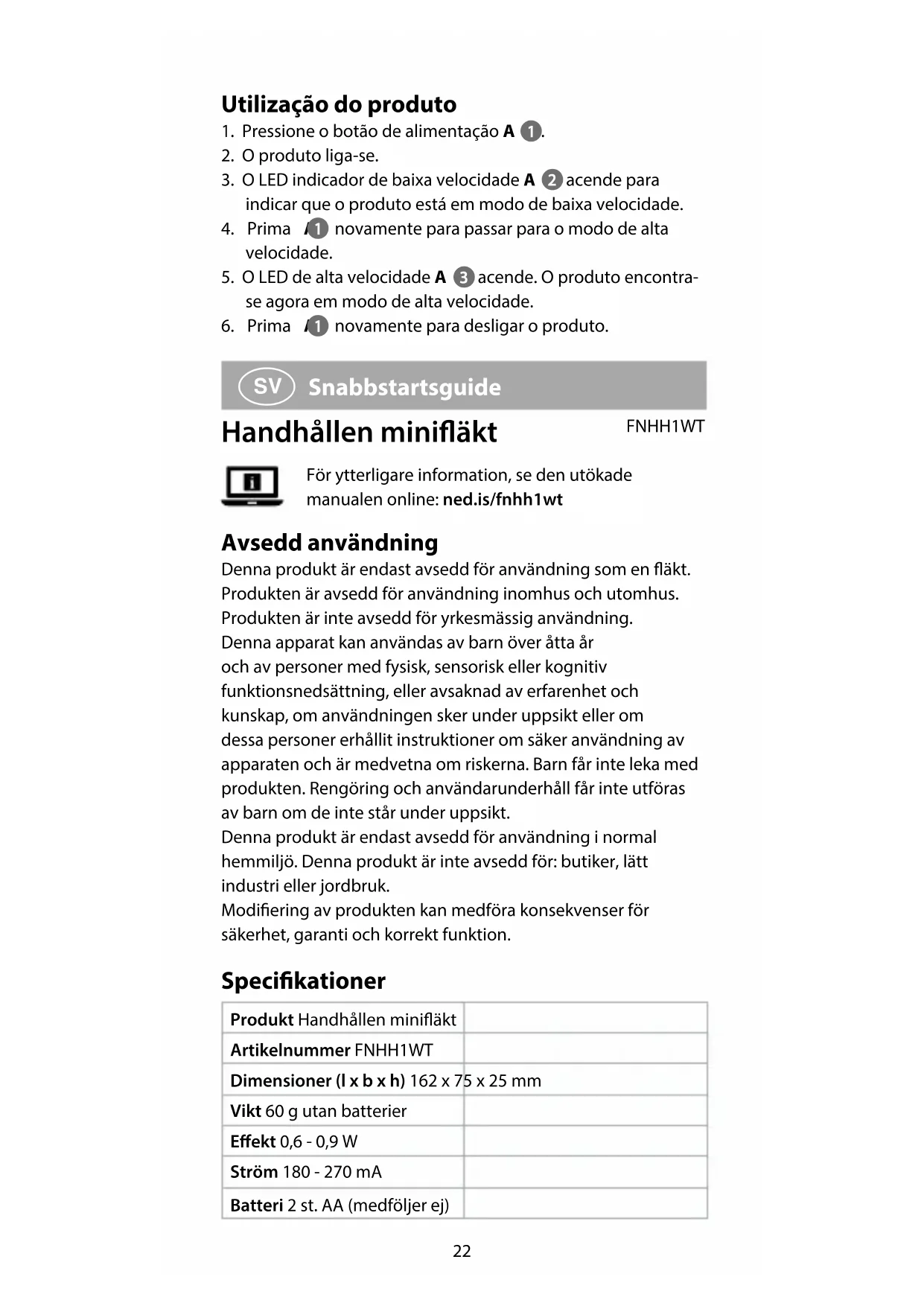 Snabbstartsguide Handhållen miniäkt FNHH1WT För ytterligare information, se den utökade manualen online: ned.is/fnhh1wt Avsedd användning Denna produkt är endast avsedd för användning som en äkt. Produkten är avsedd för användning inomhus och utomhus. Produkten är inte avsedd för yrkesmässig användning. Denna apparat kan användas av barn över åtta år och av personer med fysisk, sensorisk eller kognitiv funktionsnedsättning, eller avsaknad av erfarenhet och kunskap, om användningen sker under uppsikt eller om dessa personer erhållit instruktioner om säker användning av apparaten och är medvetna om riskerna. Barn får inte leka med produkten. Rengöring och användarunderhåll får inte utföras av barn om de inte står under uppsikt. Denna produkt är endast avsedd för användning i normal hemmiljö. Denna produkt är inte avsedd för: butiker, lätt industri eller jordbruk. Modiering av produkten kan medföra konsekvenser för säkerhet, garanti och korrekt funktion. Specikationer Produkt Handhållen miniäkt Artikelnummer FNHH1WT Dimensioner (l x b x h) 162 x 75 x 25 mm Vikt 60 g utan batterier Eekt 0,6 - 0,9 W Ström 180 - 270 mA Batteri 2 st. AA (medföljer ej)23 Huvuddelar (bild A) 1 Kraftknapp 2 LED-indikator för låg hastighet 3 LED-indikator för hög hastighet 4 Skruv 5 Batterilock 6 Fläktställ Säkerhetsanvisningar
