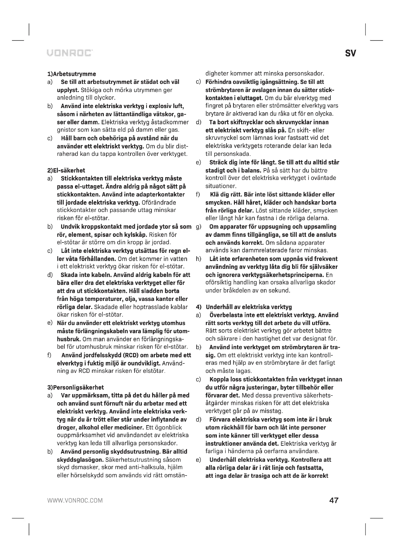 a) Överbelasta inte ett elektriskt verktyg. Använd rätt sorts verktyg till det arbete du vill utföra. Rätt sorts elektriskt verktyg gör arbetet bättre och säkrare i den hastighet det var designat för. b) Använd inte verktyget om strömbrytaren är tra- sig. Om ett elektriskt verktyg inte kan kontroll- eras med hjälp av en strömbrytare är det farligt och måste lagas. c) Koppla loss stickkontakten från verktyget innan du utför några justeringar, byter tillbehör eller förvarar det. Med dessa preventiva säkerhets- åtgärder minskas risken för att det elektriska verktyget går på av misstag. d) Förvara elektriska verktyg som inte är i bruk utom räckhåll för barn och låt inte personer som inte känner till verktyget eller dessa instruktioner använda det. Elektriska verktyg är farliga i händerna på oerfarna användare. e) Underhåll elektriska verktyg. Kontrollera att alla rörliga delar är i rät linje och fastsatta, att inga delar är trasiga och att de är korrekt48