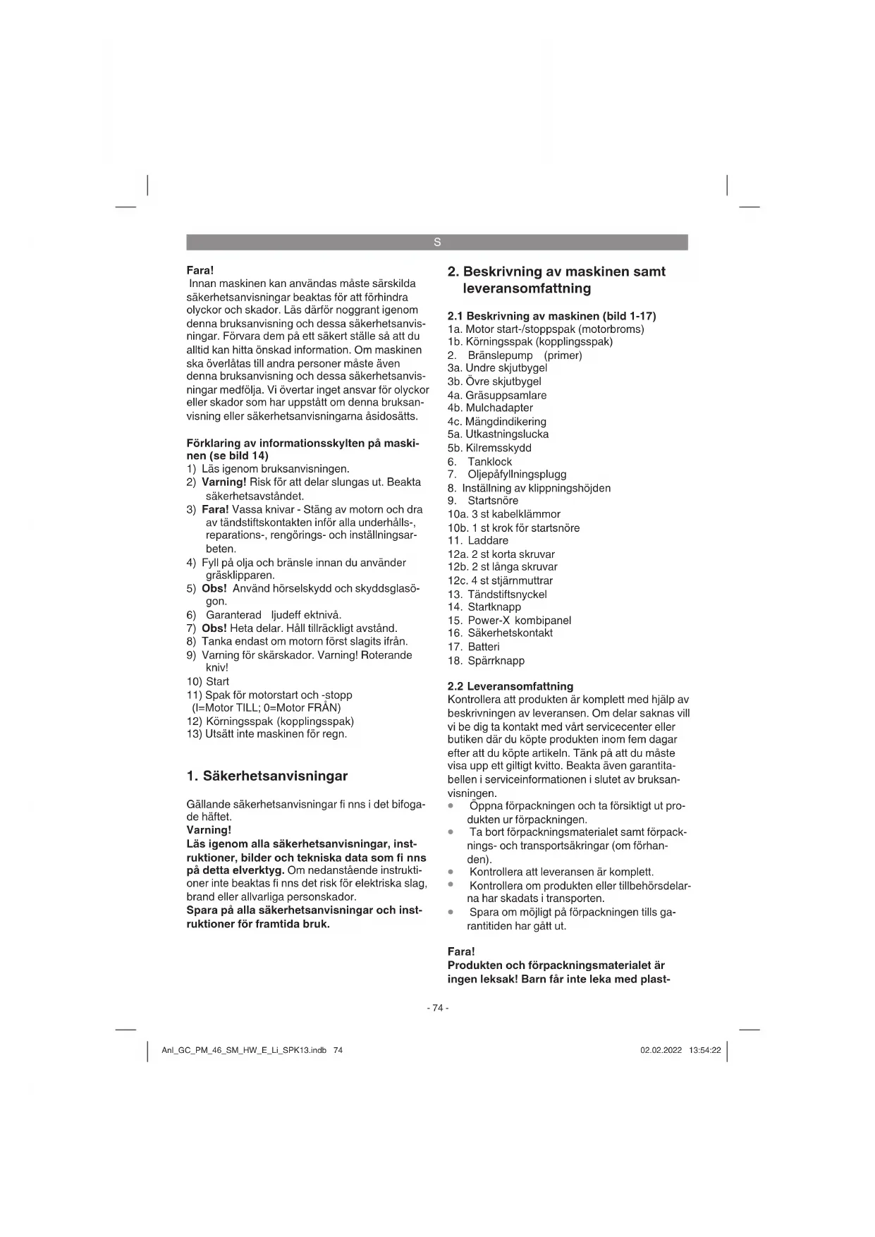 Spara om möjligt på förpackningen tills ga- rantitiden har gått ut. Fara! Produkten och förpackningsmaterialet är ingen leksak! Barn får inte leka med plast- Anl_GC_PM_46_SM_HW_E_Li_SPK13.indb 74Anl_GC_PM_46_SM_HW_E_Li_SPK13.indb 74 02.02.2022 13:54:2202.02.2022 13:54:22S