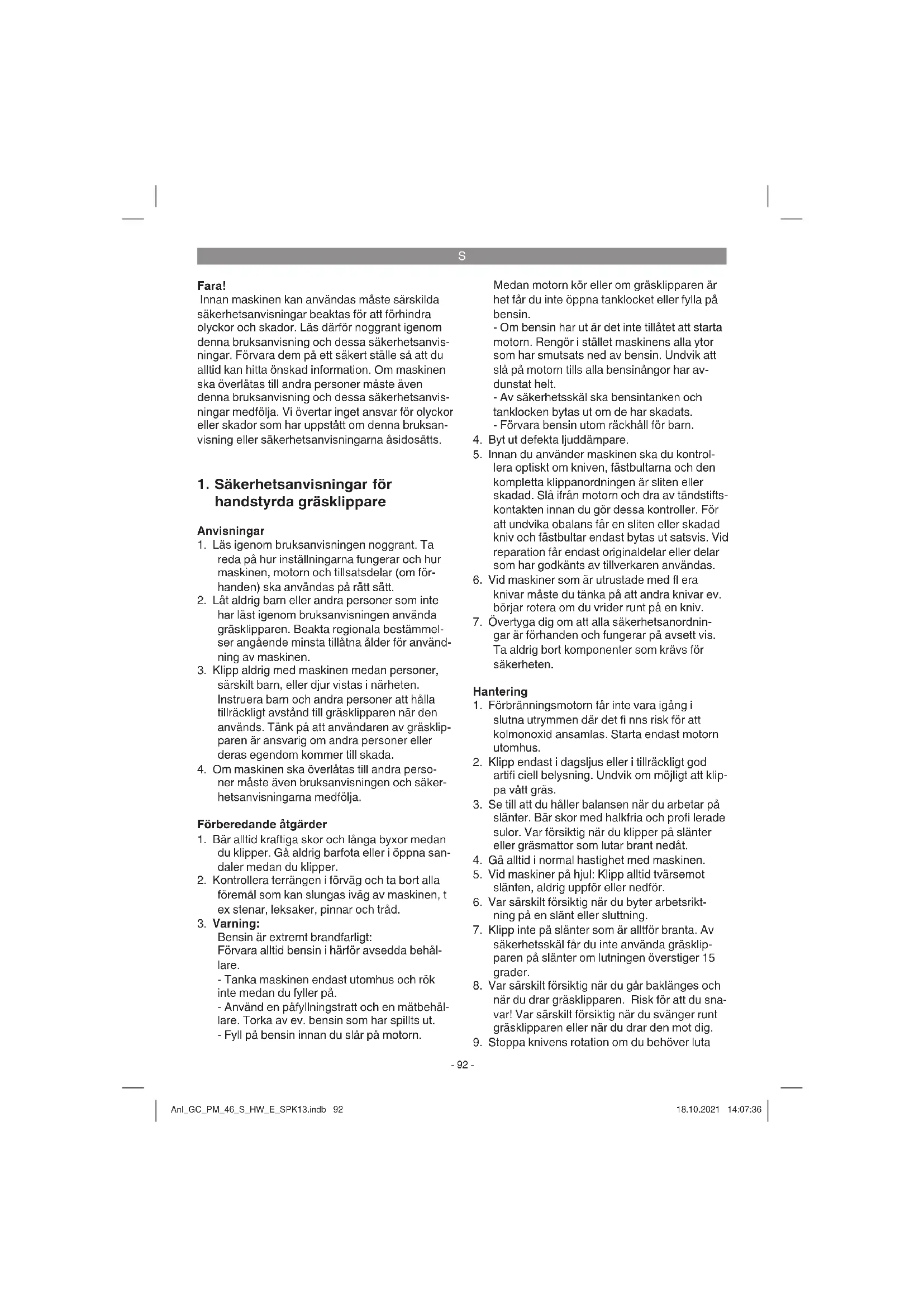 Bensin är extremt brandfarligt: Förvara alltid bensin i härför avsedda behål- lare. - Tanka maskinen endast utomhus och rök inte medan du fyller på. - Använd en påfyllningstratt och en mätbehål- lare. Torka av ev. bensin som har spillts ut. - Fyll på bensin innan du slår på motorn. Medan motorn kör eller om gräsklipparen är het får du inte öppna tanklocket eller fylla på bensin. - Om bensin har ut är det inte tillåtet att starta motorn. Rengör i stället maskinens alla ytor som har smutsats ned av bensin. Undvik att slå på motorn tills alla bensinångor har av- dunstat helt. - Av säkerhetsskäl ska bensintanken och tanklocken bytas ut om de har skadats. - Förvara bensin utom räckhåll för barn.