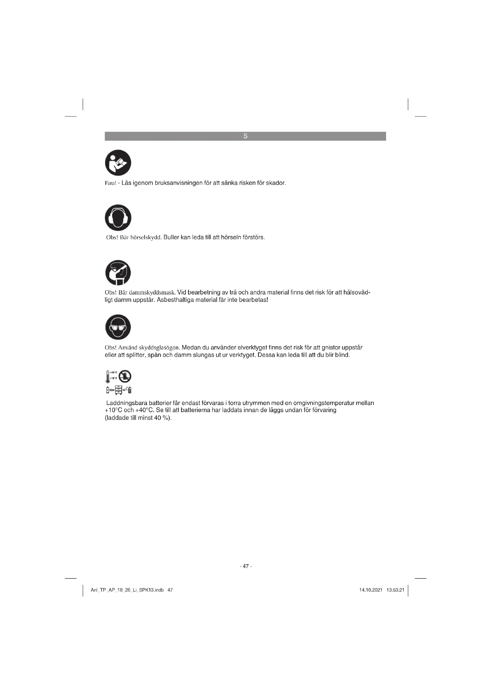 Fara! - Läs igenom bruksanvisningen för att sänka risken för skador. Obs! Bär hörselskydd. Buller kan leda till att hörseln förstörs. Obs! Använd skyddsglasögon. Medan du använder elverktyget fi nns det risk för att gnistor uppstår eller att splitter, spån och damm slungas ut ur verktyget. Dessa kan leda till att du blir blind. Obs! Bär dammskyddsmask. Vid bearbetning av trä och andra material fi nns det risk för att hälsovåd- ligt damm uppstår. Asbesthaltiga material får inte bearbetas! Laddningsbara batterier får endast förvaras i torra utrymmen med en omgivningstemperatur mellan +10°C och +40°C. Se till att batterierna har laddats innan de läggs undan för förvaring (laddade till minst 40 %). Anl_TP_AP_18_26_Li_SPK13.indb 47Anl_TP_AP_18_26_Li_SPK13.indb 47 14.10.2021 13:53:2114.10.2021 13:53:21S