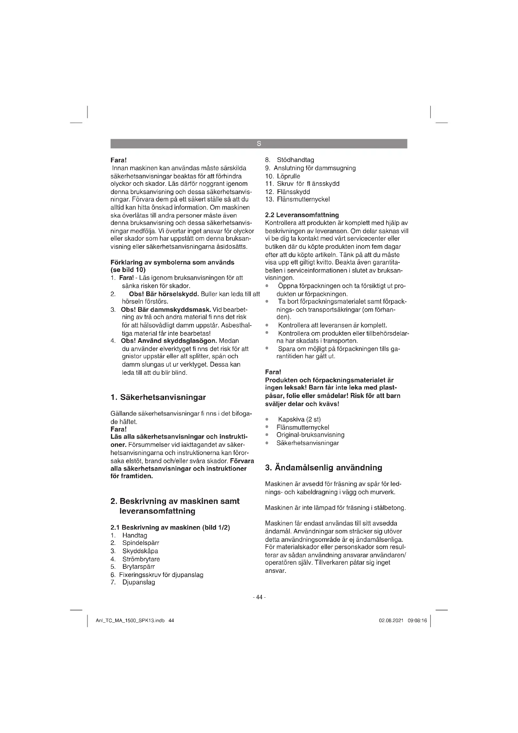 Maskinen är avsedd för fräsning av spår för led- nings- och kabeldragning i vägg och murverk. Maskinen är inte lämpad för fräsning i stålbetong. Maskinen får endast användas till sitt avsedda ändamål. Användningar som sträcker sig utöver detta användningsområde är ej ändamålsenliga. För materialskador eller personskador som resul- terar av sådan användning ansvarar användaren/ operatören själv. Tillverkaren påtar sig inget ansvar. Anl_TC_MA_1500_SPK13.indb 44Anl_TC_MA_1500_SPK13.indb 44 02.08.2021 09:08:1602.08.2021 09:08:16S
