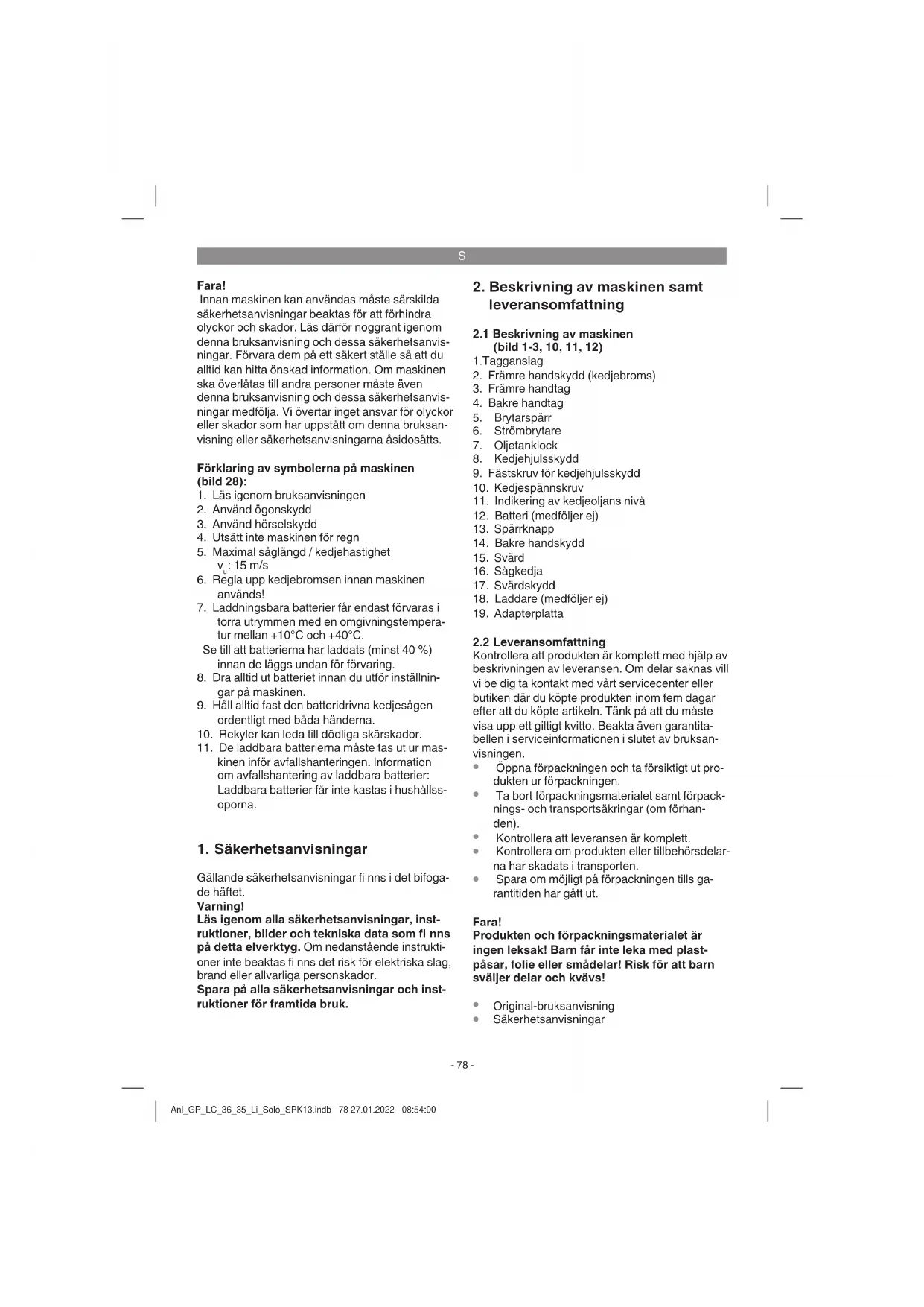 Kontrollera nedanstående punkter varje gång innan du använder maskinen så att du kan arbeta säkert: Kedjesågens skick Granska kedjesågen innan du börjar arbeta. Kont- rollera om kåpan, nätkabeln, sågkedjan eller svär- det har skadats. Använd aldrig en maskin som har uppenbara skador. Anl_GP_LC_36_35_Li_Solo_SPK13.indb 81 27.01.2022 08:54:01S