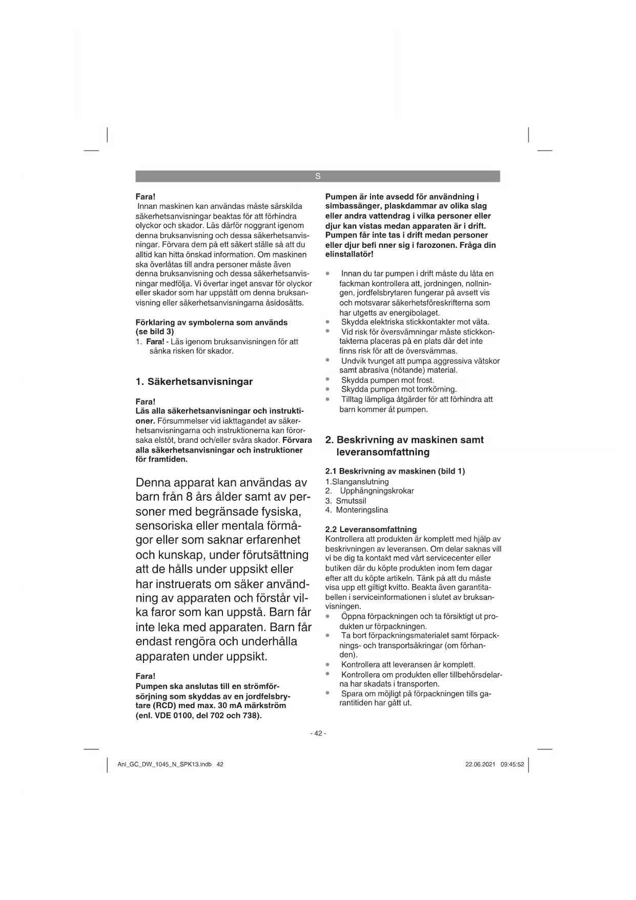 Knyt fast linan (4) i upphängningsöglan (bild 1 / pos. 2). Märk! Innan pumpen tas i drift måste du informera dig om ev. särskilda villkor gäller för installationen! Om t ex ett strömavbrott, nedsmutsning eller en defekt packning kan leda till materiella skador, måste extra skyddsåtgärder installeras. Dessa skyddsåtgärder är till exempel: parallellt löpande pumpar på en separat säkrad strömkrets, fuktighetssensorer för frånkoppling samt liknande säkerhetsanordningar. Kontakta tvunget en behörig VVS-installatör om du är osäker. Den maximala kapaciteten kan endast uppnås med största möjliga ledningsdiameter. Om mindre slangar eller ledningar ansluts kommer kapacite- ten att reduceras. Under installationen, observera att apparaten ald- rig får monteras fritt hängande på tryckledningen eller strömkabeln. Apparaten måste hängas upp på avsedda upphängningskrokar. Anl_GC_DW_1045_N_SPK13.indb 43Anl_GC_DW_1045_N_SPK13.indb 43 22.06.2021 09:45:5322.06.2021 09:45:53S