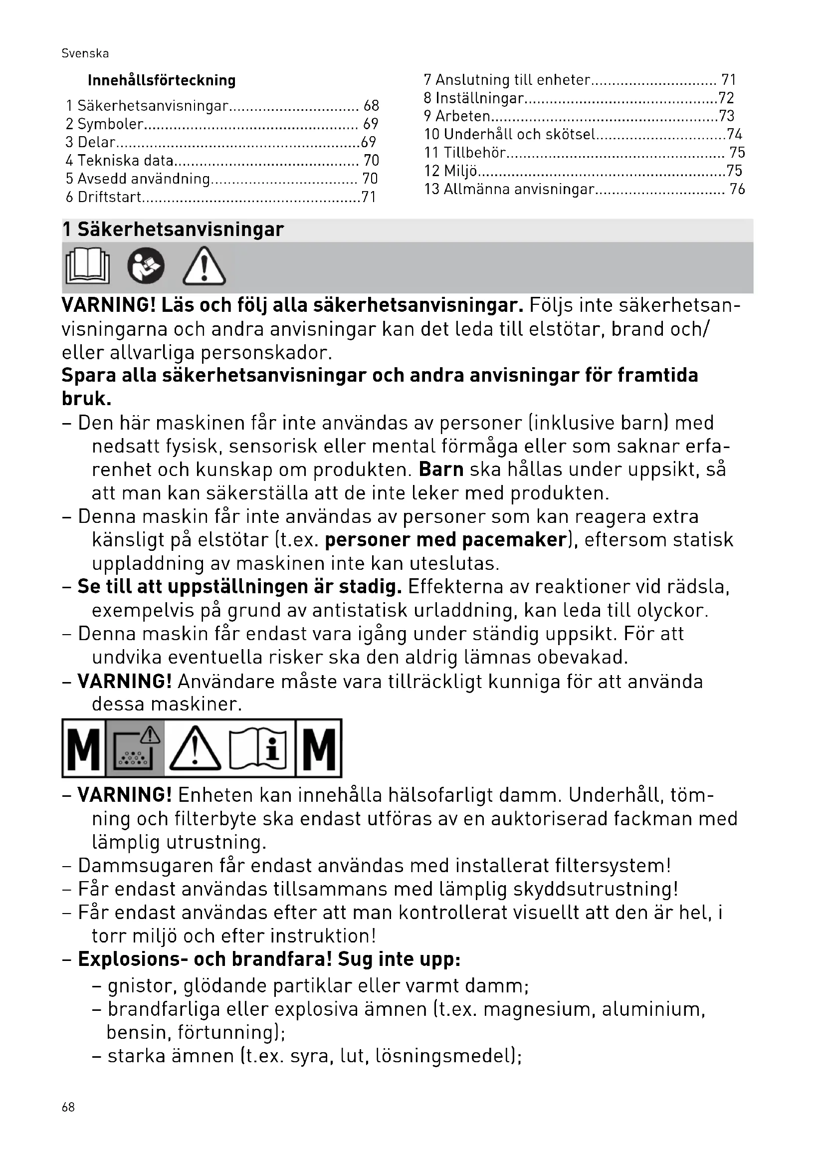 - 13 Allmänna anvisningar 1 Säkerhetsanvisningar VARNING! Läs och följ alla säkerhetsanvisningar. Följs inte säkerhetsan visningarna och andra anvisningar kan det leda till elstötar, brand och/ eller allvarliga personskador. Spara alla säkerhetsanvisningar och andra anvisningar för framtida bruk. – Den här maskinen får inte användas av personer (inklusive barn) med nedsatt fysisk, sensorisk eller mental förmåga eller som saknar erfa renhet och kunskap om produkten. Barn ska hållas under uppsikt, så att man kan säkerställa att de inte leker med produkten. – Denna maskin får inte användas av personer som kan reagera extra känsligt på elstötar (t.ex. personer med pacemaker), eftersom statisk uppladdning av maskinen inte kan uteslutas. – Se till att uppställningen är stadig. Effekterna av reaktioner vid rädsla, exempelvis på grund av antistatisk urladdning, kan leda till olyckor. – Denna maskin får endast vara igång under ständig uppsikt. För att undvika eventuella risker ska den aldrig lämnas obevakad. – VARNING! Användare måste vara tillräckligt kunniga för att använda dessa maskiner. – VARNING! Enheten kan innehålla hälsofarligt damm. Underhåll, töm ning och filterbyte ska endast utföras av en auktoriserad fackman med lämplig utrustning. – Dammsugaren får endast användas med installerat filtersystem! – Får endast användas tillsammans med lämplig skyddsutrustning! – Får endast användas efter att man kontrollerat visuellt att den är hel, i torr miljö och efter instruktion! – Explosions- och brandfara! Sug inte upp: – gnistor, glödande partiklar eller varmt damm; – brandfarliga eller explosiva ämnen (t.ex. magnesium, aluminium, bensin, förtunning); – starka ämnen (t.ex. syra, lut, lösningsmedel); Svenska 68– ämnen som kan reagera kemiskt och bilda värme, syror/baser, gaser osv. (exempelvis reaktiva tvåkomponentsmaterial, aluminium och vat ten). – Nationella säkerhetsföreskrifter samt materialtillverkarens anvisningar ska följas! – VARNING! Eluttaget på maskinen får endast användas för de ändamål som anges i anvisningarna. – Kontrollera kontakten, eluttaget, kabeln och filtret regelbundet för att undvika fara. Skadade elkomponenter måste alltid bytas ut av en aukto riserad serviceverkstad. – Före rengöring eller underhåll, vid byte av förbrukningsartiklar eller om maskinen modifieras måste man alltid dra ut nätkontakten ur elut taget. – OBS! Rengör vattennivåbegränsningen regelbundet och kontrollera om det finns tecken på skador. – VARNING! Stäng av maskinen direkt om skum eller vätska tränger ut. – Använd endast originalsugslangen från Festool. – Observera arbetsmiljön och var rädd om dig själv och andra när ma skinen transporteras och används. Se till exempel till att ingen kan snubbla på sugslangen eller nätkabeln. – Dammsugaren ska endast bäras i det avsedda handtaget. – Får inte lyftas eller transporteras med lyftkrok eller telfer. – Håll förpackningsplasten borta från barn. Det finns risk för kvävning. 2 Symboler Varning för allmän risk Varning för elstötar Läs bruksanvisningen och säkerhets anvisningarna! Använd andningsskydd. Tips, information Bruksanvisning Varning! Maskinen kan innehålla häl sofarligt damm! Lämplig för avskiljning av damm med ett exponeringsgränsvärde över 0,1mg/m p. 76