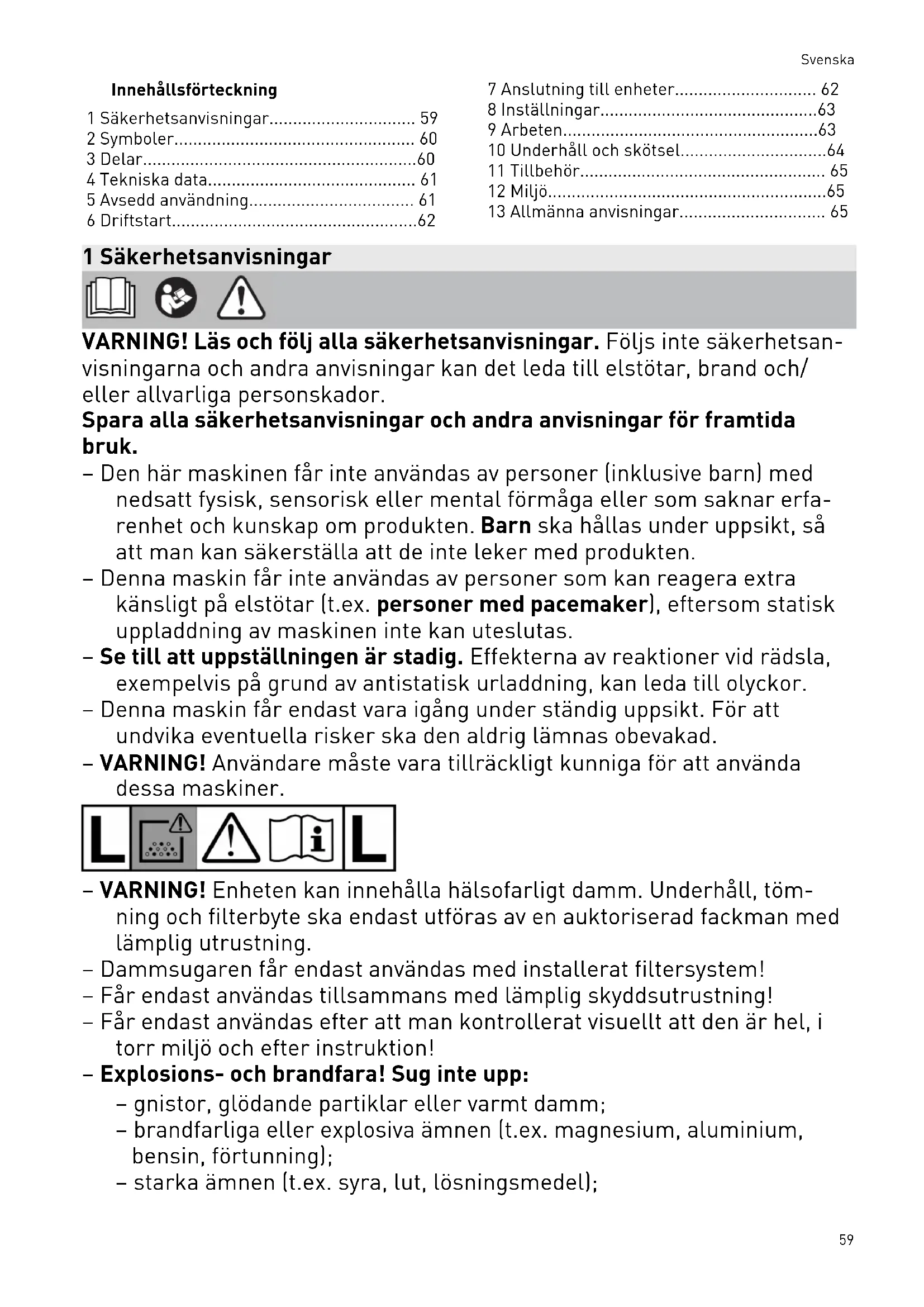 - 13 Allmänna anvisningar 1 Säkerhetsanvisningar VARNING! Läs och följ alla säkerhetsanvisningar. Följs inte säkerhetsan visningarna och andra anvisningar kan det leda till elstötar, brand och/ eller allvarliga personskador. Spara alla säkerhetsanvisningar och andra anvisningar för framtida bruk. – Den här maskinen får inte användas av personer (inklusive barn) med nedsatt fysisk, sensorisk eller mental förmåga eller som saknar erfa renhet och kunskap om produkten. Barn ska hållas under uppsikt, så att man kan säkerställa att de inte leker med produkten. – Denna maskin får inte användas av personer som kan reagera extra känsligt på elstötar (t.ex. personer med pacemaker), eftersom statisk uppladdning av maskinen inte kan uteslutas. – Se till att uppställningen är stadig. Effekterna av reaktioner vid rädsla, exempelvis på grund av antistatisk urladdning, kan leda till olyckor. – Denna maskin får endast vara igång under ständig uppsikt. För att undvika eventuella risker ska den aldrig lämnas obevakad. – VARNING! Användare måste vara tillräckligt kunniga för att använda dessa maskiner. – VARNING! Enheten kan innehålla hälsofarligt damm. Underhåll, töm ning och filterbyte ska endast utföras av en auktoriserad fackman med lämplig utrustning. – Dammsugaren får endast användas med installerat filtersystem! – Får endast användas tillsammans med lämplig skyddsutrustning! – Får endast användas efter att man kontrollerat visuellt att den är hel, i torr miljö och efter instruktion! – Explosions- och brandfara! Sug inte upp: – gnistor, glödande partiklar eller varmt damm; – brandfarliga eller explosiva ämnen (t.ex. magnesium, aluminium, bensin, förtunning); – starka ämnen (t.ex. syra, lut, lösningsmedel); Svenska 59– ämnen som kan reagera kemiskt och bilda värme, syror/baser, gaser osv. (exempelvis reaktiva tvåkomponentsmaterial, aluminium och vat ten). – Nationella säkerhetsföreskrifter samt materialtillverkarens anvisningar ska följas! – VARNING! Eluttaget på maskinen får endast användas för de ändamål som anges i anvisningarna. – Kontrollera kontakten, eluttaget, kabeln och filtret regelbundet för att undvika fara. Skadade elkomponenter måste alltid bytas ut av en aukto riserad serviceverkstad. – Före rengöring eller underhåll, vid byte av förbrukningsartiklar eller om maskinen modifieras måste man alltid dra ut nätkontakten ur elut taget. – OBS! Rengör vattennivåbegränsningen regelbundet och kontrollera om det finns tecken på skador. – VARNING! Stäng av maskinen direkt om skum eller vätska tränger ut. – Använd endast originalsugslangen från Festool. – Observera arbetsmiljön och var rädd om dig själv och andra när ma skinen transporteras och används. Se till exempel till att ingen kan snubbla på sugslangen eller nätkabeln. – Dammsugaren ska endast bäras i det avsedda handtaget. – Får inte lyftas eller transporteras med lyftkrok eller telfer. – Håll förpackningsplasten borta från barn. Det finns risk för kvävning. 2 Symboler Varning för allmän risk Varning för elstötar Läs bruksanvisningen och säkerhets anvisningarna! Använd andningsskydd. Tips, information Bruksanvisning Varning! Maskinen kan innehålla häl sofarligt damm! DammklassL (låg risk), lämplig för avskiljning av damm med ett exponer ingsgränsvärde över 1mg/m p. 65