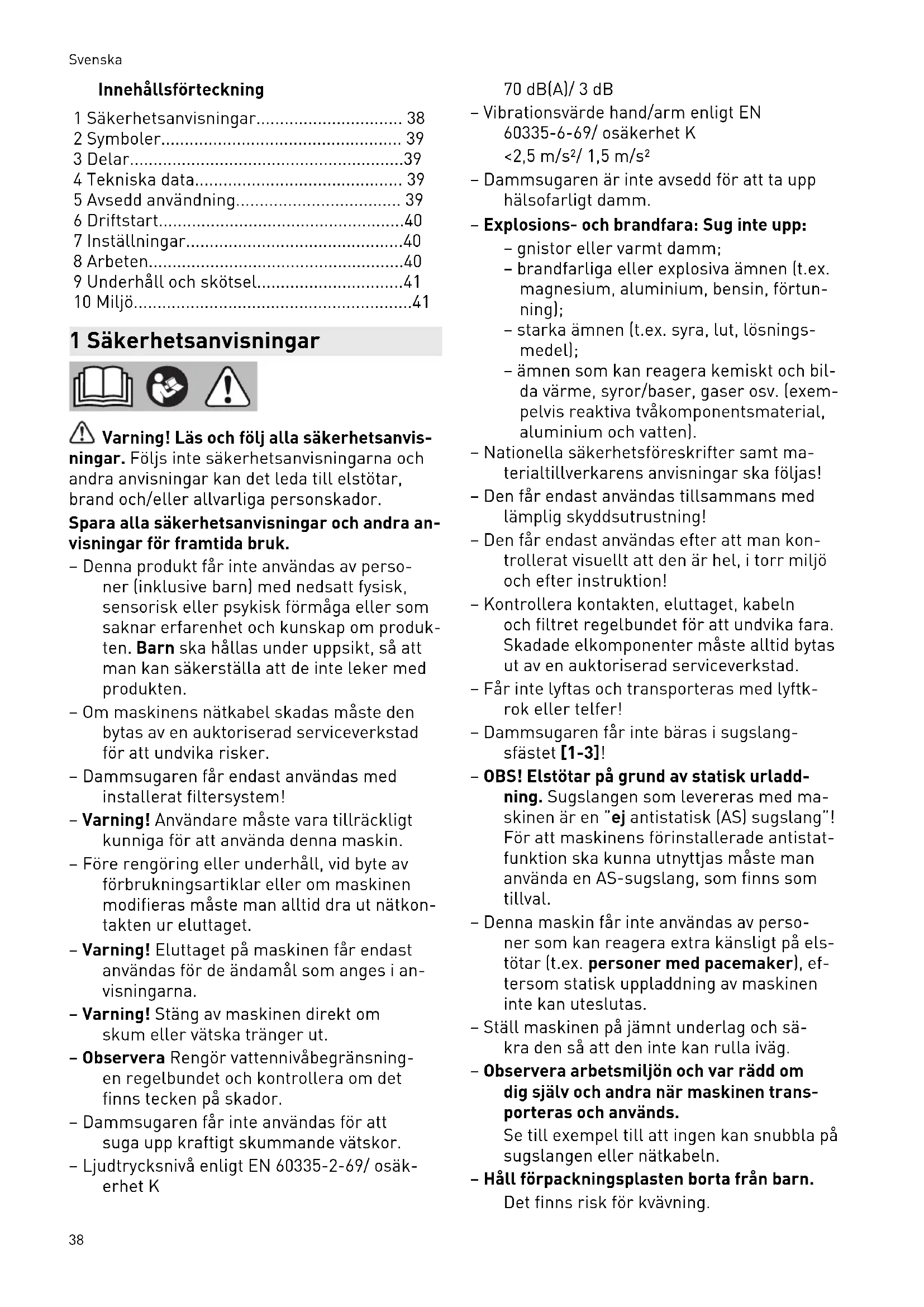 - 10 Miljö 1 Säkerhetsanvisningar Varning! Läs och följ alla säkerhetsanvis ningar. Följs inte säkerhetsanvisningarna och andra anvisningar kan det leda till elstötar, brand och/eller allvarliga personskador. Spara alla säkerhetsanvisningar och andra an visningar för framtida bruk. – Denna produkt får inte användas av perso ner (inklusive barn) med nedsatt fysisk, sensorisk eller psykisk förmåga eller som saknar erfarenhet och kunskap om produk ten. Barn ska hållas under uppsikt, så att man kan säkerställa att de inte leker med produkten. – Om maskinens nätkabel skadas måste den bytas av en auktoriserad serviceverkstad för att undvika risker. – Dammsugaren får endast användas med installerat filtersystem! – Varning! Användare måste vara tillräckligt kunniga för att använda denna maskin. – Före rengöring eller underhåll, vid byte av förbrukningsartiklar eller om maskinen modifieras måste man alltid dra ut nätkon takten ur eluttaget. – Varning! Eluttaget på maskinen får endast användas för de ändamål som anges i an visningarna. – Varning! Stäng av maskinen direkt om skum eller vätska tränger ut. – Observera Rengör vattennivåbegränsning en regelbundet och kontrollera om det finns tecken på skador. – Dammsugaren får inte användas för att suga upp kraftigt skummande vätskor. – Ljudtrycksnivå enligt EN 60335-2-69/ osäk erhet K 70 dB(A)/ 3 dB – Vibrationsvärde hand/arm enligt EN 60335-6-69/ osäkerhet K <2,5 m/s²/ 1,5 m/s² – Dammsugaren är inte avsedd för att ta upp hälsofarligt damm. – Explosions- och brandfara: Sug inte upp: – gnistor eller varmt damm; – brandfarliga eller explosiva ämnen (t.ex. magnesium, aluminium, bensin, förtun ning); – starka ämnen (t.ex. syra, lut, lösnings medel); – ämnen som kan reagera kemiskt och bil da värme, syror/baser, gaser osv. (exem pelvis reaktiva tvåkomponentsmaterial, aluminium och vatten). – Nationella säkerhetsföreskrifter samt ma terialtillverkarens anvisningar ska följas! – Den får endast användas tillsammans med lämplig skyddsutrustning! – Den får endast användas efter att man kon trollerat visuellt att den är hel, i torr miljö och efter instruktion! – Kontrollera kontakten, eluttaget, kabeln och filtret regelbundet för att undvika fara. Skadade elkomponenter måste alltid bytas ut av en auktoriserad serviceverkstad. – Får inte lyftas och transporteras med lyftk rok eller telfer! – Dammsugaren får inte bäras i sugslang sfästet [1-3]! – OBS! Elstötar på grund av statisk urladd ning. Sugslangen som levereras med ma skinen är en ”ej antistatisk (AS) sugslang”! För att maskinens förinstallerade antistat funktion ska kunna utnyttjas måste man använda en AS-sugslang, som finns som tillval. – Denna maskin får inte användas av perso ner som kan reagera extra känsligt på els tötar (t.ex. personer med pacemaker), ef tersom statisk uppladdning av maskinen inte kan uteslutas. – Ställ maskinen på jämnt underlag och sä kra den så att den inte kan rulla iväg. – Observera arbetsmiljön och var rädd om dig själv och andra när maskinen trans porteras och används. Se till exempel till att ingen kan snubbla på sugslangen eller nätkabeln. – Håll förpackningsplasten borta från barn. Det finns risk för kvävning. Svenska 382 Symboler Varning för allmän risk Varning för elstötar Läs bruksanvisningen och säkerhets anvisningarna! Kasta den inte i hushållssoporna. Dra ut nätkontakten Använd andningsskydd! Förbjudet att kliva upp 3 Delar [1-1] Eluttag [1-2] Kabel- och tillbehörsdepå [1-3] Sugslangsfäste [1-4] Handtag [1-5] Låsning [1-6] Filterlåda [1-7] Låsklämma [1-8] Utblås [1-9] Smutsbehållare [1-10] Strömbrytare [1-11] MAN-knapp [1-12] Reglage för sugeffekt De angivna bilderna finns i början av bruksan visningen. 4 Tekniska data Dammsugare Effekt 350–1200 W Anslutningseffekt i eluttag max. EU CH, DK p. 41