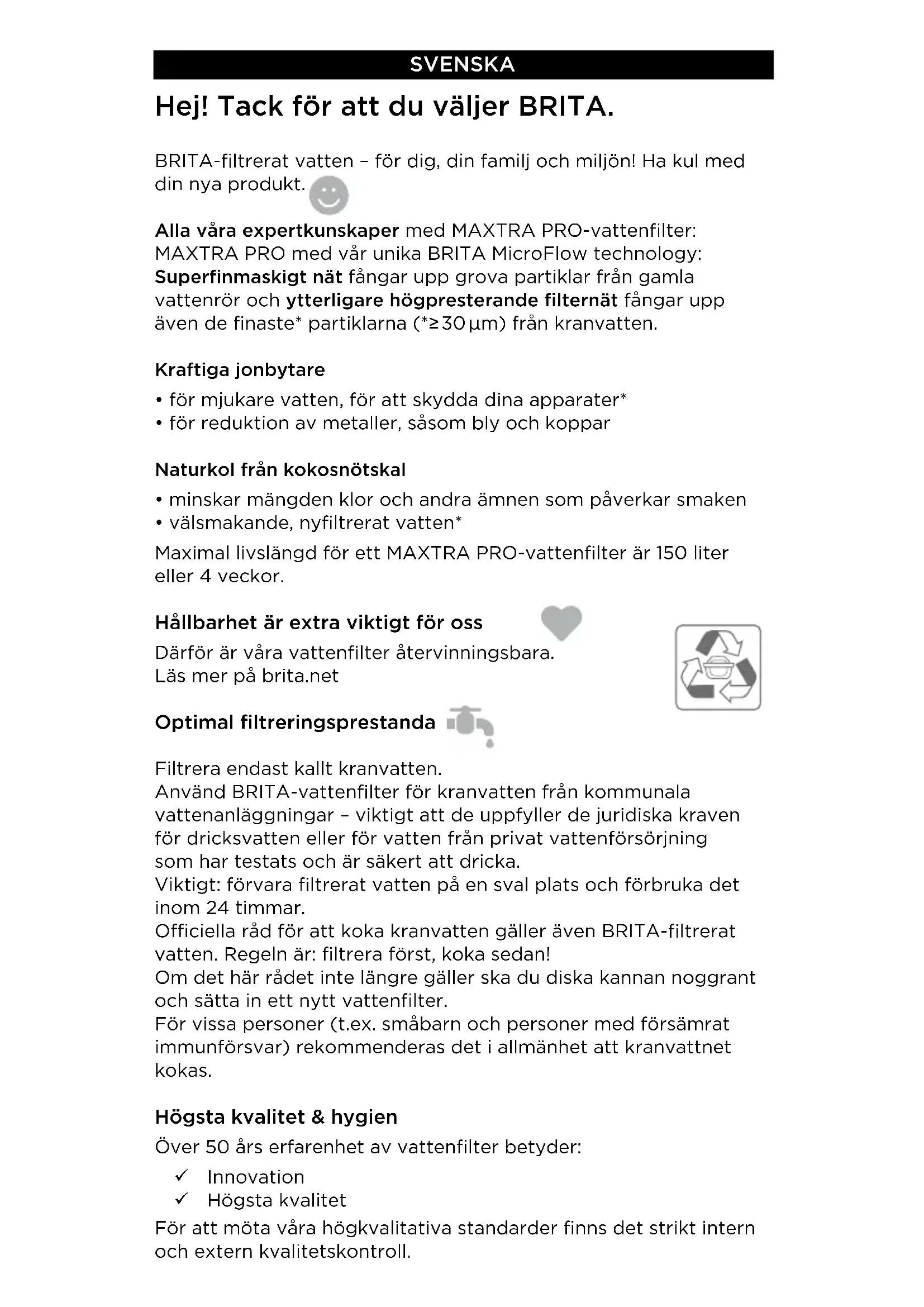 - välsmakande, nyfiltrerat vatten* Maximal livslängd för ett MAXTRA PRO-vattenfilter är 150 liter eller 4 veckor. Hållbarhet är extra viktigt för oss Därför är våra vattenfilter återvinningsbara. Läs mer på brita.net Optimal filtreringsprestanda Filtrera endast kallt kranvatten. Använd BRITA-vattenfilter för kranvatten från kommunala vattenanläggningar – viktigt att de uppfyller de juridiska kraven för dricksvatten eller för vatten från privat vattenförsörjning som har testats och är säkert att dricka. Viktigt: förvara filtrerat vatten på en sval plats och förbruka det inom 24 timmar. Ociella råd för att koka kranvatten gäller även BRITA-filtrerat vatten. Regeln är: filtrera först, koka sedan! Om det här rådet inte längre gäller ska du diska kannan noggrant och sätta in ett nytt vattenfilter. För vissa personer (t.ex. småbarn och personer med försämrat immunförsvar) rekommenderas det i allmänhet att kranvattnet kokas. Högsta kvalitet & hygien Över 50 års erfarenhet av vattenfilter betyder: 9 Innovation 9 Högsta kvalitet För att möta våra högkvalitativa standarder finns det strikt intern och extern kvalitetskontroll.Varje MAXTRA PRO-vattenfilter genomgår behandling med varm ånga i hygiensyfte under tillverkning och förpackas sedan i skyddande folie. (Obs: vattenfiltret kan bli fuktigt på grund av kondens efter ångbehandlingen). Filtermaterialet för MAXTRA PRO-vattenfiltret genomgår en specialbehandling med silver av hygienskäl. En liten mängd silver kan frigöras i vattnet. Det här ligger i linje med rekommendationerna från världshälsoorganisationen, WHO. BRITA rekommenderar att du byter vattenfilter regelbundet. Följ rekommenderade rengöringsprocedurer och råd kring förberedning av filter (kapitel 1–7). Kannan ska rengöras med jämna mellanrum. Obs! Om kannan inte används under en period tar du bort vattenfiltret, tömmer kannan och byter vattenfiltret som sitter löst i den tomma tratten. Se kapitel 7 ”Byta MAXTRA PRO-vattenfilter”. Drift – mycket enkelt