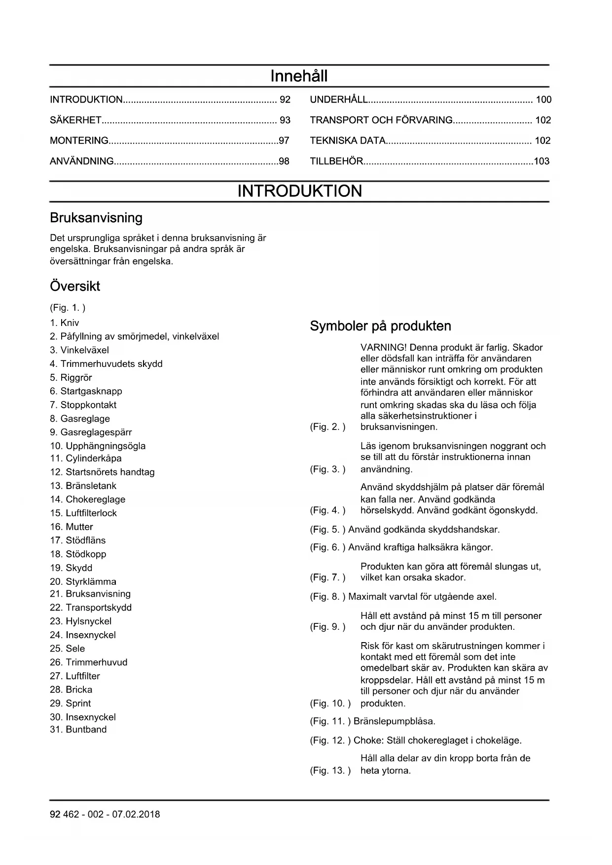 Symboler på produkten (Fig. 2. ) VARNING! Denna produkt är farlig. Skador eller dödsfall kan inträffa för användaren eller människor runt omkring om produkten inte används försiktigt och korrekt. För att förhindra att användaren eller människor runt omkring skadas ska du läsa och följa alla säkerhetsinstruktioner i bruksanvisningen. (Fig. 3. ) Läs igenom bruksanvisningen noggrant och se till att du förstår instruktionerna innan användning. (Fig. 4. ) Använd skyddshjälm på platser där föremål kan falla ner. Använd godkända hörselskydd. Använd godkänt ögonskydd. (Fig. 5. ) Använd godkända skyddshandskar. (Fig. 6. ) Använd kraftiga halksäkra kängor. (Fig. 7. ) Produkten kan göra att föremål slungas ut, vilket kan orsaka skador. (Fig. 8. ) Maximalt varvtal för utgående axel. (Fig. 9. ) Håll ett avstånd på minst 15 m till personer och djur när du använder produkten. (Fig. 10. ) Risk för kast om skärutrustningen kommer i kontakt med ett föremål som det inte omedelbart skär av. Produkten kan skära av kroppsdelar. Håll ett avstånd på minst 15 m till personer och djur när du använder produkten. (Fig. 11. ) Bränslepumpblåsa. (Fig. 12. ) Choke: Ställ chokereglaget i chokeläge. (Fig. 13. ) Håll alla delar av din kropp borta från de heta ytorna. 92 462 - 002 - 07.02.2018(Fig. 14. ) Emission av buller till omgivningen enligt EU:s direktiv. Produktens emission anges i avsnittet Tekniska data och på etiketten. (Fig. 15. ) Produkten överensstämmer med gällande EG-direktiv. Notera: Övriga symboler/dekaler på produkten avser specifika krav för certifieringar på andra kommersiella marknader. Produktansvar Enligt lagstiftningen för produktansvar ansvarar vi inte för skador som vår produkt orsakar om: