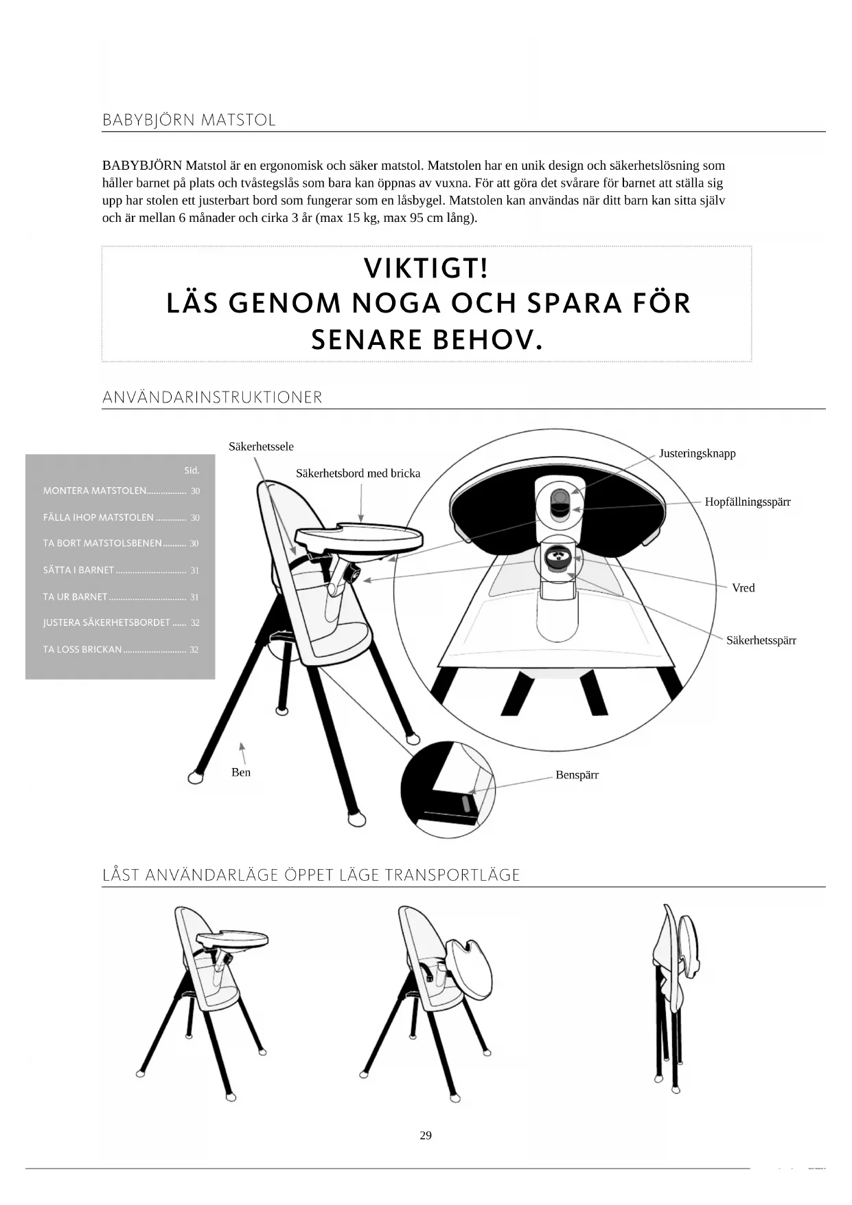 ANVÄNDARINSTRUKTIONER LÅST ANVÄNDARLÄGE ÖPPET LÄGE TRANSPORTLÄGE BABYBJÖRN Matstol är en ergonomisk och säker matstol. Matstolen har en unik design och säkerhetslösning som håller barnet på plats och tvåstegslås som bara kan öppnas av vuxna. För att göra det svårare för barnet att ställa sig upp har stolen ett justerbart bord som fungerar som en låsbygel. Matstolen kan användas när ditt barn kan sitta själv och är mellan 6 månader och cirka 3 år (max 15 kg, max 95 cm lång). VIKTIGT! LÄS GENOM NOGA OCH SPARA FÖR SENARE BEHOV. Säkerhetsbord med bricka Justeringsknapp Hopfällningsspärr Vred Benspärr Ben Säkerhetsspärr MONTERA MATSTOLEN................. 30