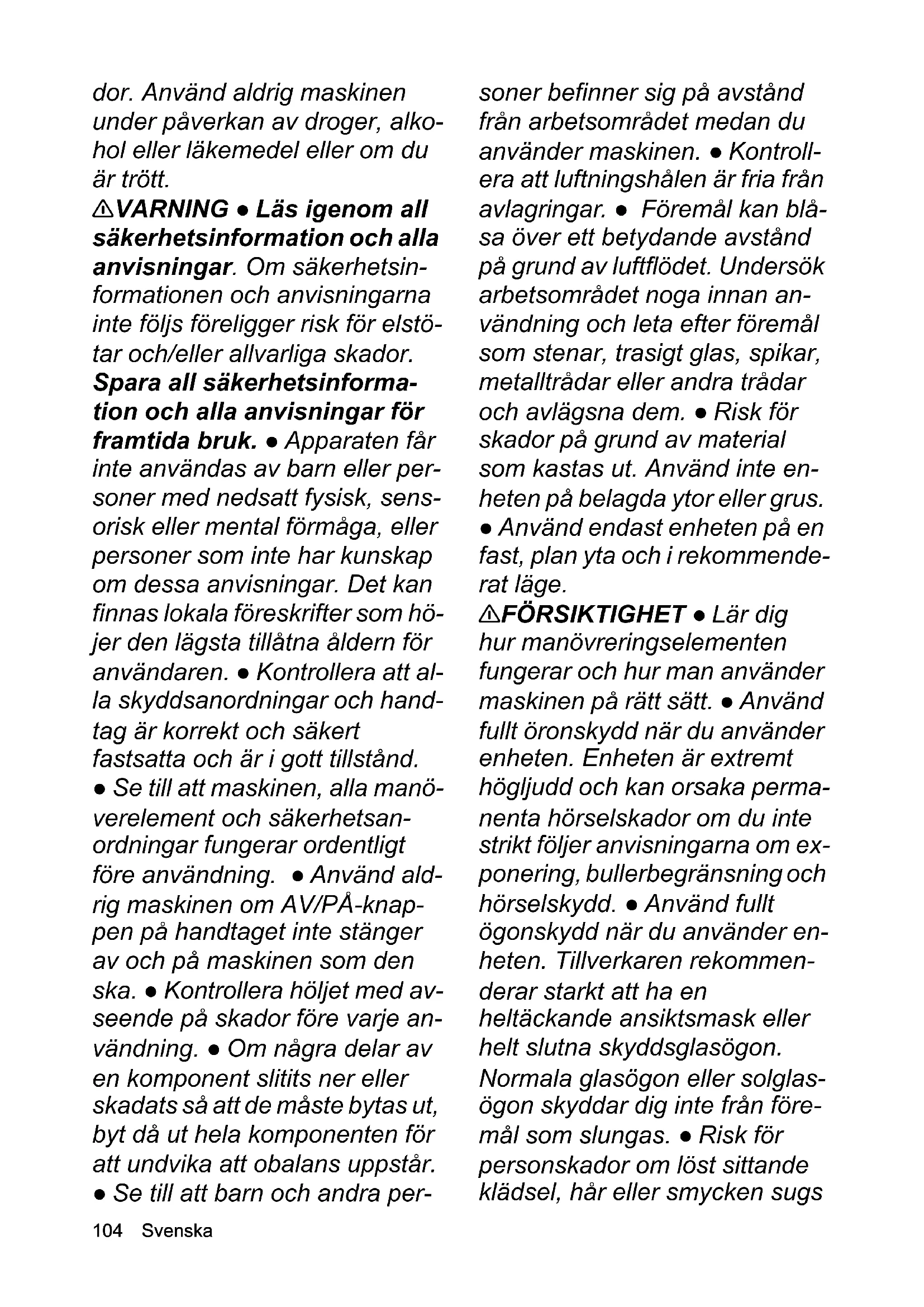 - EU-försäkran om överensstämmelse Chairman of the Board of ManagementDirector Regulatory Affairs & Certification H. Jenner S. Reiser104 Svenska dor. Använd aldrig maskinen under påverkan av droger, alko- hol eller läkemedel eller om du är trött. 몇 VARNING ● Läs igenom all säkerhetsinformation och alla anvisningar. Om säkerhetsin- formationen och anvisningarna inte följs föreligger risk för elstö- tar och/eller allvarliga skador. Spara all säkerhetsinforma- tion och alla anvisningar för framtida bruk. ● Apparaten får inte användas av barn eller per- soner med nedsatt fysisk, sens- orisk eller mental förmåga, eller personer som inte har kunskap om dessa anvisningar. Det kan finnas lokala föreskrifter som hö- jer den lägsta tillåtna åldern för användaren. ● Kontrollera att al- la skyddsanordningar och hand- tag är korrekt och säkert fastsatta och är i gott tillstånd. ● Se till att maskinen, alla manö- verelement och säkerhetsan- ordningar fungerar ordentligt före användning. ● Använd ald- rig maskinen om AV/PÅ-knap- pen på handtaget inte stänger av och på maskinen som den ska. ● Kontrollera höljet med av- seende på skador före varje an- vändning. ● Om några delar av en komponent slitits ner eller skadats så att de måste bytas ut, byt då ut hela komponenten för att undvika att obalans uppstår. ● Se till att barn och andra per- soner befinner sig på avstånd från arbetsområdet medan du använder maskinen. ● Kontroll- era att luftningshålen är fria från avlagringar. ● Föremål kan blå- sa över ett betydande avstånd på grund av luftflödet. Undersök arbetsområdet noga innan an- vändning och leta efter föremål som stenar, trasigt glas, spikar, metalltrådar eller andra trådar och avlägsna dem. ● Risk för skador på grund av material som kastas ut. Använd inte en- heten på belagda ytor eller grus. ● Använd endast enheten på en fast, plan yta och i rekommende- rat läge. 몇 FÖRSIKTIGHET ● Lär dig hur manövreringselementen fungerar och hur man använder maskinen på rätt sätt. ● Använd fullt öronskydd när du använder enheten. Enheten är extremt högljudd och kan orsaka perma- nenta hörselskador om du inte strikt följer anvisningarna om ex- ponering, bullerbegränsning och hörselskydd. ● Använd fullt ögonskydd när du använder en- heten. Tillverkaren rekommen- derar starkt att ha en heltäckande ansiktsmask eller helt slutna skyddsglasögon. Normala glasögon eller solglas- ögon skyddar dig inte från före- mål som slungas. ● Risk för personskador om löst sittande klädsel, hår eller smycken sugsSvenska 105 in i maskinens luftinlopp. Sätt upp långt hår över axelnivån. ● Använd grova långbyxor, fasta skor och handskar med bra passform när du arbetar med maskinen. Arbeta aldrig barfota. Använd inte smycken, sandaler eller kortbyxor. OBSERVERA ● Den som an- vänder maskinen bär ansvaret för olyckor som sker med andra personer eller deras egendom. Hänvisning ● I vissa områden kan det finnas föreskrifter som begränsar användningen av denna maskin. Rådgör med din lokala ansvariga myndighet. ● Låt skadade eller oläsliga var- ningsskyltar på maskinen bytas ut av auktoriserad kundtjänst. ● Åtgärda smuts med en räfsa och kvast innan du använder batterisugblåsen. Säker användning FARA ● Det är förbjudet att använda maskinen i explosions- farliga områden. 몇 VARNING ● Håll ett minimi- avstånd på 15 m till personer och djur. Stoppa maskinen om någon kommer för nära. ● Håll ansikte och kropp borta från till- förselöppningen. ● Se till att matningskammaren är tom inn- an du startar maskinen. ● Håll händer och andra kroppsdelar borta från matningskammaren, utmatningsöppningen och andra rörliga delar. ● Använd inte ma- skinen om det finns risk för att blixten slår ner. ● Du måste ha ständig och obehindrad uppsikt över arbetsområdet för att iden- tifiera möjliga risker. Använd maskinen endast vid god belys- ning. ● Spring inte när du arbe- tar med maskinen, utan gå i vanlig takt. Gå inte bakåt. Und- vik onormal kroppshållning, se till att du står stadigt och håller balansen. ● Använd aldrig ma- skinen med defekta säkerhets- anordningar eller utan säkerhetsanordningar som t.ex. monterade avfallsuppsamlare. ● Stäng omedelbart av maski- nen och kontrollera om den är skadad eller identifiera orsaken till eventuella vibrationer om ma- skinen har tappats, utsatts för en stöt eller vibrerar onormalt. Låt en auktoriserad verkstad repa- rera maskinen eller byt maski- nen om den är skadad. ● Stäng omedelbart av maskinen vid olycka eller driftstörning och ta bort batteripaketet. Maskinen får inte tas i bruk förrän den har kontrollerats av auktoriserad service. ● Risk för skada på ro- terande delar. Stäng av motorn, ta ut batteripaketet och kontroll- era att alla rörliga delar har stan- nat helt: Innan du lämnar maskinen obevakad.106 Svenska Innan du tar bort blockeringar eller rengör röret. Innan du kontrollerar maski- nen efter att den har träffats av ett främmande föremål. Innan du kontrollerar, under- håller eller arbetar på maski- nen. 몇 FÖRSIKTIGHET ● Använd- ning av liknande verktyg i omgiv- ningen ökar risken för hörselskador och risken för att missa potentiella faror, t.ex. per- son som beträder arbetsområ- det. ● Gör inga ändringar på maskinen och använd bara till- behör och reservdelar som re- kommenderas av tillverkaren. Hänvisning ● Använd endast maskinen vid lämpliga tider. Be- akta även lokala föreskrifter och förordningar. Vid drift tidigt på morgonen eller sent på kvällen kan andra personer störas. Säker drift batteriblås 몇 FÖRSIKTIGHET ● Hälsorisk på grund av inandning av damm. Använd skyddsmask när du arbetar med maskinen. ● Fukta dammiga ytor för att minska dammnivån. ● Använd inte maskinen i närheten av