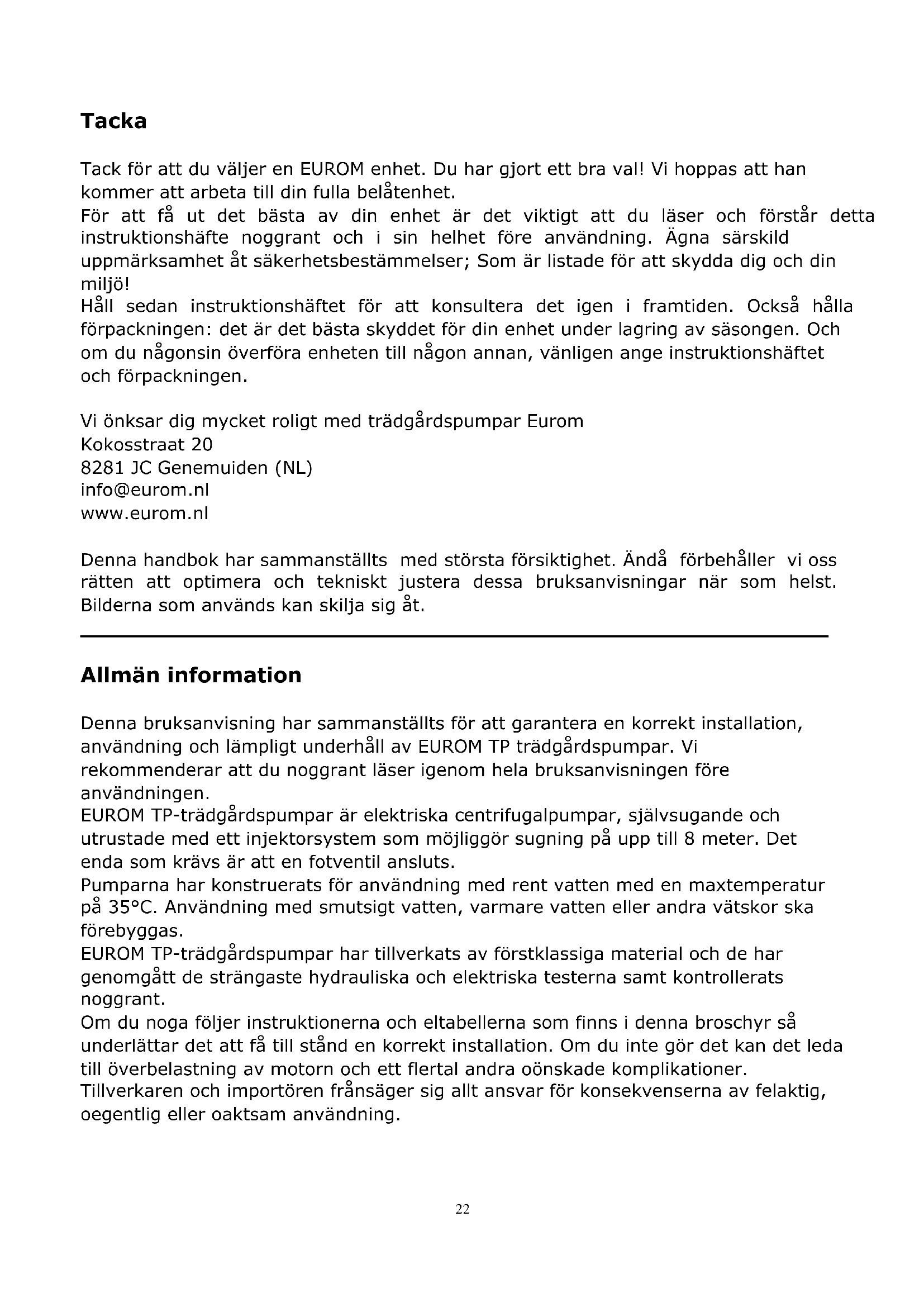Allmän information Denna bruksanvisning har sammanställts för att garantera en korrekt installation, användning och lämpligt underhåll av EUROM TP trädgårdspumpar. Vi rekommenderar att du noggrant läser igenom hela bruksanvisningen före användningen. EUROM TP-trädgårdspumpar är elektriska centrifugalpumpar, självsugande och utrustade med ett injektorsystem som möjliggör sugning på upp till 8 meter. Det enda som krävs är att en fotventil ansluts. Pumparna har konstruerats för användning med rent vatten med en maxtemperatur på 35°C. Användning med smutsigt vatten, varmare vatten eller andra vätskor ska förebyggas. EUROM TP-trädgårdspumpar har tillverkats av förstklassiga material och de har genomgått de strängaste hydrauliska och elektriska testerna samt kontrollerats noggrant. Om du noga följer instruktionerna och eltabellerna som finns i denna broschyr så underlättar det att få till stånd en korrekt installation. Om du inte gör det kan det leda till överbelastning av motorn och ett flertal andra oönskade komplikationer. Tillverkaren och importören frånsäger sig allt ansvar för konsekvenserna av felaktig, oegentlig eller oaktsam användning.23 Tekniska data Typ TP800P TP800R TP1200R Effekt 800 W 800 W 1200 W Kapacitet max 53 l/m 53 l/m 63 l/m Tryckhöjd 40 m 40 m 48 m Sugningshöjd max 8 m 8 m 8 m Anslutningar 1” – 1” 1” – 1” 1” – 1” Anslutningsspänning 230V-50Hz 230V-50Hz 230V-50Hz Pumphus plast rostfritt stål rostfritt stål Vikt 6,7 kg 7,8 kg 8,5 kg