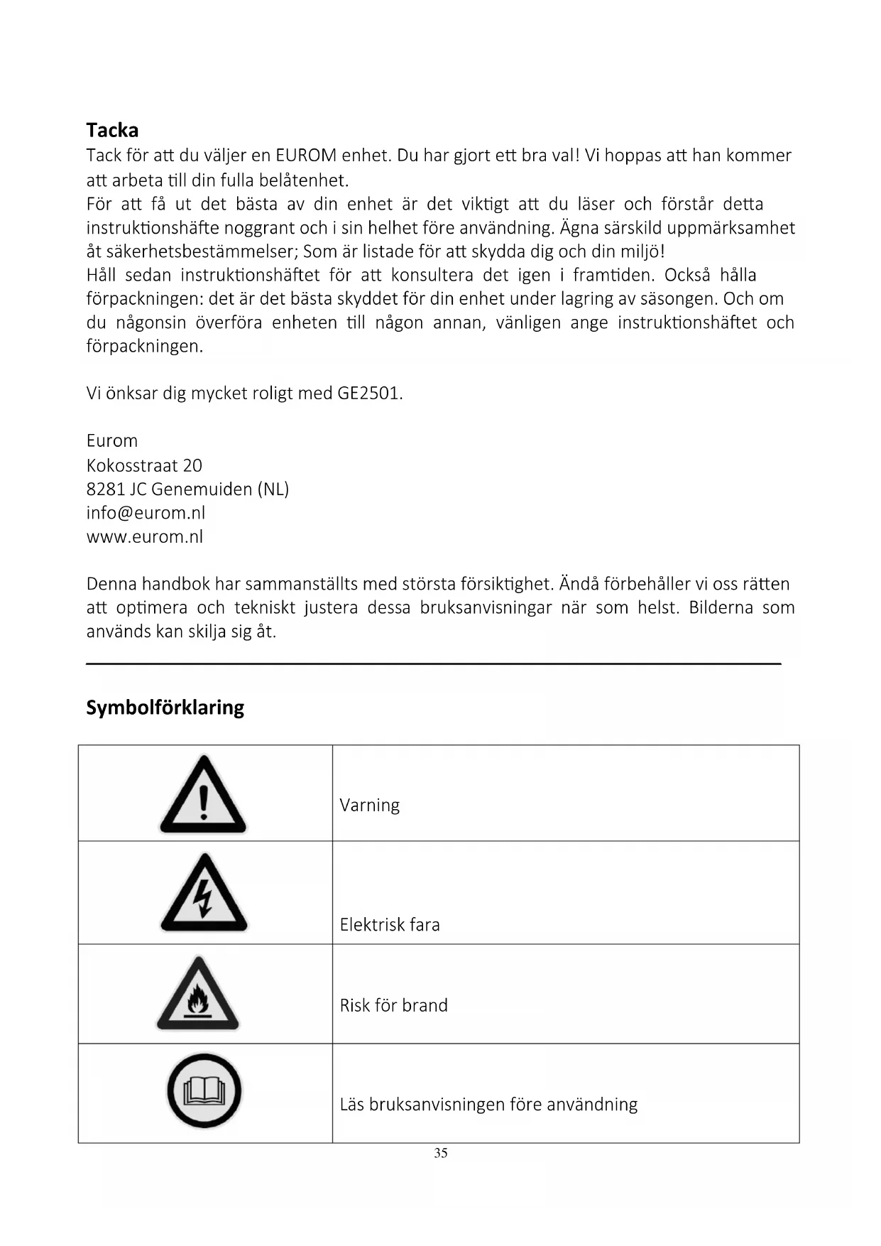 En fin de vie, mettez l'appareil au rebut conformément aux lois et réglementations locales ou confiez l'appareil à votre fournisseur. Pièces jointes Un aperçu des utilisations possibles et la déclaration de conformité UE se trouve à la fin de ce manuel.35 Tacka Tack för att du väljer en EUROM enhet. Du har gjort ett bra val! Vi hoppas att han kommer att arbeta till din fulla belåtenhet. För att få ut det bästa av din enhet är det viktigt att du läser och förstår detta instruktionshäfte noggrant och i sin helhet före användning. Ägna särskild uppmärksamhet åt säkerhetsbestämmelser; Som är listade för att skydda dig och din miljö! Håll sedan instruktionshäftet för att konsultera det igen i framtiden. Också hålla förpackningen: det är det bästa skyddet för din enhet under lagring av säsongen. Och om du någonsin överföra enheten till någon annan, vänligen ange instruktionshäftet och förpackningen. Vi önksar dig mycket roligt med GE2501. Eurom Kokosstraat 20 8281 JC Genemuiden (NL) info@eurom.nl www.eurom.nl Denna handbok har sammanställts med största försiktighet. Ändå förbehåller vi oss rätten att optimera och tekniskt justera dessa bruksanvisningar när som helst. Bilderna som används kan skilja sig åt.