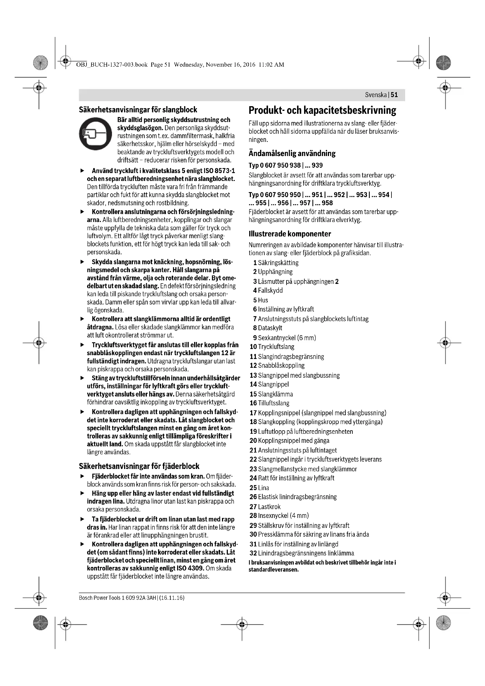- Vid inställning av gränslasten använd skyddshandskar och håll stadigt i sexkantnyckeln. Vid maximal gränslast- inställning är ställanordningen utsatt för hög spänning som plötsligt avspänns när sexkantnyckeln trycks in. Sätt in sexkantnyckeln 9 i fjäderhacket på gränslastinställ- ningen 6. För att minska återgångskraften, tryck in fjäderhacket och vrid sexkantnyckeln 9 moturs. För att öka återgångskraften, tryck fjäderhacket in och vrid sexkantnyckeln 9 medurs. – Vid typ 0 607 950 957 högst 11 varv. – Vid typ 0 607 950 958 högst 5 varv. Underhåll och service Underhåll och rengöring Slangblock Stäng av tryckluftstillförseln innan underhållsåtgärder utförs, inställningar för lyftkraft görs eller tryckluft- verktyget ansluts eller hängs av. Denna säkerhetsåtgärd förhindrar oavsiktlig inkoppling av tryckluftsverktyget. Kontrollera dagligen att upphängningen och fallskyd- det inte korroderat eller skadats. Låt slangblocket och speciellt tryckluftslangen minst en gång om året kon- trolleras av sakkunnig enligt tillämpliga föreskrifter i aktuellt land. Om skada uppstått får slangblocket inte längre användas. OBJ_BUCH-1327-003.book Page 54 Wednesday, November 16, 2016 11:02 AMNorsk | 55 Bosch Power Tools 1 609 92A 3AH | (16.11.16) Smörj med fett alla rörliga delar på utsidan som t.ex. friktions- ställen på upphängningen 2 och fallskyddet 4. Rengör regelbundet filtret i slangblockets luftintag. Skruva bort slangnippeln 14 och avlägsna damm- och smutspartik- larna från filtret. Skruva sedan åter fast slangnippeln. För att undvika skada på tryckluftverktygets invändiga ventil- delar ska vid in- och urskruvning av slangnippeln 14 på luftin- tagets kopplingsstuts 7 hållas emot med en fast nyckel (nyck- elvidd 17 mm). Beakta de tillsatser till tryckluften som rekom- menderas i driftinstruktionen för i slangblocket upphängt tryckluftsverktyg! Fjäderblock Kontrollera dagligen att upphängningen och fallskyd- det (om sådant finns) inte korroderat eller skadats. Låt fjäderblocket och speciellt linan, minst en gång om året kontrolleras av sakkunnig enligt ISO 4309. Om skada uppstått får fjäderblocket inte längre användas. Smörj med fett alla rörliga delar på utsidan som t.ex. friktions- ställen på upphängningen 2 och fallskyddet 4. Livslängden på linan ökar om den smörjas med syrafritt fett (vaselin). Tillbehör Detaljerad information på tillbehörsprogrammet hittar du i Internet under www.bosch-pt.com och www.boschproductiontools.com eller hos din återförsäljare. Kundtjänst och användarrådgivning Kundservicen ger svar på frågor beträffande reparation och underhåll av produkter och reservdelar. Sprängskisser och information om reservdelar hittar du på: www.bosch-pt.com Bosch användarrådgivningsteamet hjälper gärna vid frågor som gäller våra produkter och tillbehör. Ange alltid vid förfrågningar och reservdelsbeställningar det 10-siffriga produktnumret som finns på produktens typskylt. Svenska Bosch Service Center Telegrafvej 3 2750 Ballerup Danmark Tel.: (08) 7501820 (inom Sverige) Fax: (011) 187691 Avfallshantering Slang- och fjäderblock, tillbehör och förpackning bör återvin- nas på miljövänligt sätt. Hantera smörj- och rengöringsmedel på miljövänligt sätt. Beakta lagbestämmelserna. När slang- och fjäderblocket inte längre används, lämna in dem till ett återvinningscenter eller en återförsäljare, t.ex. en auktoriserad Bosch-servicestation. Ändringar förbehålles. Norsk Sikkerhetsinformasjon Les og følg alle instruksene. TA GODT VARE PÅ DISSE INSTRUKSENE. Slange- og fjærtaljene må kun installeres og vedlikehol- des av kvalifisert fagpersonale. Fagpersonalet må kjen- ne til farer som kan oppstå ved denne typen arbeid. Du må ikke installere slange- og fjærtaljer med kunst- stoffhus rett i nærheten av varmluftvifter. Du må aldri bruke slange- og fjærtaljer som leveres med en fallsikring 4 og en sikringskjede 1 uten disse. Isoler slange- og fjærtaljene elektrisk, hvis de brukes med sveisetenger. Installer slange- og fjærtaljen slik at betjeningsperso- nene ikke arbeider under svevende last. Når du trekker verktøyet i slange- eller fjærtaljen inn mot arbeidsstyk- ket, skal vinkelen være maksimalt 10°. Verktøy som er trukket ut i en større vinkel kan svinge frem og tilbake når de slippes og slik skade personer. Du må aldri overskride lasten som er angitt på typeskil- tet 8. Ved overbelastning er det fare for skader pga. last som faller ned. Ta aldri slange- eller fjærtaljen fra hverandre. Hvis hu- set åpnes kan fjæren inne i huset ødelegges og gjøre slan- ge- eller fjærtaljen ubrukelig. Skift slange- og fjærtaljen straks ut hvis den er falt ned! La en skadet slange- og fjærtalje repareres av et autorisert Bosch-verksted. Sikkerhetsinformasjon for slangetaljer Bruk personlig verneutstyr og husk alltid å bruke vernebriller. Bruk av personlig verne- utstyr som støvmaske, sklisikre vernesko, hjelm eller hørselvern – avhengig av type og bruk av trykkluftverktøyet –reduserer risikoen for skader. Bruk trykkluft i kvalitetsklasse 5 jf. ISO 8573-1 og en se- parat vedlikeholdsenhet nær slangetaljen. Den tilførte trykkluften må være fri for fremmedlegemer og fuktighet, for å beskytte slangetaljen mot skader, smuss og rustdannelse. Kontroller koplingene og tilførselsledningene. Samtlige vedlikeholdsenheter, koplinger og slanger må med hensyn til trykk og luftmengde være tilpasset til de tekniske data. For svakt trykk innskrenker slangetaljens funksjon, for høyt trykk kan føre til materielle skader og personskader. Beskytt slangene mot bretting, innsnevringer, løse- midler og skarpe kanter. Hold slangene unna varme, ol- je og roterende deler. Skift straks ut en skadet slange. En skadet tilførselsledning kan føre til en piskende trykk- luftslange og kan forårsake skader. Oppvirvlet støv eller spon kan føre til alvorlige 