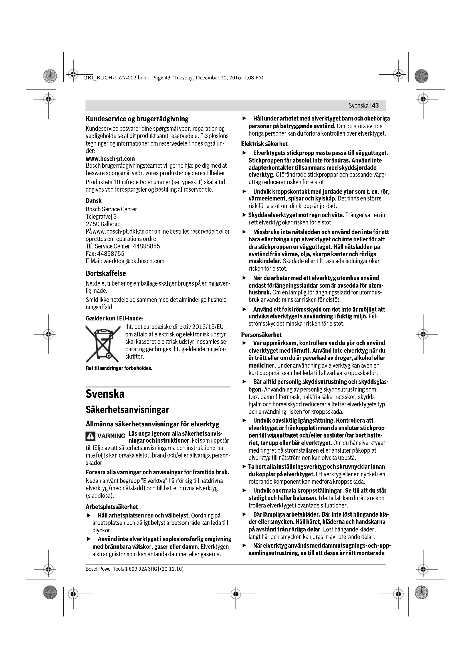 lbs 2,6 5,7 2,6 5,7 Skyddsklass /I /I OBJ_BUCH-1527-002.book Page 45 Tuesday, December 20, 2016 1:08 PM46 | Svenska 1 609 92A 3HG | (20.12.16) Bosch Power Tools Anslutning till energiförsörjning (se bild B) Kontrollera nätspänningen! Kontrollera att strömkällans spänning överensstämmer med uppgifterna på nätaggre- gatets typskylt. Använd vid anslutning av nätaggregatet till energiförsörj- ningen endast nätsladdar som är lämpliga för strömkällan. Byt vid behov ut standardmässigt medföljande nätsladd för jordat nätuttag mot en nätsladd som är anpassad till aktuell ström- källa. Se till att en rak elskruvdragare med tangentpådrag inte läggs mot tangenten innan nätaggregatet PUC-EXACT ansluts till strömnätet. Detta hindrar oavsiktlig start av skruvdraga- ren. Se till att en rak elskruvdragare med tryckpådrag inte trycks axiellt när nätaggregatet PUC-EXACT ansluts till ström- nätet. Detta hindrar oavsiktlig start av skruvdragaren. Anslut först stickproppen 9 på nätkabeln 5 till anslutnings- hylsdonet 10 på nätaggregatet PUC-EXACT. Nu kan PUC-EXACT kopplas till strömnätet genom att ansluta stick- proppen 11 till ett nätuttag med jorddon. Anslut först nätkabeln till nätaggregatet PUC-EXACT innan stickproppen 11 kopplas till nätuttaget, i annat fall finns risk för elstöt. Så här bryts energiförsörjningen Dra först stickproppen 11 ur vägguttaget. Dra sedan nätslad- dens anslutningskontakt 9 ur nätaggregatets anslutningshyls- don 10. Bryt alltid först förbindelsen till vägguttaget för att undvika elstöt. Drift Driftstart Till-/frånslag av nätaggregatet PUC-EXACT (se bild C) Nätaggregatet PUC-EXACT måste tas i drift innan elverktyget C-EXACT kan kopplas på (se ”Anslutning till energiförsörj- ning”, sidan 46). För att sätta på elkontakten trycker du på strömbrytaren 2 på elkontakten till läge 1. Den gröna lysdioden 3 visar att elkontakten är redo att använ- das. PUC-EXACT 1: om lysdioden 4 lyser föreligger ett fel. Tryck för frånkoppling av nätaggregatet strömställaren på nätaggregatet 2 till läget 0. För att spara energi, slå endast på elkontakten när du använ- der den. Till-/frånslag av elverktyget Raka elskruvdragare med pådrag (se bild D) För inkoppling av elverktyget tryck strömställaren Till/Från 2 mot stopp. Elverktyget slår automatiskt från så fort inställt vridmoment uppnåtts. Om strömställaren Till/Från 2 släpps för tidigt uppnås inte förinställt vridmoment. Raka elskruvdragare med tryckkoppling För inkoppling lägg elverktyget mot skruven och tryck skruv- dragaren lätt i axiell riktning. Elverktyget slår automatiskt från så fort inställt vridmoment uppnåtts. Vid för tidig avlastning av skruvdragaren, t.ex. när skruvdragarens insatsverktyg slirar av skruven, upp- nås inte förinställt vridmoment. Arbetsanvisningar Se till att nätaggregatet under arbetet inte oavsiktligt dras ner från arbetsbordet. Sätt stadigt fast nätaggregatet antingen på väggen eller dra anslutningskabeln så att man inte snavar över den. Överbelastningsskydd (PUC-EXACT 1) När nätaggregatet överbelastas tänds lysdioden 4 och signa- lerar en störning. Avbryt arbetet. Koppla från skruvdragaren och nätaggrega- tet. Kontrollera skruvdragaren och apparatkabeln. Byt ut defekta delar. Återinkoppla nätaggregatet och skruvdragaren. Om lysdioden 4 fortfarande lyser är nätaggregatet defekt. Låt den repareras i en auktoriserad serviceverkstad för Bosch elverktyg. Underhåll och service Underhåll och rengöring Ta bort nätaggregatet PUC-EXACT från nätet före ren- göring av skruvdragaren. Härvid undviks risken för en elstöt. Det räcker inte med att bara frånkoppla nätaggrega- tet. Nätaggregatet är underhållsfritt. Håll apparaten och ventila- tionsslitsarna fria och rena. Bryt strömmen till nätaggregatet och rengör regelbundet anslutningshylsor, kopplingar och stickproppar med en torr, luddfri trasa och avlägsna damm- och smutspartiklar. Om nätsladden för bibehållande av verktygets säkerhet måste bytas ut, ska byte ske hos Bosch eller en auktoriserad serviceverkstad för Bosch-elverktyg. Låt endast kvalificerad fackpersonal utföra underhåll och reparationer. Detta garanterar att nätaggregatets säkerhet upprätthålls. En auktoriserad Bosch-servicestation kan snabbt och tillför- litligt utföra dessa arbeten. Hantera smörj- och rengöringsmedel på miljövänligt sätt. Beakta lagbestämmelserna. Tillbehör Detaljerad information på tillbehörsprogrammet hittar du i Internet under www.bosch-pt.com och www.boschproductiontools.com eller hos din återförsäljare. OBJ_BUCH-1527-002.book Page 46 Tuesday, December 20, 2016 1:08 PMNorsk | 47 Bosch Power Tools 1 609 92A 3HG | (20.12.16) Kundtjänst och användarrådgivning Kundservicen ger svar på frågor beträffande reparation och underhåll av produkter och reservdelar. Sprängskisser och information om reservdelar hittar du på: www.bosch-pt.com Bosch användarrådgivningsteamet hjälper gärna vid frågor som gäller våra produkter och tillbehör. Ange alltid vid förfrågningar och reservdelsbeställningar det 10-siffriga produktnumret som finns på produktens typskylt. Svenska Bosch Service Center Telegrafvej 3 2750 Ballerup Danmark Tel.: (08) 7501820 (inom Sverige) Fax: (011) 187691 Avfallshantering Nätaggregat, tillbehör och förpackning ska omhändertas på miljövänligt sätt för återvinning. Släng inte nätaggregatet i hushållsavfall! Endast för EU-länder: Enligt europeiska direktivet 2012/19/EU för kasserade elektriska och elektroniska appa- rater och dess modifiering till nationell rätt måste obrukbara elverktyg omhändertas separat och på miljövänligt sätt lämnas in för återvinning. Ändringar förbehålles. Norsk Sikkerhetsinformasjon Generelle advarsler for elektroverktøy Les gjennom alle advarslene og anvis- ningene. Feil ved overholdelsen av ad- varslene og nedenståen