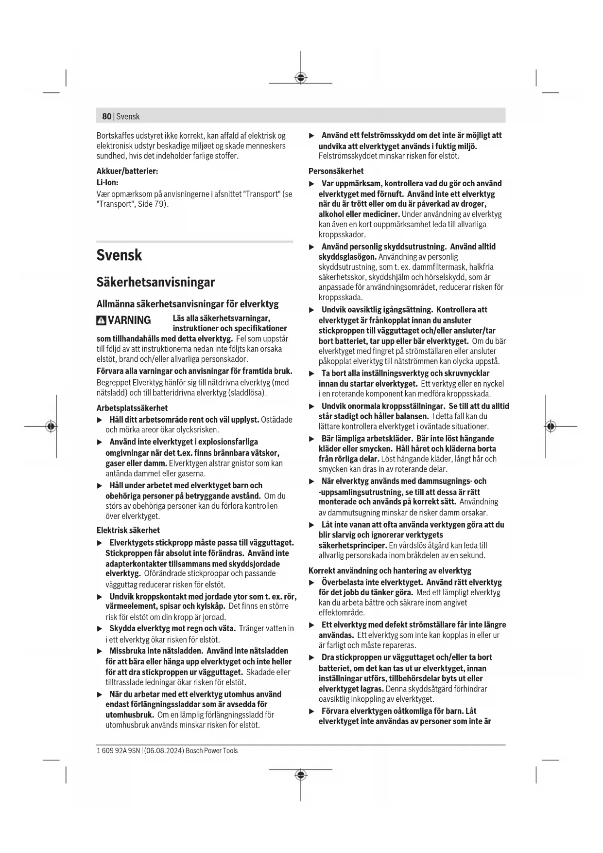 Til markering af individuelt indstillede drejningsmomenter kan du udskifte markeringsringen(17) med en markerings- ring i en anden farve. – Tryk markeringsringen(17) af med en tynd skruetrækker- klinge, en spartel eller lignende. Tænd/sluk Skruemaskinerne har en momentafhængig frakoblingsanordning, som kan indstilles i det angivne område. Den aktiveres, når det indstil- lede drejningsmoment er nået. – For at tænde el-værktøjet skal du trykke tænd/sluk- kontakten(10) indtil anslaget. – El-værktøjet slukkes automatisk, så snart det indstillede drejningsmoment er nået. u Hvis tænd/sluk-kontakten(10) slippes for tidligt, nås det forindstillede drejningsmoment ikke. u Kontrollér regelmæssigt tilspændingsmomentet på skrueforbindelsen, og juster om nødvendigt lukkekob- lingen. Tænding af arbejdslys Med arbejdslyset (13) er det muligt at oplyse skruestedet ved dårlige lysforhold. Du tænder arbejdslyset (13) ved at trykke let på tænd/sluk-knappen (10). Hvis du trykker hår- 1 609 92A 9SN | (06.08.2024) Bosch Power ToolsDansk | 79 dere på tænd/sluk-knappen, tændes el-værktøjet, og ar- bejdslyset lyser fortsat. u Se ikke direkte ind i arbejdslyset, det kan blænde dig. Arbejdsvejledning u Sæt kun el-værktøjet på møtrikken/skruen i slukket tilstand. Roterende indsatsværktøjer kan skride. Visning af forskruninger (grøn/rød lysdiode) Når det forindstillede drejningsmoment er nået, udløses frakoblingsanordningen. LED-visningen (7) lyser grønt. Hvis det forindstillede drejningsmoment ikke er nået, begyn- der LED-visningen (7) at lyse rødt, og der høres et akustisk signal. Forskruningen skal udføres en gang til. Gentagelsesbeskyttelse Når frakoblingsanordningen udløses ved en forskruning, ud- kobles motoren. En genindkobling er først mulig efter 0,7 se- kunders pause. Derved undgår du en utilsigtet efterspæn- ding af forskruninger, der allerede er tilspændt. Vedligeholdelse og service Vedligeholdelse og rengøring u Tag akkuen ud af el-værktøjet, før du udfører arbejde på det (f.eks.vedligeholdelse, værktøjsskift, etc.). Utilsigtet aktivering af tænd/sluk-knappen er forbundet med kvæstelsesfare. u El-værktøj og ventilationsåbninger skal altid holdes rene for at sikre et godt og sikkert arbejde. Smøring af el-værktøj Smøremiddel: Speciel gearfedt (225 ml) Varenummer 3 605 430 009 Molykotefedt Motorolie SAE 10/SAE 20 – Rengør gearet med et mildt opløsningsmiddel efter de første 150 driftstimer. Følg opløsningsmiddelproducen- tens anvisninger vedrørende brug og bortskaffelse. Smør derefter gearet med "Bosch-Spezial-Getriebefett" (gear- fedt). Gentag rengøringen for hver 300 driftstimer efter den første rengøring. – Smør frakoblingsanordningens bevægelige dele med nog- le dråber motorolie SAE 10/SAE 20 efter 100000 for- skruninger. Smør de glidende og rullende dele med moly- kotefedt. Kontrollér ved samme lejlighed koblingen for sli- tage for at sikre, at repeterbarheden og nøjagtigheden ik- ke påvirkes. Derefter skal koblingens drejningsmoment indstilles på ny. u Lad kun kvalificeret fagpersonale udføre vedligehol- delses- og reparationsarbejde. Dermed sikres størst mulig sikkerhed i forbindelse med el-værktøjet. Dette arbejde gennemføres hurtigt og pålideligt af en autori- seret Bosch-kundeservice. u Bortskaf smøre- og rengøringsmidlerne på en miljø- mæssigt forsvarlig måde. Vær opmærksom på lovens bestemmelser. u Kontrollér hele el-værktøjet for skader og slitage se- nest efter 100.000 skrueforbindelser, og kontrollér alle funktioner. Indstil derefter koblingens drejnings- moment igen. Kundeservice og anvendelsesrådgivning Kundeservice besvarer dine spørgsmål vedr. reparation og vedligeholdelse af dit produkt samt reservedele. Reserve- delstegninger og informationer om reservedele findes også under: www.bosch-pt.com Bosch-kunderådgivningsteamet hjælper dig gerne, hvis du har spørgsmål til vores produkter og tilbehørsdele. Produktets 10‑cifrede varenummer (se typeskilt) skal altid angives ved forespørgsler og bestilling af reservedele. Dansk Bosch Service Center Telegrafvej 3 2750 Ballerup På www.bosch-pt.dk kan der online bestilles reservedele el- ler oprettes en reparations ordre. Tlf. Service Center: 44898855 Fax: 44898755 E-Mail: vaerktoej@dk.bosch.com Yderligere serviceadresser findes under: www.bosch-pt.com/serviceaddresses Transport De anbefalede Li-Ion-akkuer overholder bestemmelserne om farligt gods. Akkuerne kan transporteres af brugeren på of- fentlig vej uden yderligere pålæg. Ved forsendelse gennem tredjemand (f.eks.: lufttransport el- ler spedition) skal særlige krav vedr. emballage og mærkning overholdes. Her skal man kontakte en faregodsekspert, før forsendelsesstykket forberedes. Send kun akkuer, hvis huset er ubeskadiget. Tilklæb åbne kontakter og indpak akkuen på en sådan måde, at den ikke kan bevæge sig i emballagen. Eventuelle mere vidtgående nationale forskrifter skal også overholdes. Bortskaffelse El-værktøj, akku, tilbehør og emballage skal genbruges på en miljøvenlig måde. Smid ikke el-værktøj og akkuer/batterier ud sammen med det almindelige husholdningsaf- fald! Gælder kun i EU‑lande: Udtjent el-værktøj og defekte eller udtjente akkuer/batterier skal bortskaffes separat. Brug det gældende afleveringssy- stem. Bosch Power Tools 1 609 92A 9SN | (06.08.2024)80 | Svensk Bortskaffes udstyret ikke korrekt, kan affald af elektrisk og elektronisk udstyr beskadige miljøet og skade menneskers sundhed, hvis det indeholder farlige stoffer. Akkuer/batterier: Li-Ion: Vær opmærksom på anvisningerne i afsnittet "Transport" (se "Transport", Side79). Svensk Säkerhetsanvisningar Allmänna säkerhetsanvisningar för elverktyg VARNING Läs alla säkerhetsvarningar, instruktioner och specifikationer som tillhandahålls med detta elverktyg. Fel som uppstår till följd av att instruktionerna nedan inte följts kan orsaka elstöt, brand och/el