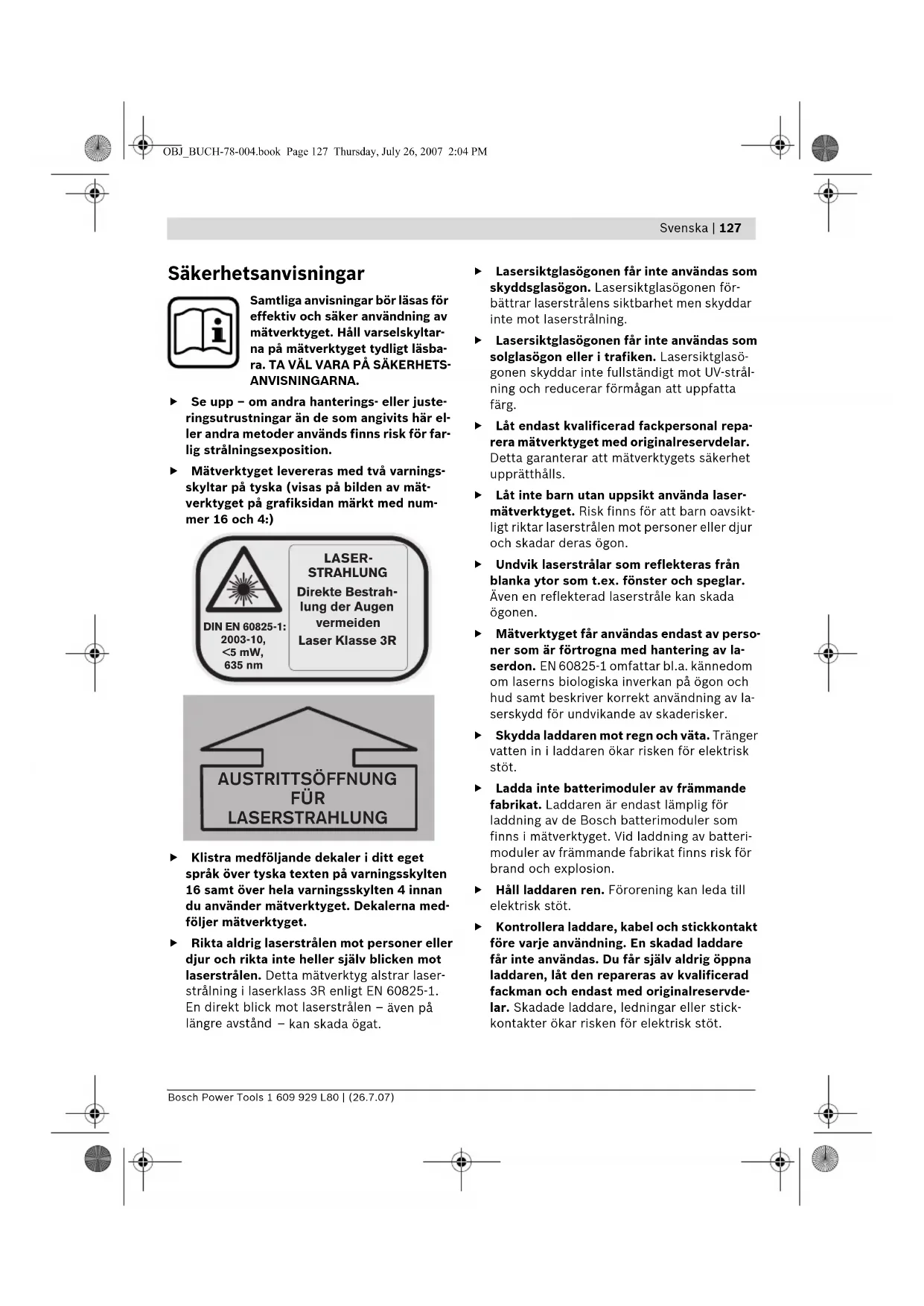 Säkerhetsanvisningar Samtliga anvisningar bör läsas för effektiv och säker användning av mätverktyget. Håll varselskyltar- na på mätverktyget tydligt läsba- ra. TA VÄL VARA PÅ SÄKERHETS- ANVISNINGARNA. f Se upp – om andra hanterings- eller juste- ringsutrustningar än de som angivits här el- ler andra metoder används finns risk för far- lig strålningsexposition. f Mätverktyget levereras med två varnings- skyltar på tyska (visas på bilden av mät- verktyget på grafiksidan märkt med num- mer 16 och 4:) f Klistra medföljande dekaler i ditt eget språk över tyska texten på varningsskylten 16 samt över hela varningsskylten 4 innan du använder mätverktyget. Dekalerna med- följer mätverktyget. f Rikta aldrig laserstrålen mot personer eller djur och rikta inte heller själv blicken mot laserstrålen. Detta mätverktyg alstrar laser- strålning i laserklass 3R enligt EN 60825-1. En direkt blick mot laserstrålen – även på längre avstånd – kan skada ögat. f Lasersiktglasögonen får inte användas som skyddsglasögon. Lasersiktglasögonen för- bättrar laserstrålens siktbarhet men skyddar inte mot laserstrålning. f Lasersiktglasögonen får inte användas som solglasögon eller i trafiken. Lasersiktglasö- gonen skyddar inte fullständigt mot UV-strål- ning och reducerar förmågan att uppfatta färg. f Låt endast kvalificerad fackpersonal repa- rera mätverktyget med originalreservdelar. Detta garanterar att mätverktygets säkerhet upprätthålls. f Låt inte barn utan uppsikt använda laser- mätverktyget. Risk finns för att barn oavsikt- ligt riktar laserstrålen mot personer eller djur och skadar deras ögon. f Undvik laserstrålar som reflekteras från blanka ytor som t.ex. fönster och speglar. Även en reflekterad laserstråle kan skada ögonen. f Mätverktyget får användas endast av perso- ner som är förtrogna med hantering av la- serdon. EN 60825-1 omfattar bl.a. kännedom om laserns biologiska inverkan på ögon och hud samt beskriver korrekt användning av la- serskydd för undvikande av skaderisker. f Skydda laddaren mot regn och väta. Tränger vatten in i laddaren ökar risken för elektrisk stöt. f Ladda inte batterimoduler av främmande fabrikat. Laddaren är endast lämplig för laddning av de Bosch batterimoduler som finns i mätverktyget. Vid laddning av batteri- moduler av främmande fabrikat finns risk för brand och explosion. f Håll laddaren ren. Förorening kan leda till elektrisk stöt. f Kontrollera laddare, kabel och stickkontakt före varje användning. En skadad laddare får inte användas. Du får själv aldrig öppna laddaren, låt den repareras av kvalificerad fackman och endast med originalreservde- lar. Skadade laddare, ledningar eller stick- kontakter ökar risken för elektrisk stöt. DIN EN 60825-1:2003-10, <5 mW, 635 nm LASER- STRAHLUNG Direkte Bestrah- lung der Augen vermeiden Laser Klasse 3R AUSTRITTSÖFFNUNG FÜR LASERSTRAHLUNG OBJ_BUCH-78-004.book Page 127 Thursday, July 26, 2007 2:04 PM128 | Svenska 1 609 929 L80 | (26.7.07) Bosch Power Tools f Använd inte laddaren på lättantändligt un- derlag (t.ex. papper, textilier mm) resp. i brännbar omgivning. Vid laddningen värms laddaren upp vilket kan medföra brandrisk. f Om batteriet används på fel sätt finns risk för att vätska rinner ur batteriet. Undvik kontakt med vätskan. Vid oavsiktlig kontakt spola med vatten. Om vätska kommer i kon- takt med ögonen uppsök dessutom läkare. Batterivätskan kan medföra hudirritation och brännskada. Funktionsbeskrivning Fäll upp sidan med illustration av mätverktyget och håll sidan uppfälld när du läser bruksanvis- ningen. Ändamålsenlig användning Mätverktyget används för bestämning och kon- troll av exakta höjdförlopp, lodlinjer, fluktlinjer och lodpunkter utomhus och inomhus. Illustrerade komponenter Numreringen av komponenterna hänvisar till illustration av mätverktyget på grafiksidan. 1 Vattenpasslibell 2 Mottagningslins för fjärrstyrning 3 Hylsdon för laddkontakt 4 Varningsskylt utloppsöppning för laser- strålning 5 Utloppsöppning för laserstrålning 6 Markering av Y-axel 7 Markering av X-axel 8 Lodstråle 9 variabel laserstråle 10 Lodskåror X-axel 11 Lodskåror Y-axel 12 Spärr på batterifackets lock 13 Batterifackets lock 14 Gummifot 15 Batterimodul 16 Laservarningsskylt 17 Stativfäste 5/8" (horisontalt och vertikalt) 18 Serienummer 19 Knapp för linjefunktion och val av linjelängd 20 Riktningsknapp upp 21 Riktningsknapp vänster 22 Knapp för rotationsdrift och val av rotations- hastighet 23 Riktningsknapp ned 24 Riktningsknapp höger 25 Indikator manuell nivellering ”man” 26 Indikator automatisk nivellering ”auto” 27 Batteriladdningsindikator 28 Knapp ”man/auto” för frånkoppling av den automatiska nivelleringen 29 På-Av-knapp 30 Bygglaserns mätstav* 31 Lasersiktglasögon 32 Väggfäste/uppriktningsenhet* 33 5/8"-skruv på väggfästet* 34 Skruvar för uppriktningsenhet* 35 Mätplatta med fot 36 Takmätplatta* 37 Lutningskil* 38 Högeffektsmottagare med fäste 39 Fjärrmanövrering 40 Stativ* 41 Laddstickkontakt 42 Laddare 43 Väska *I bruksanvisningen avbildat och beskrivet tillbehör ingår inte standardleveransen. OBJ_BUCH-78-004.book Page 128 Thursday, July 26, 2007 2:04 PMSvenska | 129 Bosch Power Tools 1 609 929 L80 | (26.7.07) Tekniska data Bygglaser BL 200 GC Professional Produktnummer 3 601 K15 000 Arbetsområde (radie)