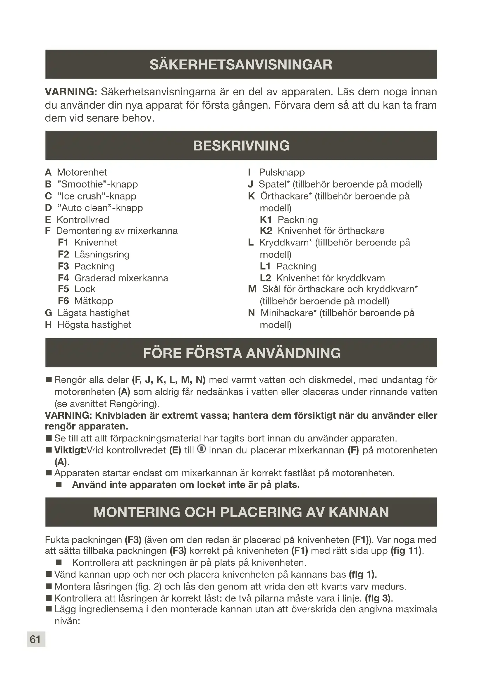 Rengör alla delar (F, J, K, L, M, N) med varmt vatten och diskmedel, med undantag för motorenheten (A) som aldrig får nedsänkas i vatten eller placeras under rinnande vatten (se avsnittet Rengöring). VARNING: Knivbladen är extremt vassa; hantera dem försiktigt när du använder eller rengör apparaten. Se till att allt förpackningsmaterial har tagits bort innan du använder apparaten. Viktigt:Vrid kontrollvredet (E) till innan du placerar mixerkannan (F) på motorenheten (A). Apparaten startar endast om mixerkannan är korrekt fastlåst på motorenheten. Använd inte apparaten om locket inte är på plats. BESKRIVNING A Motorenhet B ”Smoothie”-knapp C ”Ice crush”-knapp D ”Auto clean”-knapp E Kontrollvred F Demontering av mixerkanna F1 Knivenhet F2 Låsningsring F3 Packning F4 Graderad mixerkanna F5 Lock F6 Mätkopp G Lägsta hastighet H Högsta hastighet I Pulsknapp J Spatel* (tillbehör beroende på modell) K Örthackare* (tillbehör beroende på modell) K1 Packning K2 Knivenhet för örthackare L Kryddkvarn* (tillbehör beroende på modell) L1 Packning L2 Knivenhet för kryddkvarn M Skål för örthackare och kryddkvarn* (tillbehör beroende på modell) N Minihackare* (tillbehör beroende på modell)