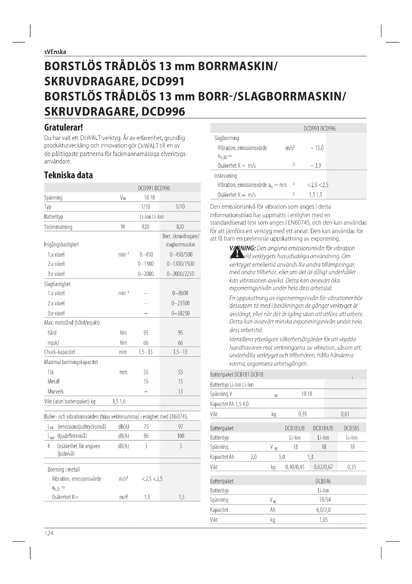 batteripaket. Dessa batteripaket kan användas: DCB181, DCB182, DCB183, DCB183B, DCB184, DCB184B, DCB185, DCB546. Se Tekniska Data för mer information. Förpackningsinnehåll Förpackningen innehåller: 1 Borstlös trådlös borrmaskin/skruvdragare (DCD991)131 sVEnska 1 Borstlös trådlös slagborrmaskin (DCD996) 1 Li-jon batteripaketet (M1, P1, T1) 2 Li-jon batteripaketet (M2, P2, T2) 3 Li-jon batteripaketet (M3, P3, T3) 1 Tool Connect™ Appinstruktionsmanual 1 Satslåda 1 Laddare 1 Sidohandtag 1 Instruktionshandbok LÄGG MÄRkE TILL: Batteripaket, laddare och förvaringslåda medföljer inte med N-modeller. Batteripaket och laddare medföljer inte NT-modeller. B-modeller inkluderar Bluetooth® batteripaket. OBsERVERa: Bluetooth® ordmärkningen och logotyper är registrerade varumärken som ägs av Bluetooth®, SIG, Inc. och all användning av sådan märkning av DeWALT sker under licens. Övriga varumärken och varumärkesnamn tillhör respektiveägare.