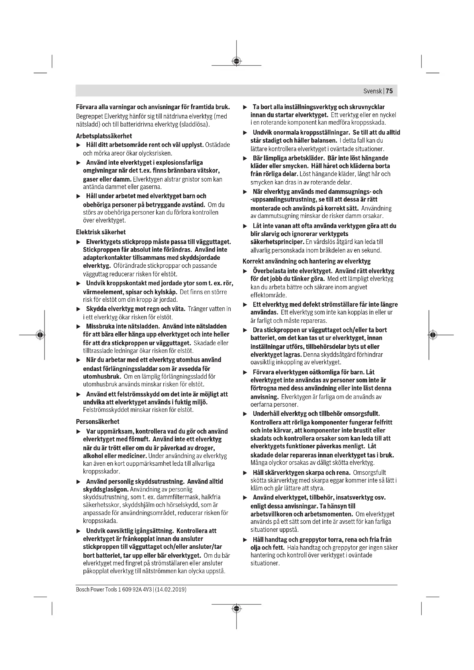 Den vibrationsnivå och det bullervärde som anges i dessa anvisningar har uppmätts enligt en mätmetod som normerats och kan användas för att jämföra elverktyg med varandra. Mätmetoden är även lämplig för preliminär bedömning av vibrations- och bullernivån. Den angivna vibrations- och bullernivån representerar den huvudsakliga användningen av elverktyget. Om däremot elverktyget används för andra ändamål, med andra insatsverktyg eller inte underhållits ordentligt kan vibrations- och bullernivån avvika. Då kan vibrations- och bullernivån under arbetsperioden öka betydligt under hela arbetstiden. För en exakt bedömning av vibrations- och bullernivån bör även de tider beaktas när elverktyget är avstängt eller är igång, men inte används. Detta reducerar vibrations- och bullerbelastningen för den totala arbetsperioden betydligt. Bestäm extra säkerhetsåtgärder för att skydda operatören mot vibrationernas inverkan t.ex.: underhåll av elverktyget och insatsverktygen, att hålla händerna varma, organisation av arbetsförloppen. Montage u Ta bort batteriet ur elverktyget innan åtgärder utförs på elverktyget (t.ex. underhåll, verktygsbyte) samt före transport och lagring. Om strömställaren Till/Från oavsiktligt påverkas finns risk för personskada. Leveransen omfattar Typ 0 602 490 437/ 0 602 490 471/ 0 602 490 447/