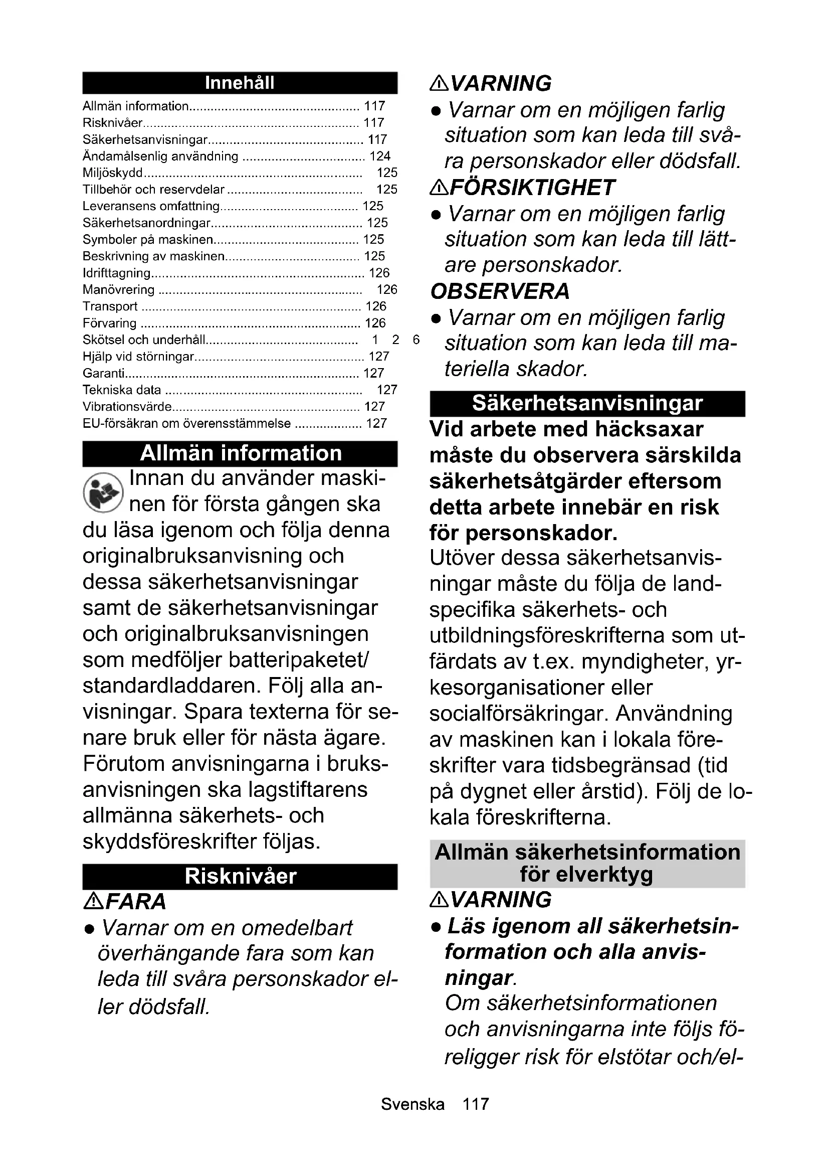 • Skjæreknivlengde mm 450 Vekt (uten batteripakke) kg 2,55 Chairman of the Board of ManagementDirector Regulatory Affairs & Certification H. Jenner S. ReiserSvenska 117 Innehåll Allmän information Innan du använder maski- nen för första gången ska du läsa igenom och följa denna originalbruksanvisning och dessa säkerhetsanvisningar samt de säkerhetsanvisningar och originalbruksanvisningen som medföljer batteripaketet/ standardladdaren. Följ alla an- visningar. Spara texterna för se- nare bruk eller för nästa ägare. Förutom anvisningarna i bruks- anvisningen ska lagstiftarens allmänna säkerhets- och skyddsföreskrifter följas. Risknivåer FARA ● Varnar om en omedelbart överhängande fara som kan leda till svåra personskador el- ler dödsfall. 몇 VARNING ● Varnar om en möjligen farlig situation som kan leda till svå- ra personskador eller dödsfall. 몇 FÖRSIKTIGHET ● Varnar om en möjligen farlig situation som kan leda till lätt- are personskador. OBSERVERA ● Varnar om en möjligen farlig situation som kan leda till ma- teriella skador. Säkerhetsanvisningar Vid arbete med häcksaxar måste du observera särskilda säkerhetsåtgärder eftersom detta arbete innebär en risk för personskador. Utöver dessa säkerhetsanvis- ningar måste du följa de land- specifika säkerhets- och utbildningsföreskrifterna som ut- färdats av t.ex. myndigheter, yr- kesorganisationer eller socialförsäkringar. Användning av maskinen kan i lokala före- skrifter vara tidsbegränsad (tid på dygnet eller årstid). Följ de lo- kala föreskrifterna. Allmän säkerhetsinformation för elverktyg 몇 VARNING ● Läs igenom all säkerhetsin- formation och alla anvis- ningar. Om säkerhetsinformationen och anvisningarna inte följs fö- religger risk för elstötar och/el- Allmän information p. 117