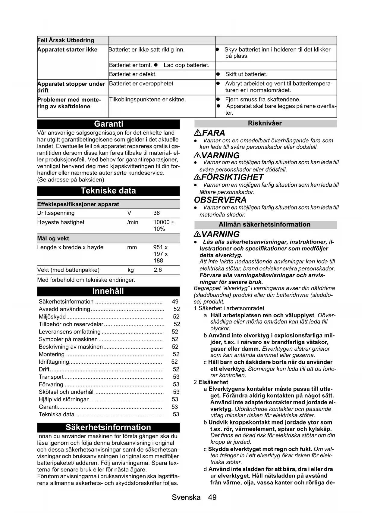 Figur I Bistand ved feil Feil har oftest enkle årsaker som du selv kan utbedre ved hjelp av følgende oversikt. I tvilstilfeller, eller ved driftsforstyrrelser som ikke er nevnt her, kan du kontakte vår autoriserte kundeservice. Batteripakkens kapasitet forringes ved tiltagende alder, også ved god pleie. Batteripakken vil derfor ikke oppnå full driftstid selv om den er helt oppladet. Dette er ikke en feil.Svenska 49 Garanti Vår ansvarlige salgsorganisasjon for det enkelte land har utgitt garantibetingelsene som gjelder i det aktuelle landet. Eventuelle feil på apparatet repareres gratis i ga- rantitiden dersom disse kan føres tilbake til material- el- ler produksjonsfeil. Ved behov for garantireparasjoner, vennligst henvend deg med kjøpskvitteringen til din for- handler eller nærmeste autoriserte kundeservice. (Se adresse på baksiden) Tekniske data Med forbehold om tekniske endringer. Innehåll Säkerhetsinformation Innan du använder maskinen för första gången ska du läsa igenom och följa denna bruksanvisning i original och dessa säkerhetsanvisningar samt de säkerhetsan- visningar och bruksanvisningen i original som medföljer batteripaketet/laddaren. Följ anvisningarna. Spara tex- terna för senare bruk eller för nästa ägare. Förutom anvisningarna i bruksanvisningen ska lagstifta- rens allmänna säkerhets- och skyddsföreskrifter följas. Risknivåer FARA ● Varnar om en omedelbart överhängande fara som kan leda till svåra personskador eller dödsfall. 몇 VARNING ● Varnar om en möjligen farlig situation som kan leda till svåra personskador eller dödsfall. 몇 FÖRSIKTIGHET ● Varnar om en möjligen farlig situation som kan leda till lättare personskador. OBSERVERA ● Varnar om en möjligen farlig situation som kan leda till materiella skador. Allmän säkerhetsinformation 몇 VARNING ● Läs alla säkerhetsanvisningar, instruktioner, il- lustrationer och specifikationer som medföljer detta elverktyg. Att inte iaktta nedanstående anvisningar kan leda till elektriska stötar, brand och/eller svåra personskador. Förvara alla varningshänvisningar och anvis- ningar för senare bruk. Begreppet ”elverktyg” i varningarna avser din nätdrivna (sladdbundna) produkt eller din batteridrivna (sladdlö- sa) produkt. 1 Säkerhet i arbetsområdet a Håll arbetsplatsen ren och välupplyst. Oöver- skådliga eller mörka områden kan lätt leda till olyckor. b Använd inte elverktyg i explosionsfarliga mil- jöer, t.ex. i närvaro av brandfarliga vätskor, gaser eller damm. Elverktygen alstrar gnistor som kan antända dammet eller gaserna. c Håll barn och åskådare borta när du använder ett elverktyg. Störningar kan leda till att du förlo- rar kontrollen. 2 Elsäkerhet a Elverktygens kontakter måste passa till utta- get. Förändra aldrig kontakten på något sätt. Använd inte adapterkontakter med jordade el- verktyg. Oförändrade kontakter och passande uttag minskar risken för elektriska stötar. b Undvik kroppskontakt med jordade ytor som t.ex. rör, värmeelement, spisar och kylskåp. Det finns en ökad risk för elektriska stötar om din kropp är jordad. c Skydda elverktyget mot regn och fukt. Om vat- ten tränger in i ett elverktyg ökar risken för elek- triska stötar. d Använd inte sladden för att bära, dra i eller dra ur elverktyget. Håll nätsladden på avstånd från värme, olja, vassa kanter och rörliga de- Feil Årsak Utbedring Apparatet starter ikke Batteriet er ikke satt riktig inn. Skyv batteriet inn i holderen til det klikker på plass. Batteriet er tomt. Lad opp batteriet. Batteriet er defekt. Skift ut batteriet. Apparatet stopper under drift Batteriet er overopphetet Avbryt arbeidet og vent til batteritempera- turen er i normalområdet. Problemer med monte- ring av skaftdelene Tilkoblingspunktene er skitne. Fjern smuss fra skaftendene. Apparatet skal bare legges på rene overfla- ter. Effektspesifikasjoner apparat Driftsspenning V 36 Høyeste hastighet /min 10000 ± 10% Mål og vekt Lengde x bredde x høyde mm 951 x 197 x